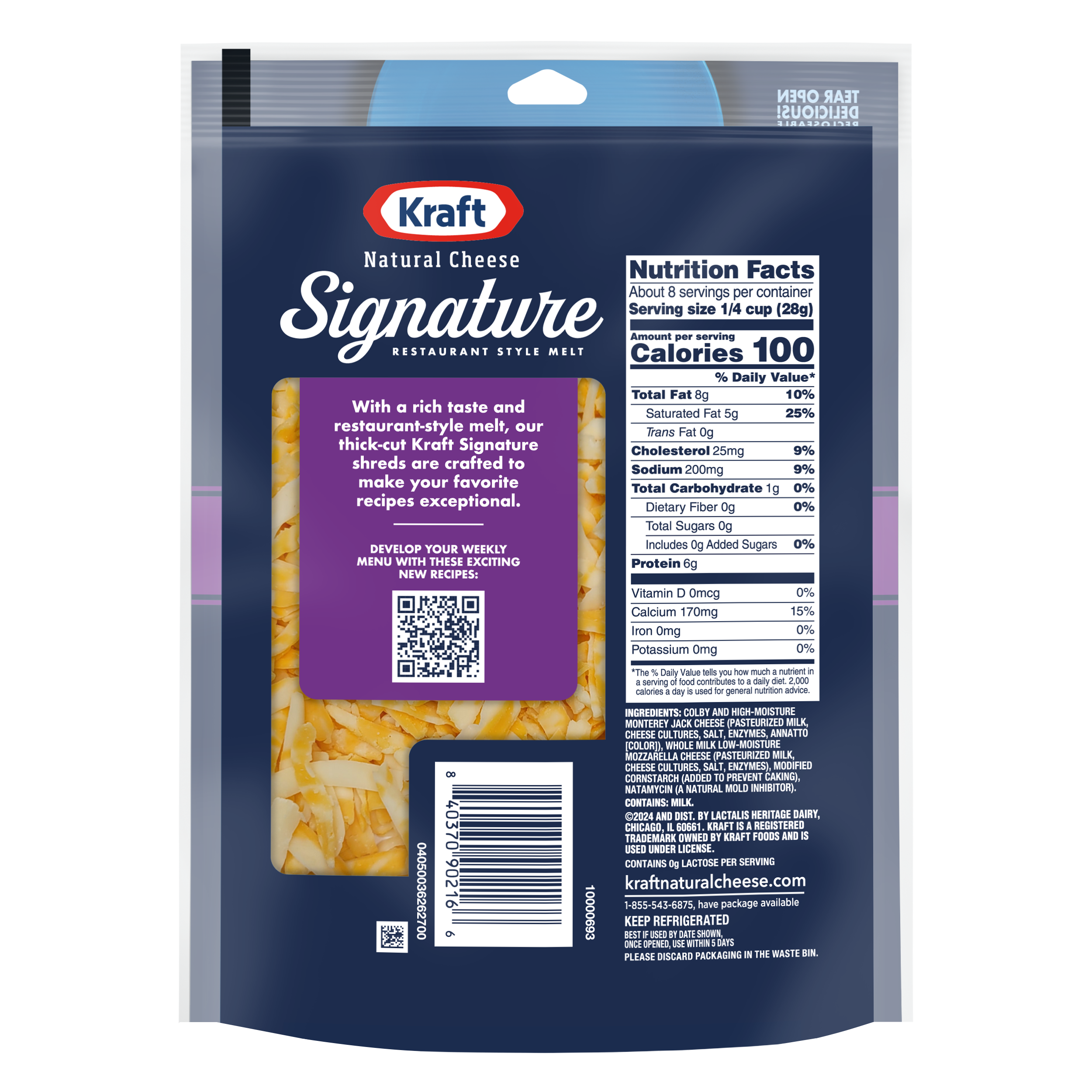 | Feature Bullet 2 | With Kraft Signature Cheddar Blend, you can create restaurant-style meals in a snap! The savory flavor of Cheddar and creamy Mozzarella blend together for the perfect combination of cheesy goodness. |