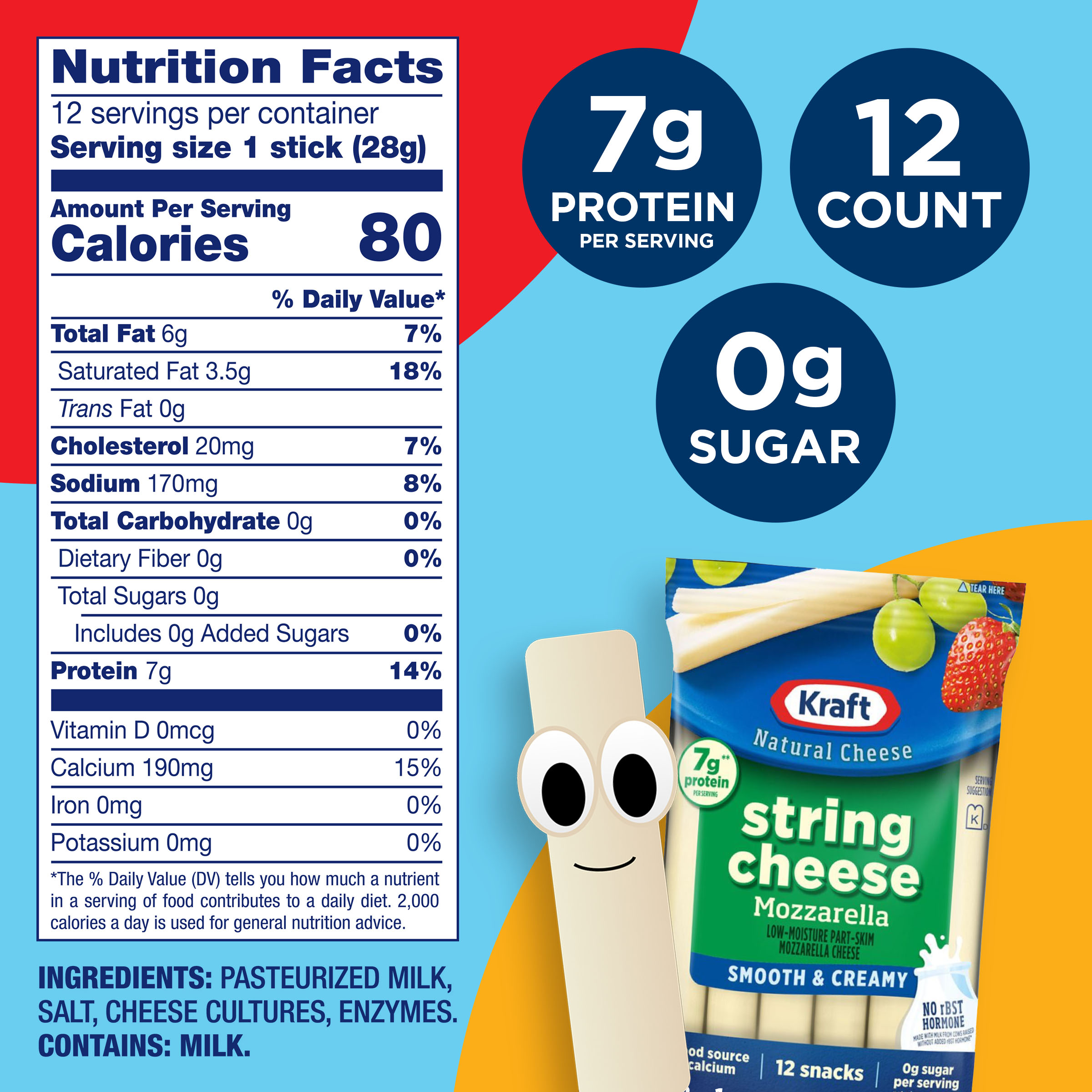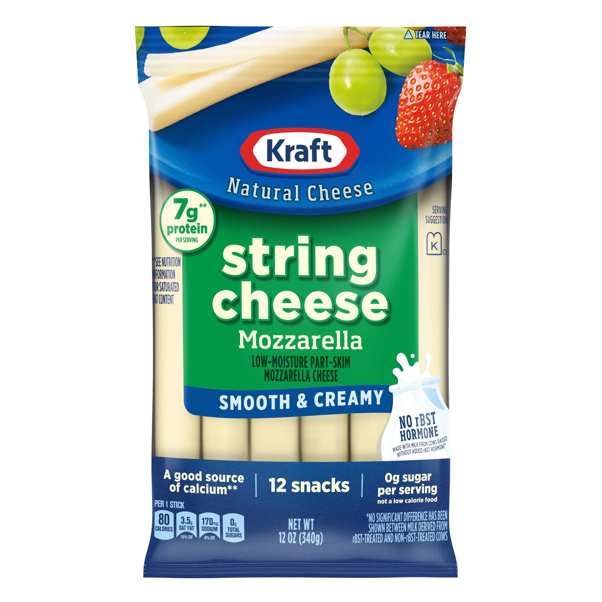 | Long Product Description | Kraft Natural Mozzarella String Cheese Sticks are a convenient snack to satisfy the cheese lovers in your family. Perfectly portioned, these low-moisture and part-skim mozzarella sticks are an easy way to add protein and calcium to your family's diet, see nutrition information for saturated fat content. Kraft mozzarella cheese is crafted from fresh pasteurized milk for quality and flavor, and each string cheese stick has 7 grams of protein. Keep a pack of Kraft String Cheese in the fridge for an easy after-school snack, or pop a mozzarella cheese stick in your lunch box for a delicious side. This 12 ounce pack includes 12 cheese sticks individually wrapped to help lock in flavor and for easy on-the-go use. |