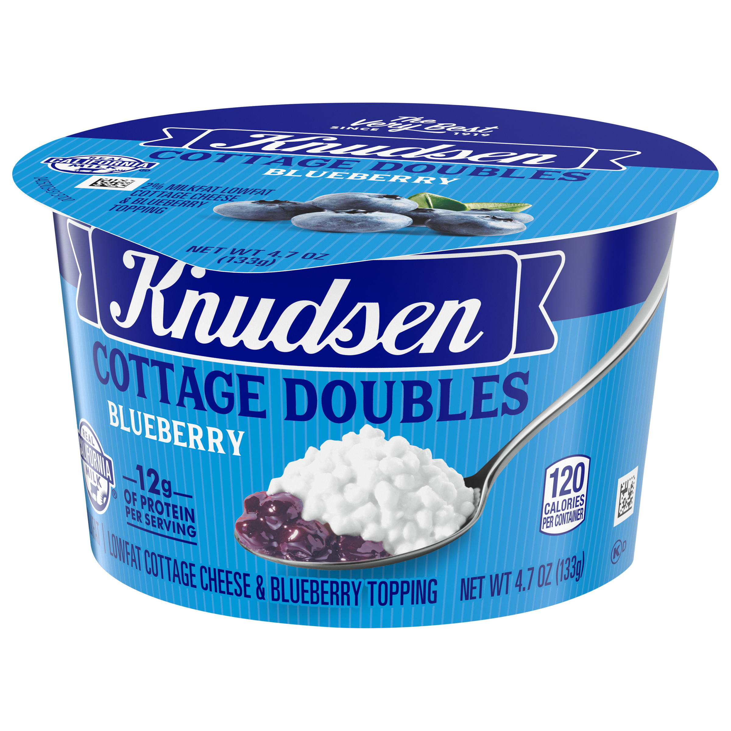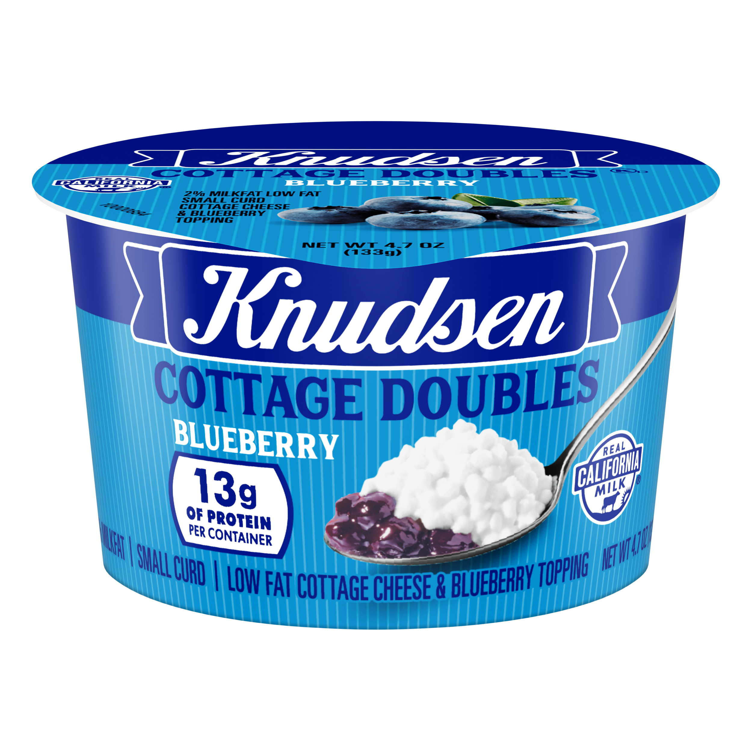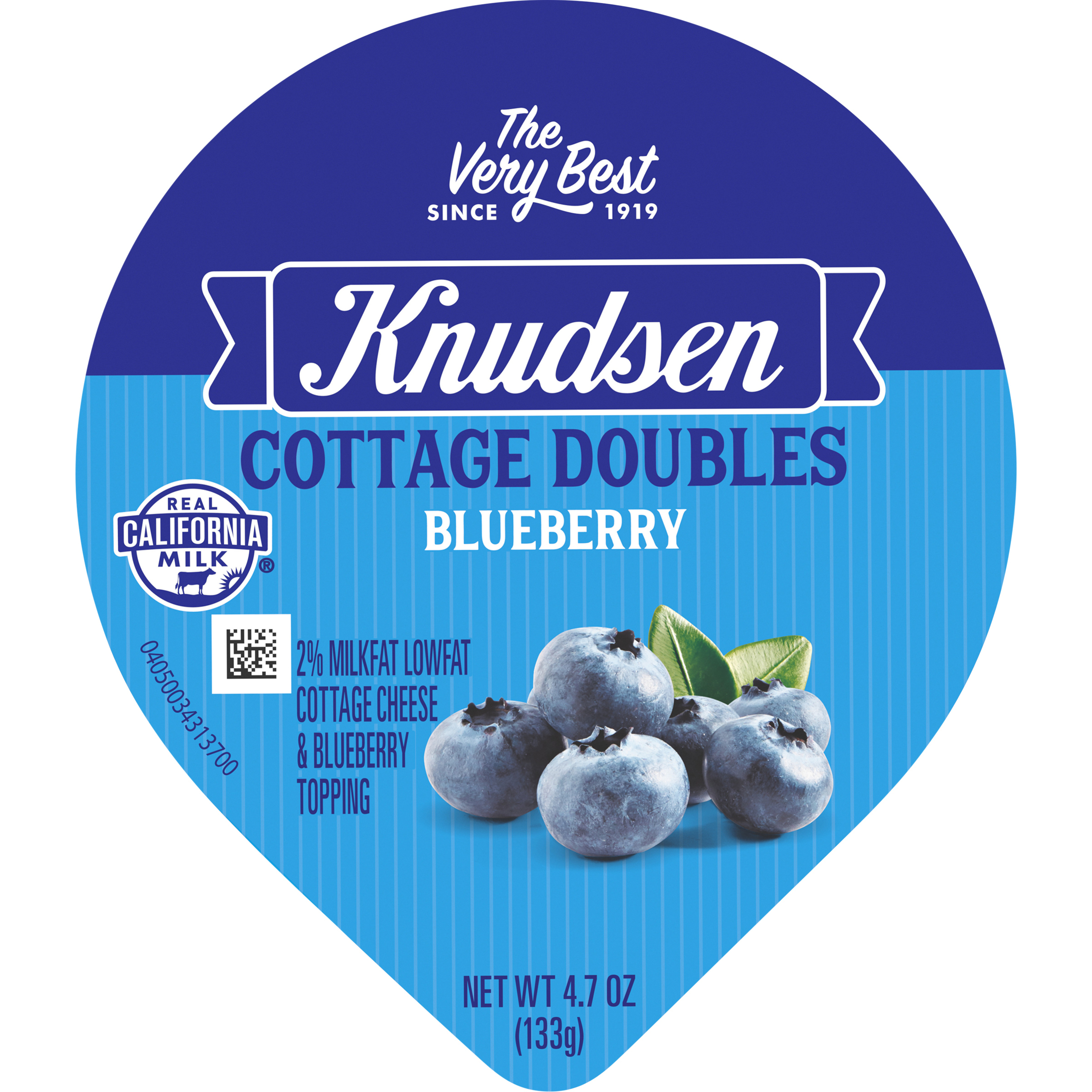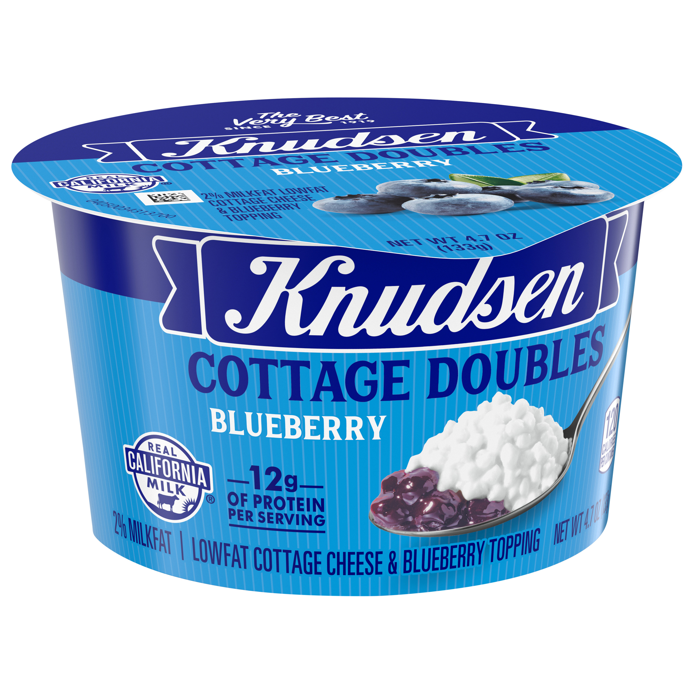 - Knudsen Cottage Doubles 2% Milkfat Low Fat Cottage Cheese & Blueberry Topping is creamy and delicious. These cottage cheese cups are easy to take on the go, providing a snack that can be enjoyed on its own or as a side dish for lunch. Generation after generation, Knudsen proudly continues the tradition of dairy expertise to offer you consistently delicious ingredients for memorable mealtimes.