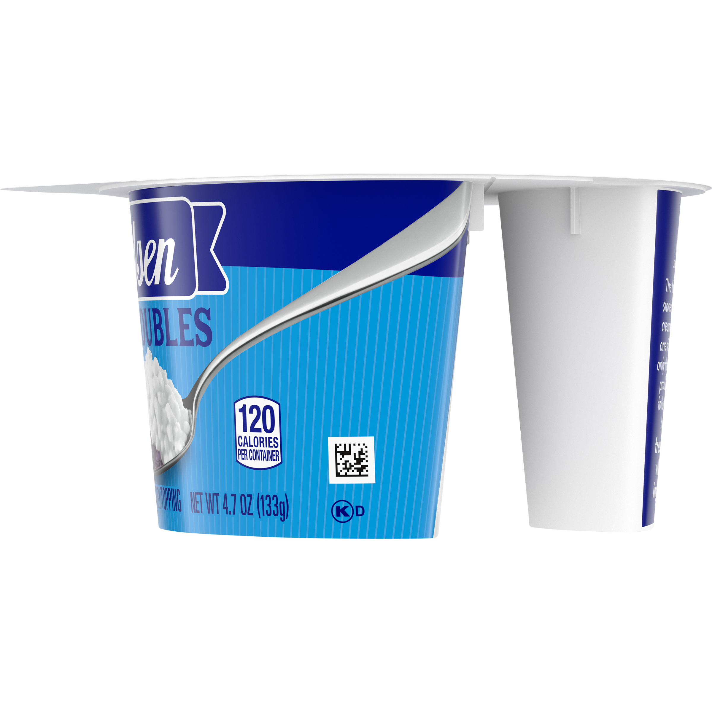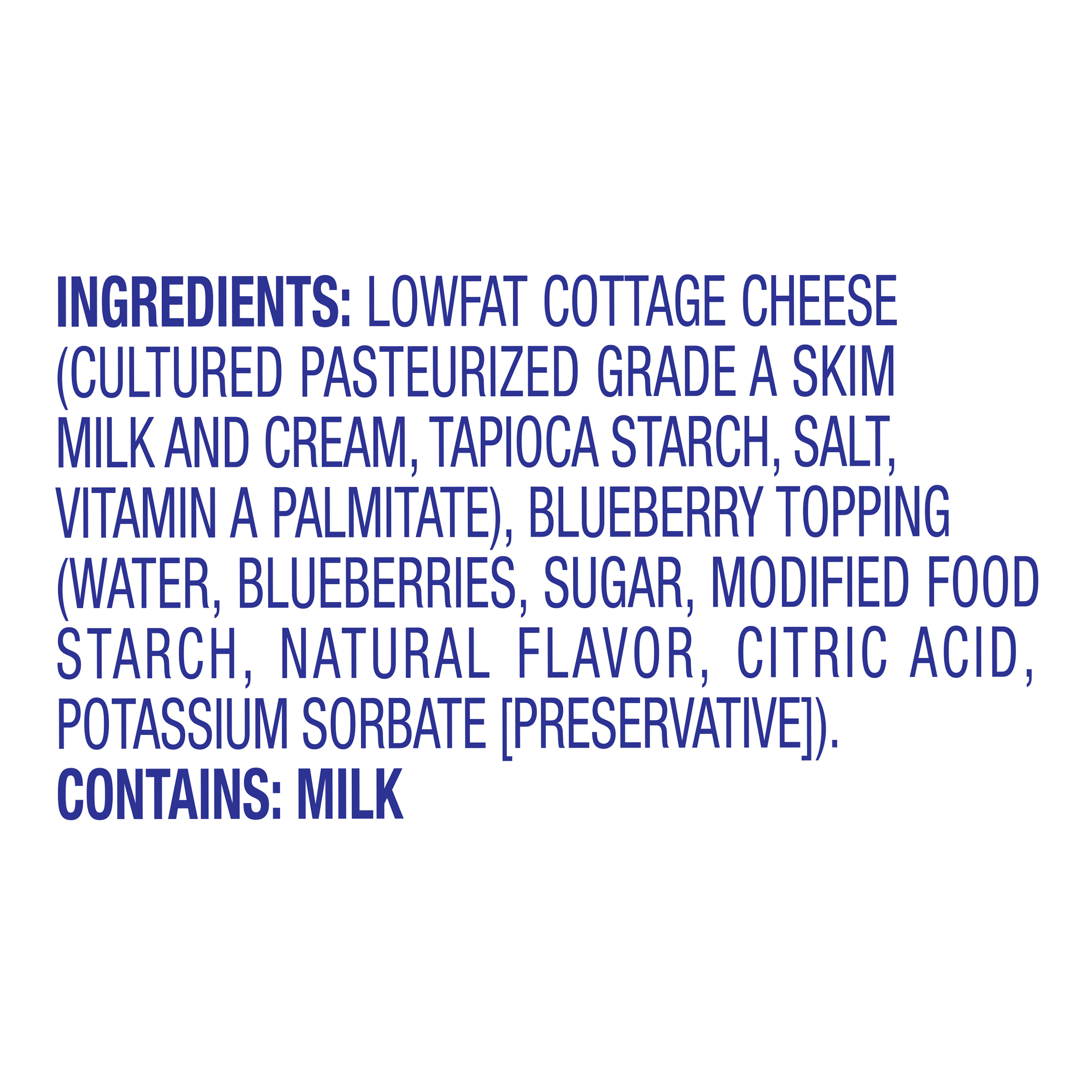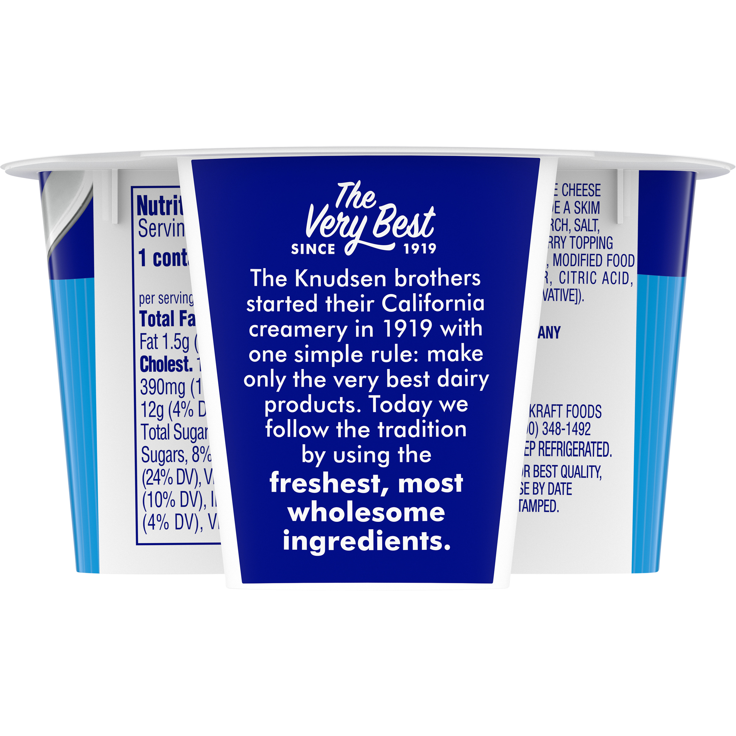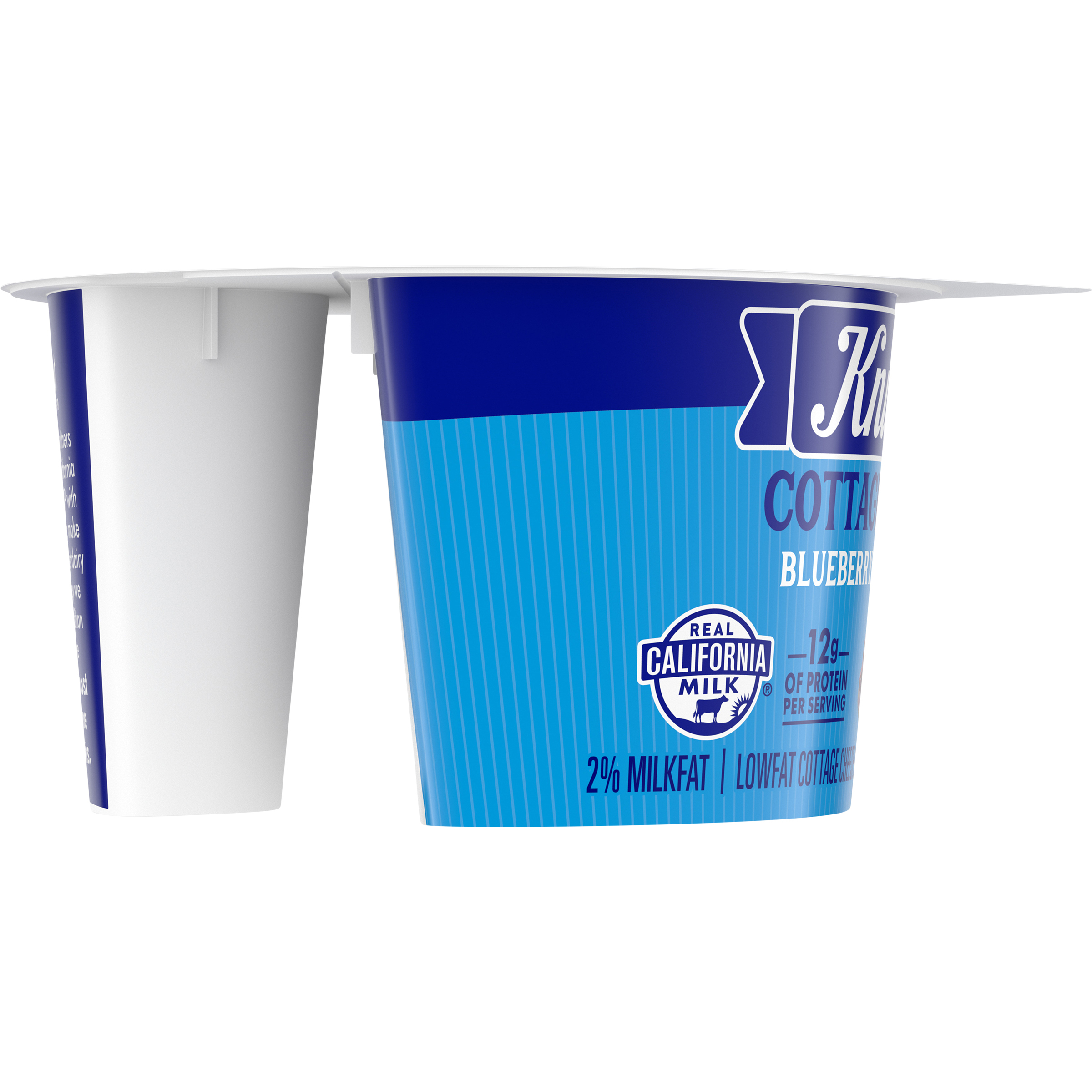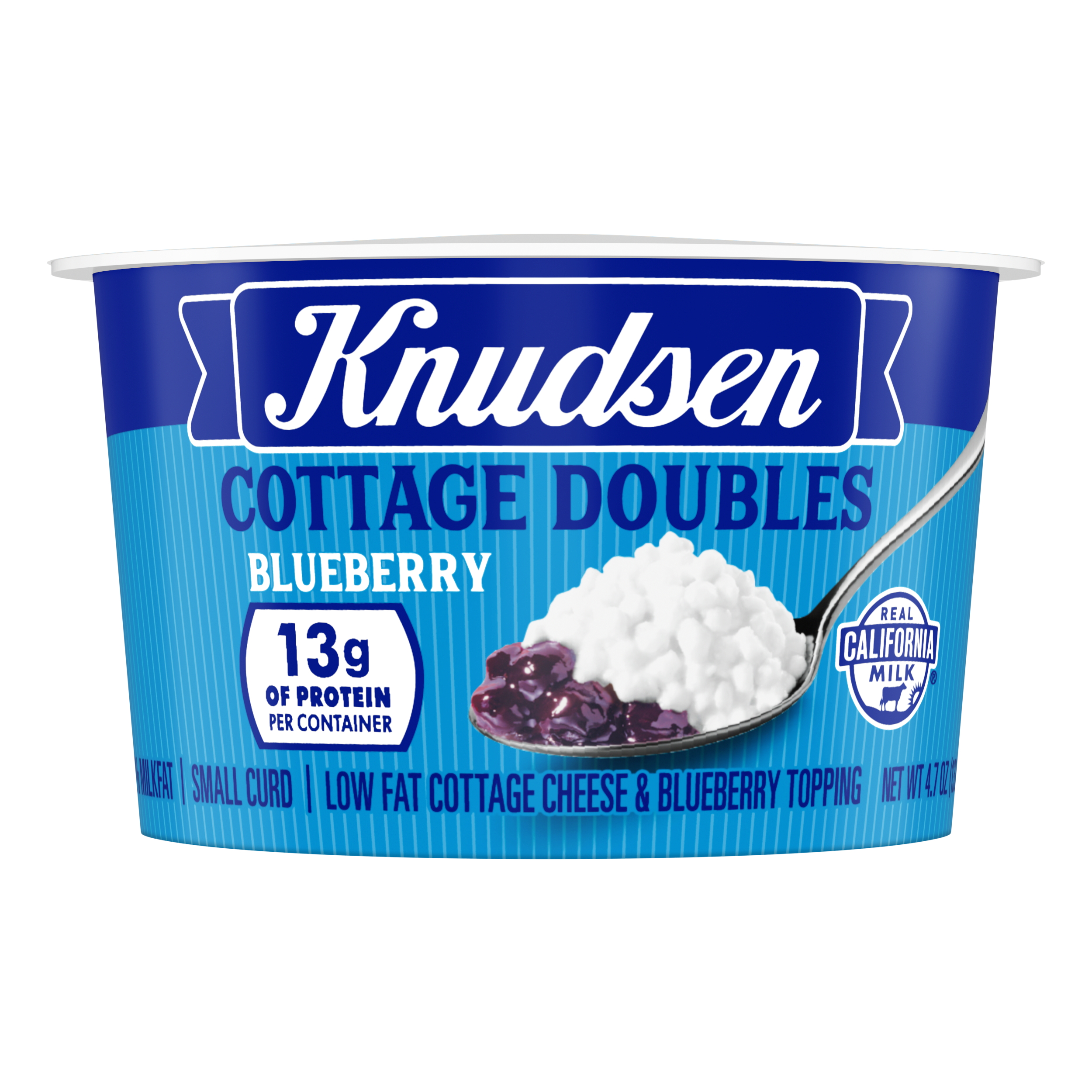 - Knudsen Cottage Doubles 2% Milkfat Low Fat Cottage Cheese & Blueberry Topping is creamy and delicious. These cottage cheese cups are easy to take on the go, providing a snack that can be enjoyed on its own or as a side dish for lunch. Generation after generation, Knudsen proudly continues the tradition of dairy expertise to offer you consistently delicious ingredients for memorable mealtimes.