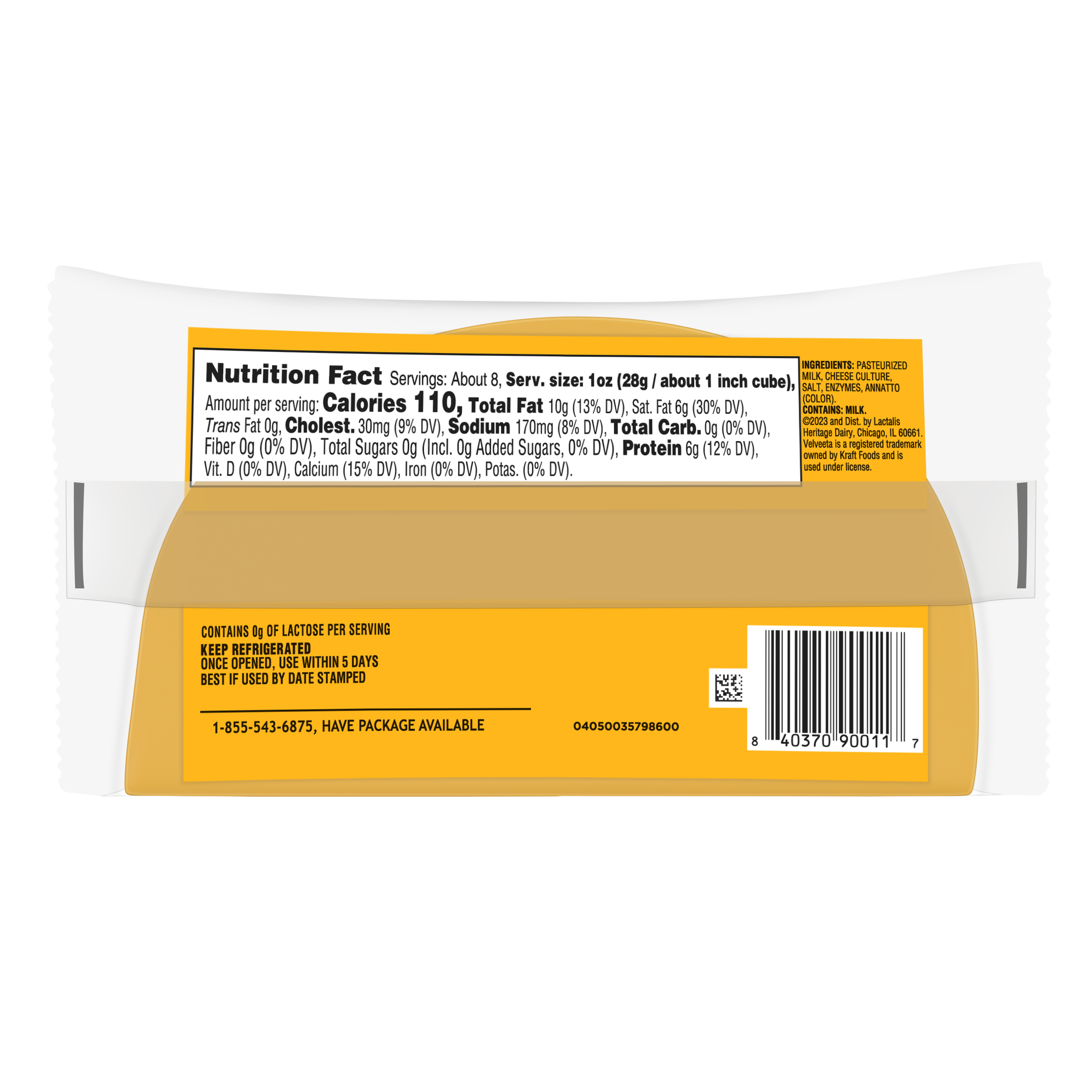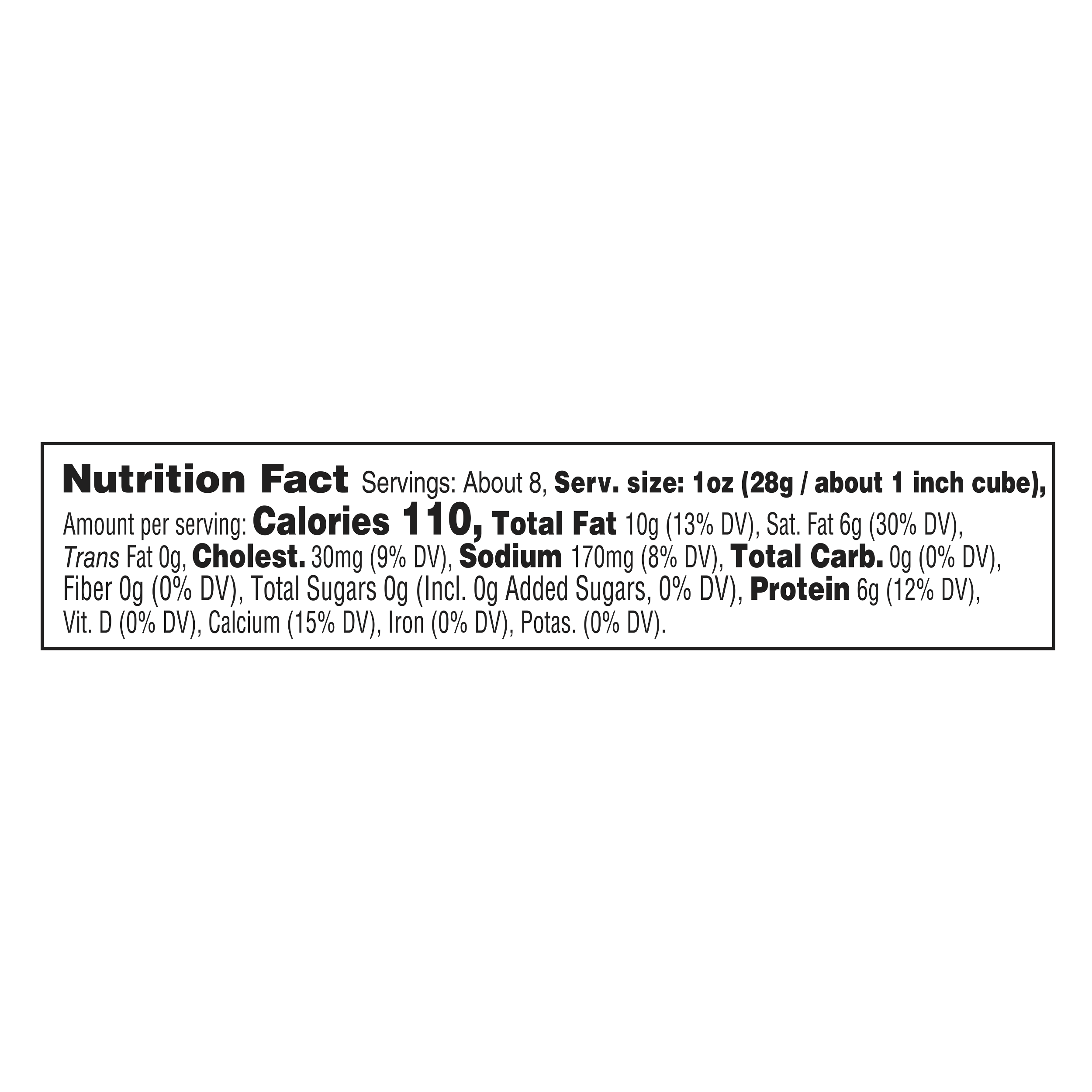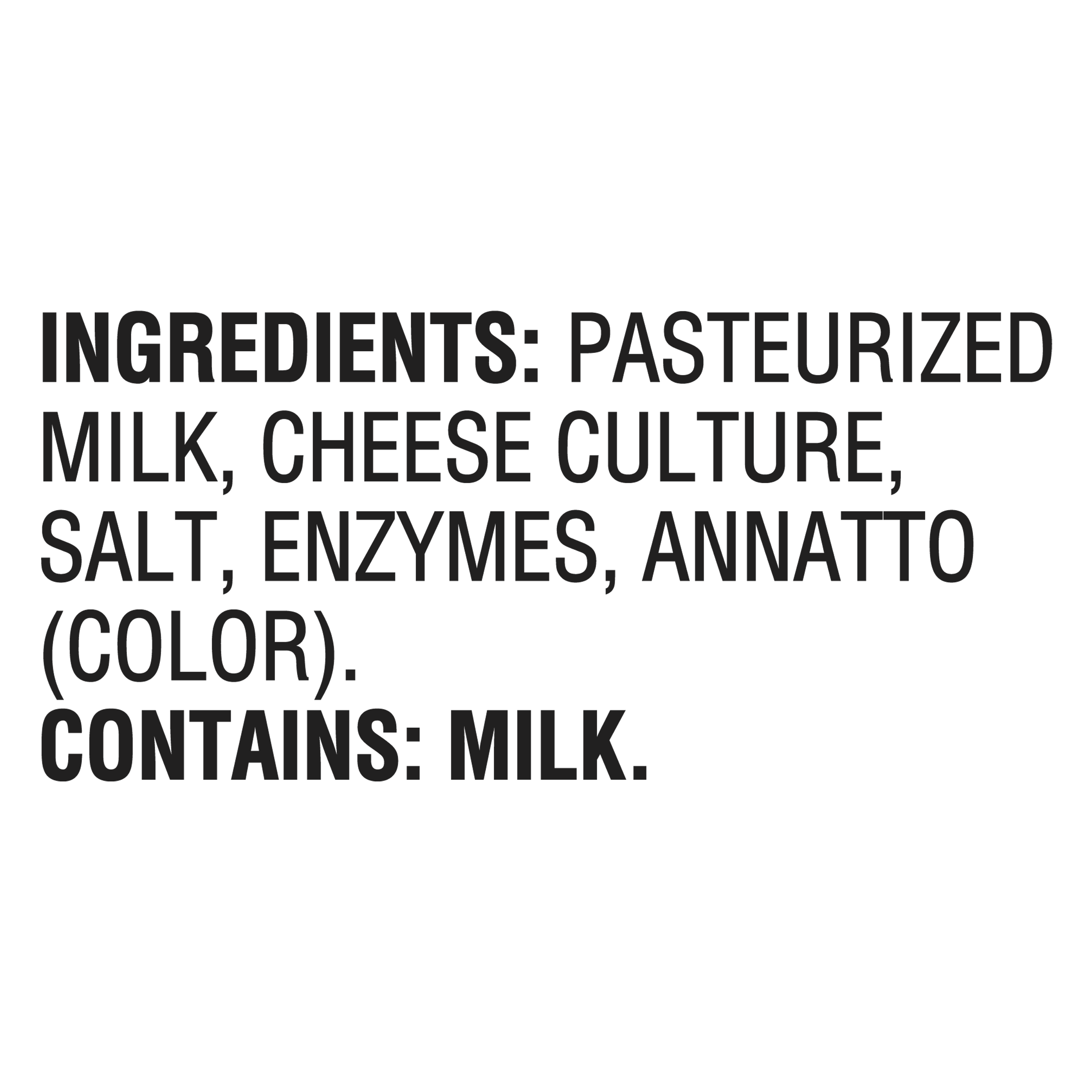 | Ingredient Statement | INGREDIENTS: PASTEURIZED MILK, CHEESE CULTURE, SALT, ENZYMES, ANNATTO (COLOR). |