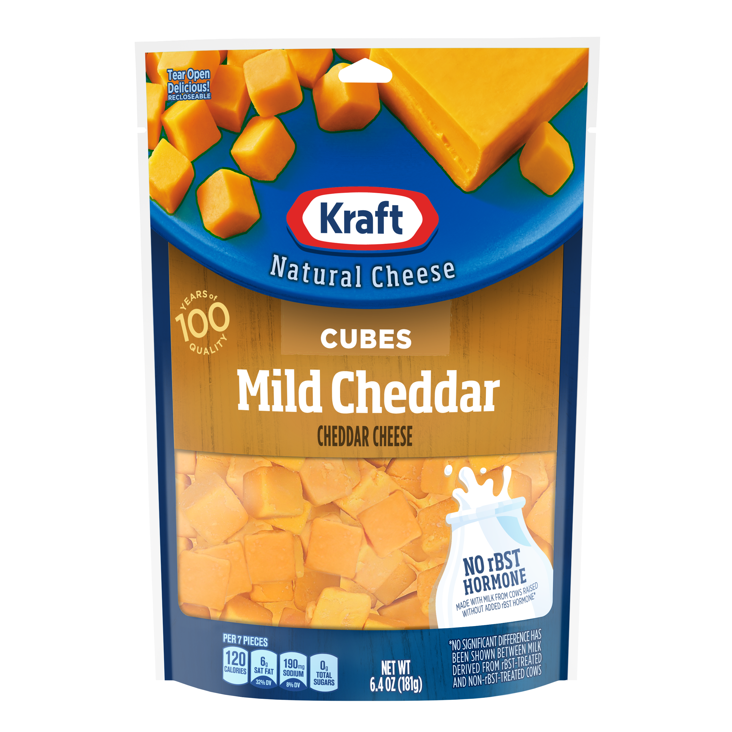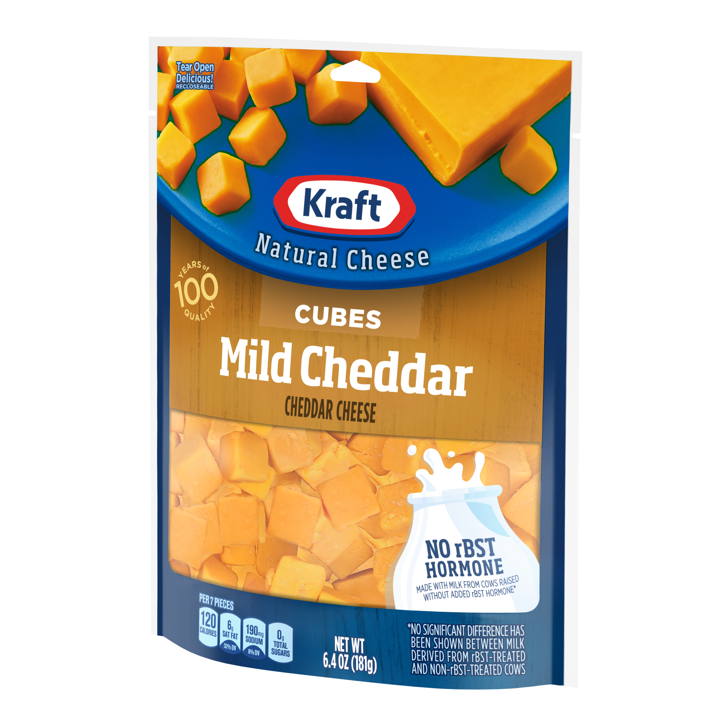 - Mild Cheddar Natural Cheese - Enjoy the classic cheesy goodness of Kraft Mild Cheddar Natural Cheese Cubes on their own or in your favorite recipes. This versatile cheese follows in the Kraft tradition of using only the highest-quality ingredients to create something truly delicious. The creamy texture and subtle cheddar taste is sure to win over all of the cheese lovers in your family. It is naturally delicious - crafted with quality pasteurized fresh milk. This 6.4 oz bag of Kraft Mild Cheddar Natural Cheese Cubes brings something special to salads, soups, snack trays and more. Treat yourself and your family to this rich and savory cheese at your next snack or mealtime to taste the difference Kraft can make.