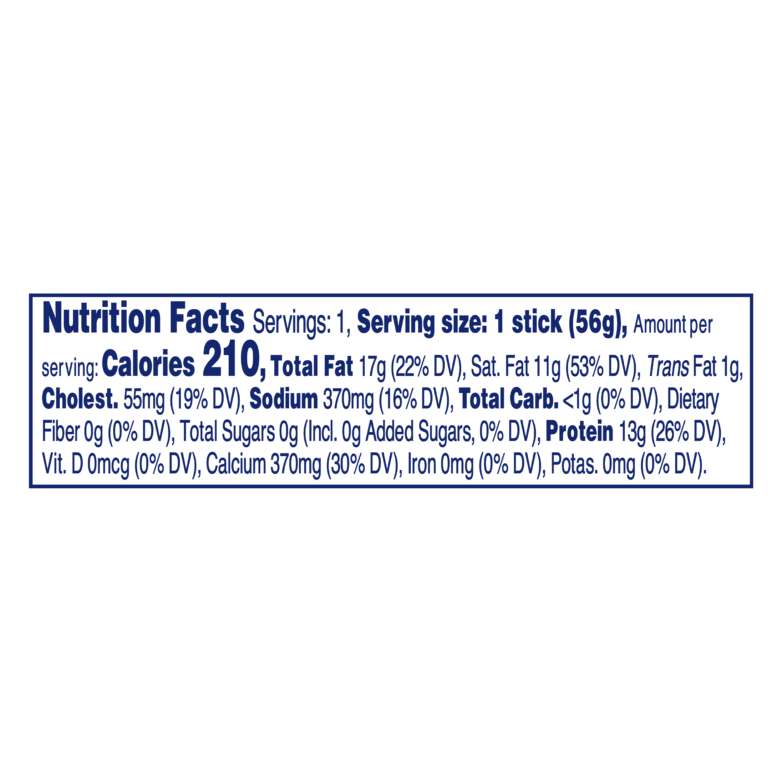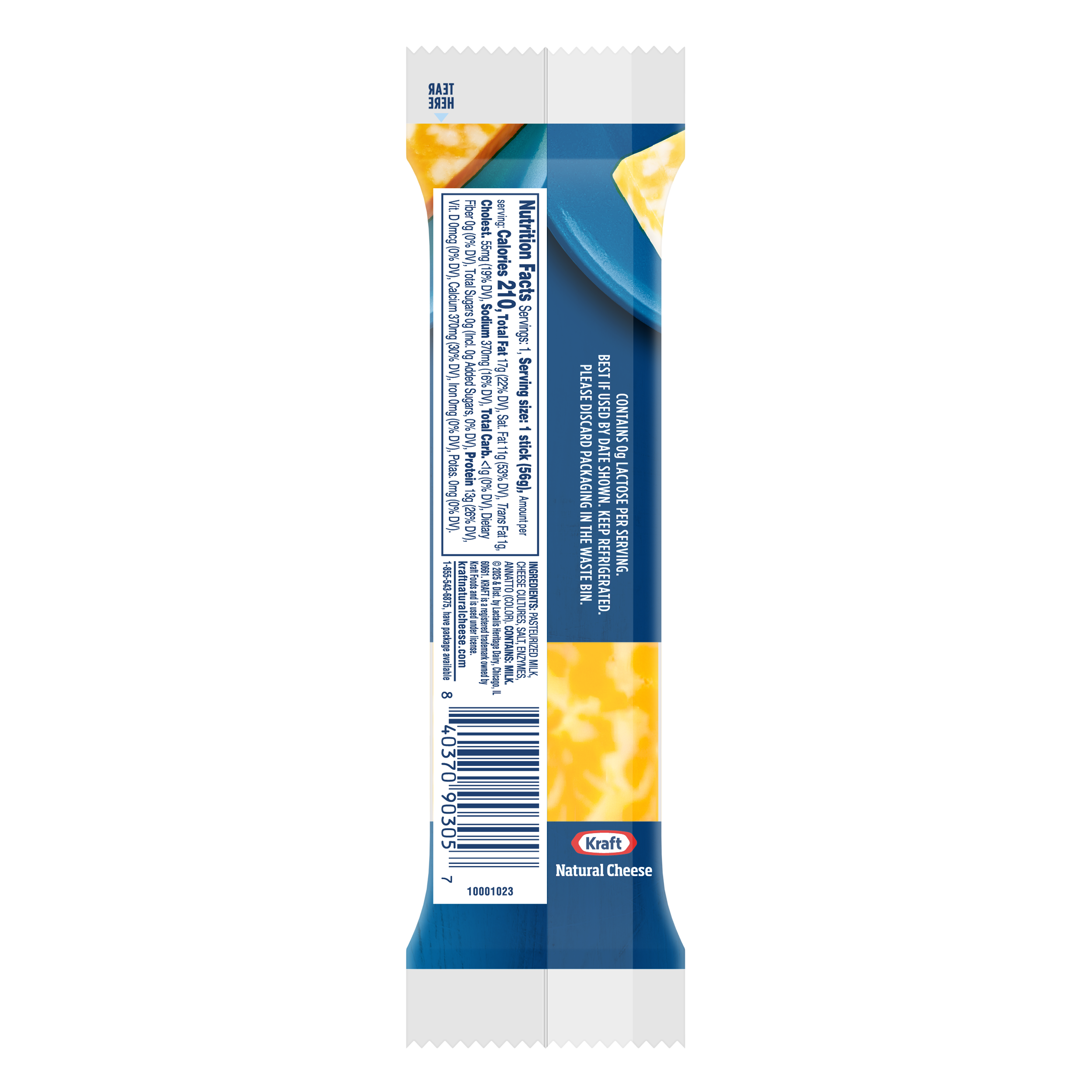 Salsify Product Id 00840370903057 Old GTIN 00021000007936 Trade Item Unit Descriptor (Product Type) (VV) Ea -- Each UPC 10 4037090305 UPC 11 (computed) 40370903057 zComputed_UPC 840370903057 UPC 13 0084037090305 Case Reference 10840370903061 Pallet Reference 20840370903068 Displayed Product Name Kraft Colby & Monterey Jack Big Cheese Snack 2 oz Stick Displayed Product Name - Long Kraft Colby & Monterey Jack Big Cheese Snack, 2 oz Stick Long Product Description Kraft Colby Jack Big Cheese Snack is made with quality ingredients for a quick and easy snack. Beautifully marbled Colby cheese and Monterey Jack cheese offer rich flavor and a creamy texture. The Kraft Natural Cheese snack stick makes an ideal option for grabbing on the go or satisfying your hunger between meals. These snacks are made with real milk from U.S. dairy farms for an authentic taste, and they contain 210 calories per serving. Pack these cheese snacks in your child's lunch box or your own gym bag for convenient anytime snacking. Each one of these cheesy snacks packs 13 grams of protein. Keep refrigerated until ready to enjoy. Marketing Message This delicious 2z Kraft Colby & Monterey Jack BIG Cheese Snack is prepared with quality ingredients that are delicious. This cheese snack has a flavorful taste the whole family will enjoy and helps to satisfy your hunger between meals. Popular with adults and children alike, this cheese snack is a perfect grab and go snack. Feature Bullet 1 One 2 oz Kraft Colby Jack Big Cheese Snack Feature Bullet 2 Kraft Colby Jack Big Cheese Snack is made with quality ingredients Feature Bullet 3 Marbled Colby and Monterey Jack cheeses Feature Bullet 4 Snack stick is ideal for snacking on the go Feature Bullet 5 Starts with real milk from U.S. dairy farms for authentic flavor Feature Bullet 6 Perfect for packing in lunches or snacking at home Feature Bullet 7 Contains 210 calories per serving Feature Bullet 8 Packed with 13 g. of protein per snack, see nutrition information for fat and saturated fat content Keywords colby jack cheese,cheese snacks,marble cheese,on the go snacks,colby jack,low carb snacks,protein snacks,monterey jack cheese,colby cheese,big cheese snack,cheesy snacks Depth 0.375 Depth UOM IN Height 5.5 Height UOM IN Width 1.75 Width UOM IN Gross Weight 0.129 Gross Weight UOM LBR Net Weight 0.125 Net Weight UOM LBR Net Content 2 Net Content UOM Ounce Net Content 1 2 Net Content 1 UOM Ounce Net Content 2 56.7 Net Content 2 UOM Gram (g) Volume 0.002 Volume UOM FTQ Maximum Temperature 45 Maximum Temperature UOM FAH -- Degree Fahrenheit Minimum Temperature 35 Minimum Temperature UOM FAH -- Degree Fahrenheit Min Product Lifespan from Production (Days) 150 Number Of Servings Per Package 1 Count Per Pack 1 Brand Kraft Displayed Product Name Kraft Colby & Monterey Jack Big Cheese Snack 2 oz Stick Division LHD Format Stick Status Existing UPC 840370903057 GTIN (Case) 0810126050007 Size (Individual Units) 1 SAP Item Name Kraft Colby & Monterey Jack Big Cheese Snack 2 Oz Stick Servings Per Package 1 Number of Selling Units per Case 1 Consumer Storage Instructions Keep Refrigerated Ingredient Statement PASTEURIZED MILK, CHEESE CULTURES, SALT, ENZYMES, ANNATTO (COLOR). Level Of Containment CONTAINS -- Contains GMO Free Yes Kosher No Guaranteed Shelf Life (Days) 75 Salsify Product Id 00840370903057