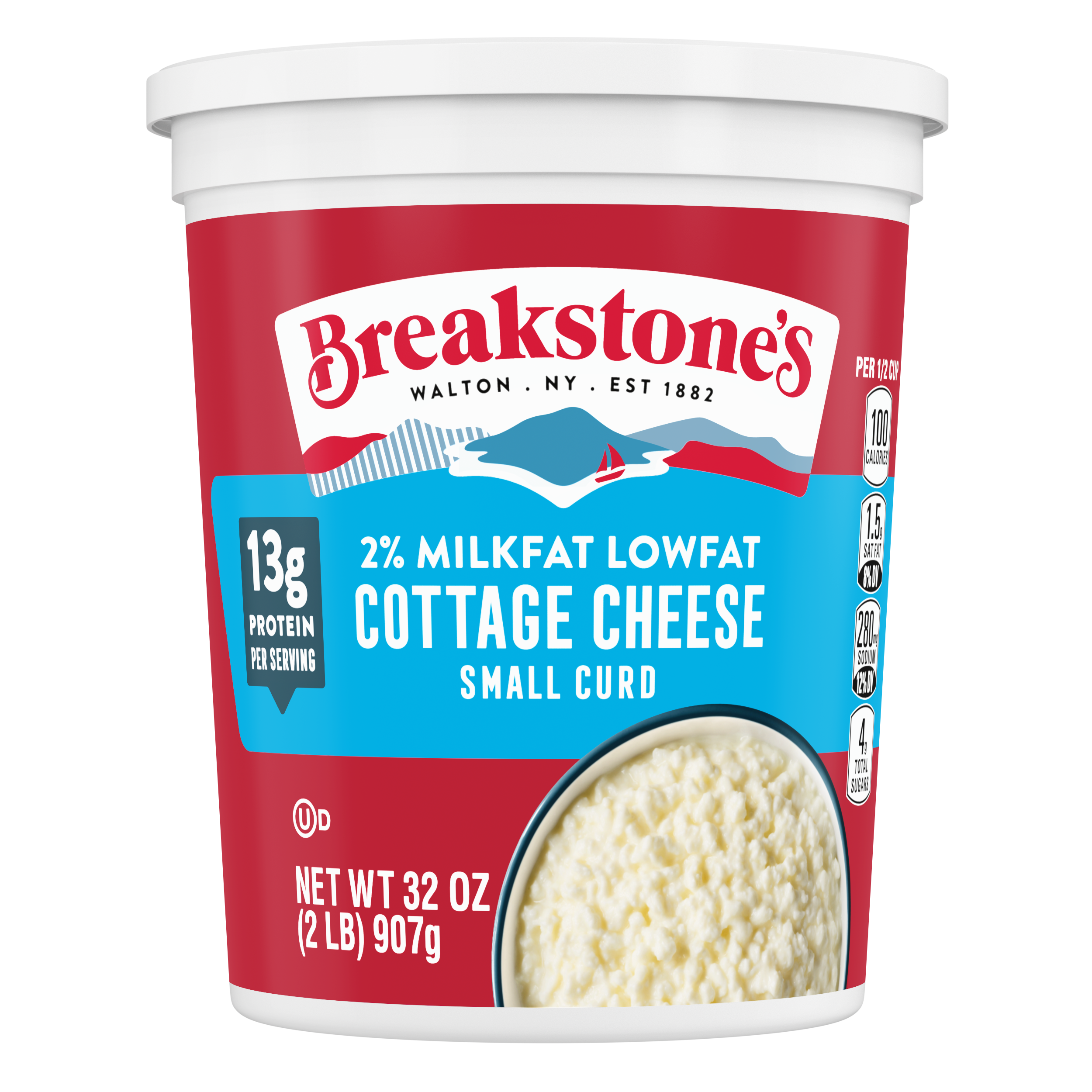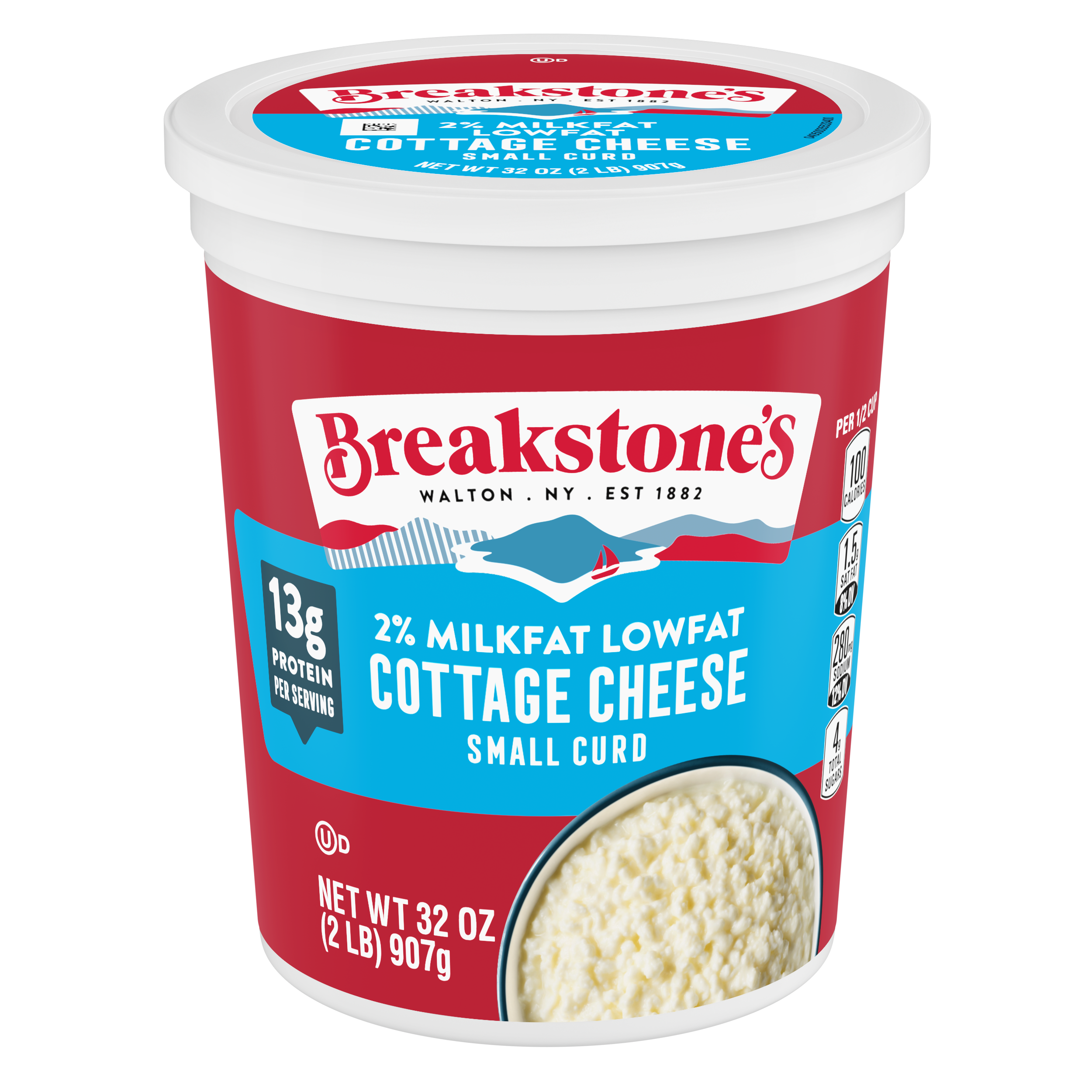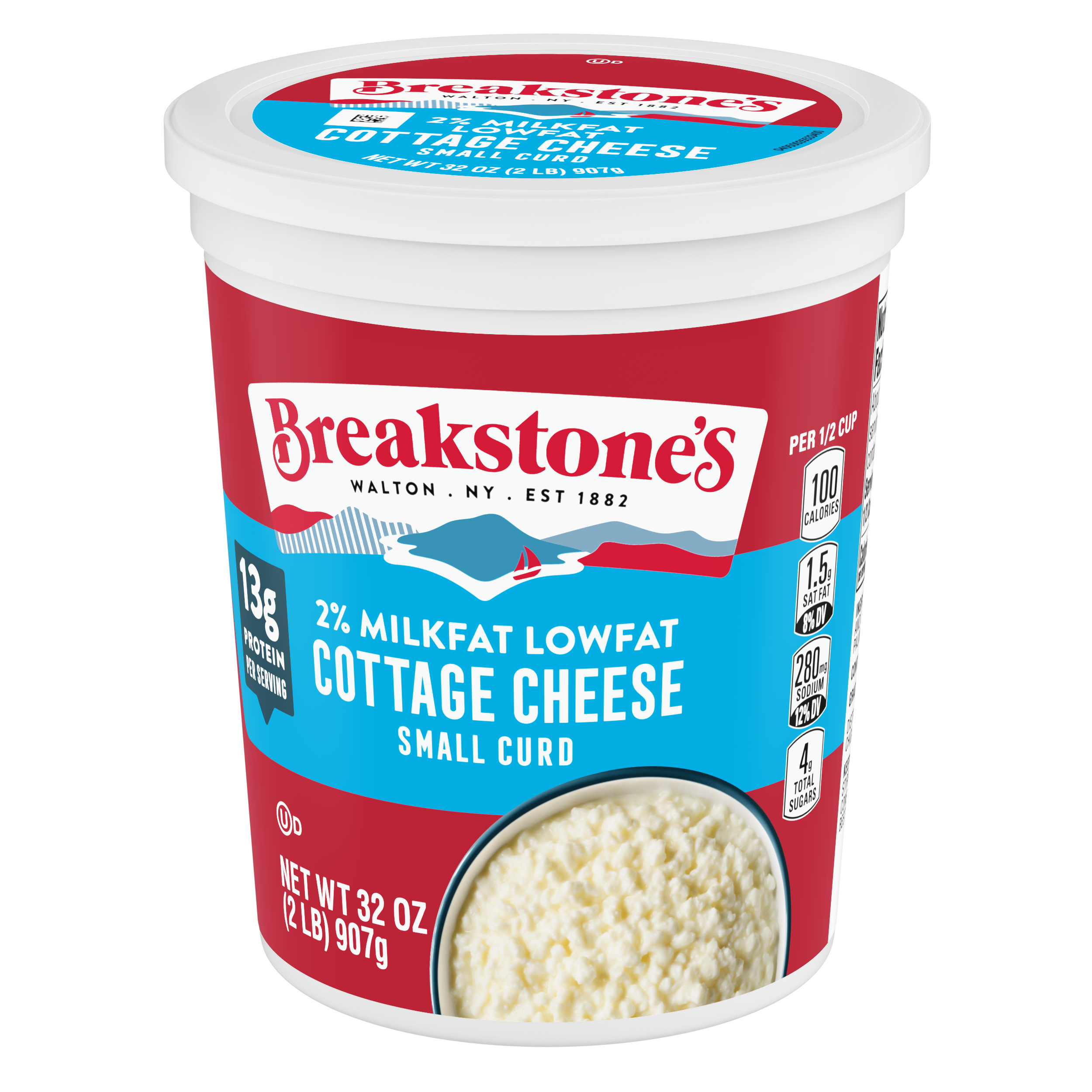 - Breakstone’s 2% milkfat low fat small curd cottage cheese is delicious, creamy, and packed with protein. Since it’s origin in 1882 in Walton New York, each cup of Breakstone’s cottage cheese is a celebration of craftsmanship and expertise evident in hand cut curds wrapped in a rich dressing for a fresh and delectable dairy experience. Each serving of Breakstone’s 2% milkfat low fat cottage cheese has 13 g of protein and only 100 calories, making it a better choice for your meals. Enjoyed on its own, as a side dish, a protein snack or an ingredient in a variety of lunch or dinner recipes, Breakstone’s cottage cheese is extremely versatile. Explore a variety of breakfast options using Breakstone’s 2% milkfat lowfat cottage cheese as a parfait bowl topped with fruits, on a toast with sweet or savory toppings, or simply blend with fruits or greens for a protein packed smoothie. You can go a step further and use Breakstone’s cottage cheese to make pasta dishes, salads, or even ice cream. Available in a 32 oz container, Breakstone’s 2% milkfat low fat cottage cheese can be stored in the fridge and enjoyed for a week once opened, giving you the opportunity to enjoy it in different ways. With over 140 years of heritage, Breakstone’s pays tribute to cultured dairy by bringing delicious high-quality dairy to your home.