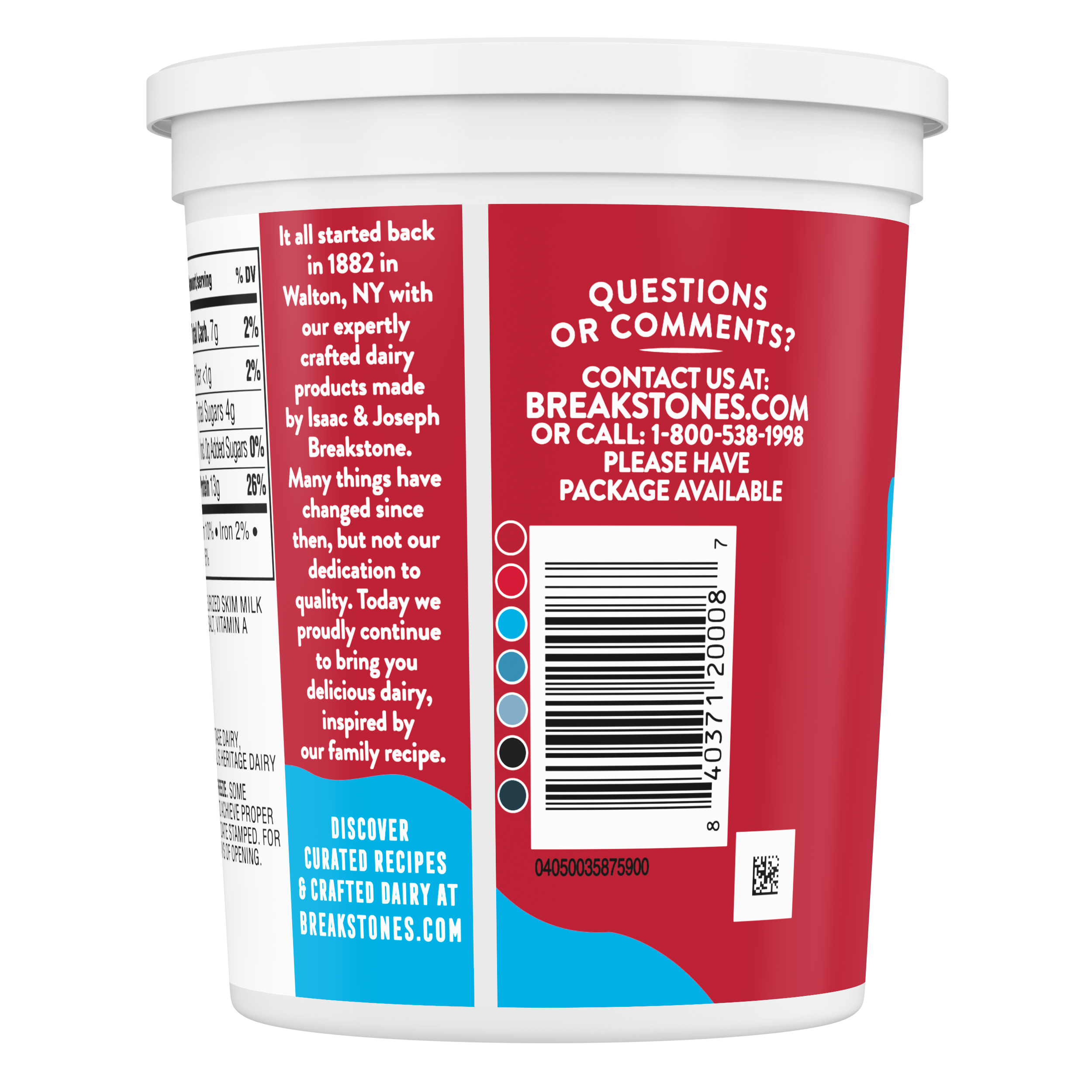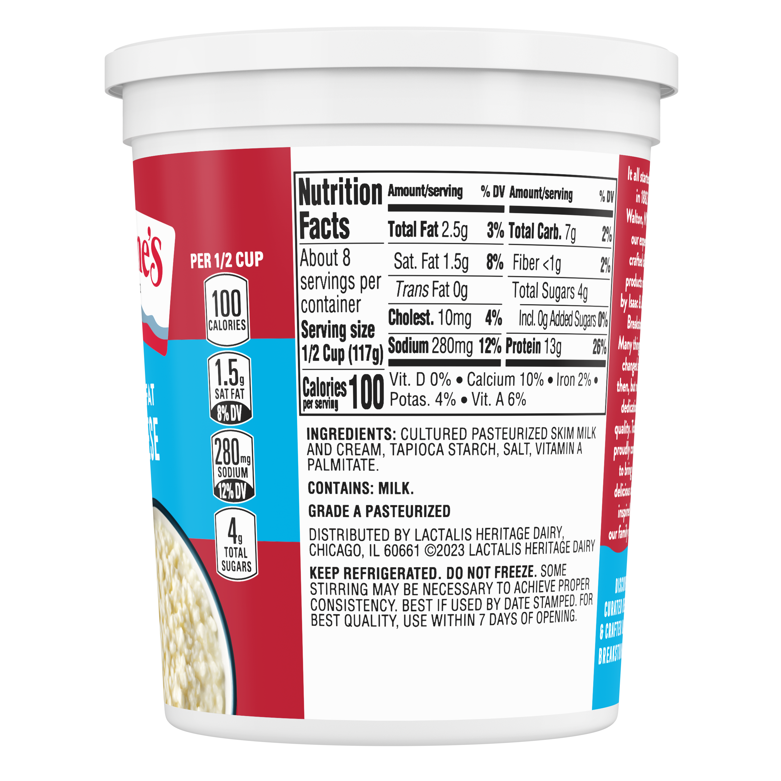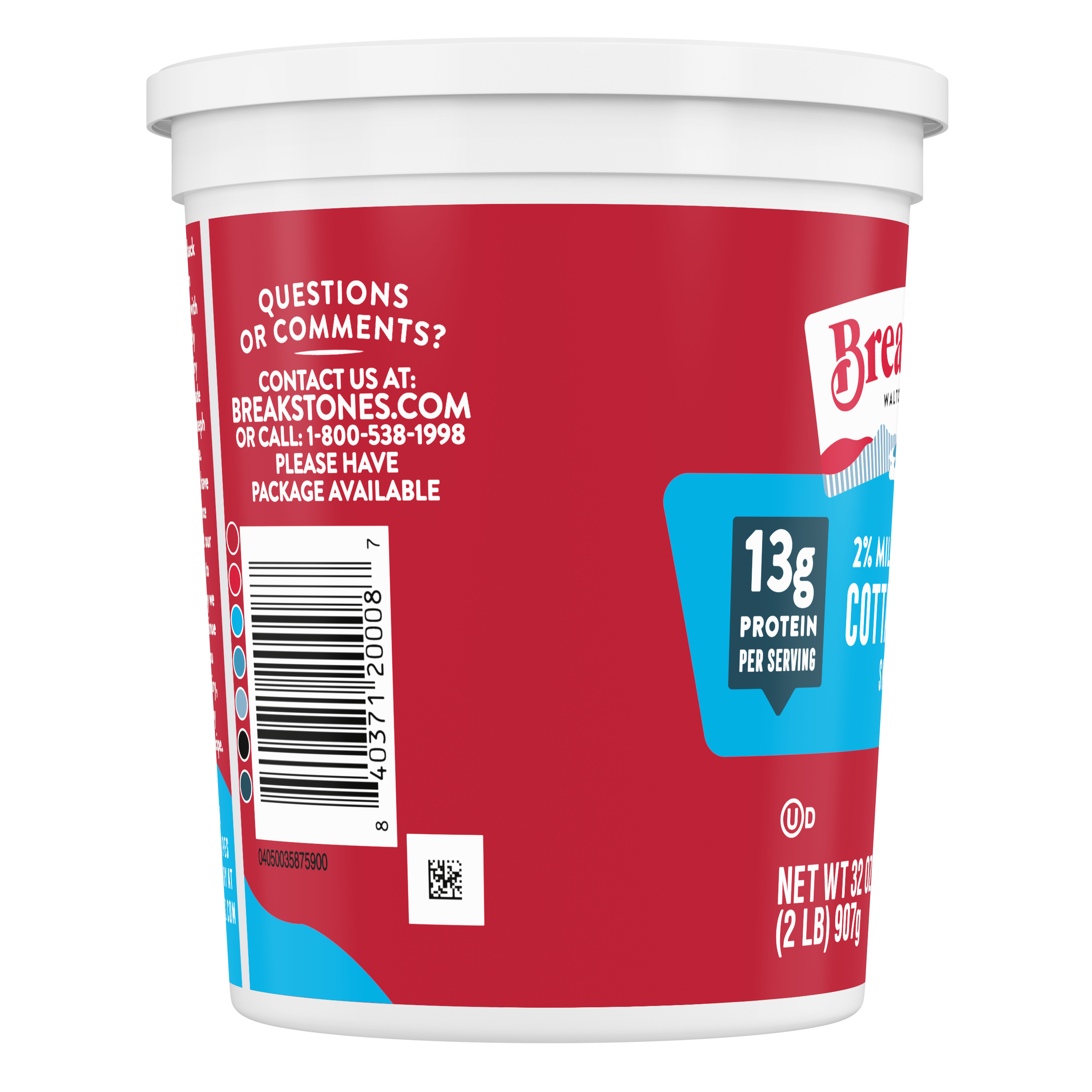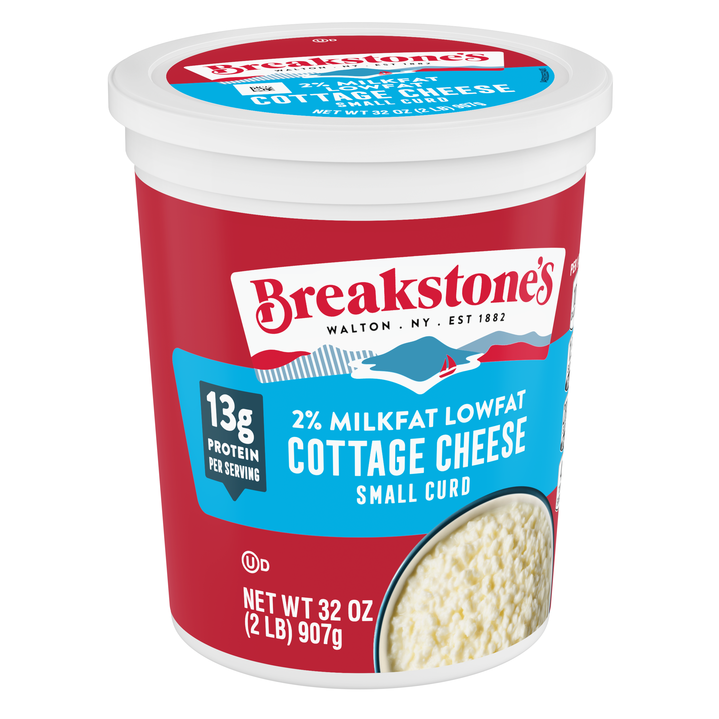- Breakstone’s 2% milkfat low fat small curd cottage cheese is delicious, creamy, and packed with protein. Since it’s origin in 1882 in Walton New York, each cup of Breakstone’s cottage cheese is a celebration of craftsmanship and expertise evident in hand cut curds wrapped in a rich dressing for a fresh and delectable dairy experience. Each serving of Breakstone’s 2% milkfat low fat cottage cheese has 13 g of protein and only 100 calories, making it a better choice for your meals. Enjoyed on its own, as a side dish, a protein snack or an ingredient in a variety of lunch or dinner recipes, Breakstone’s cottage cheese is extremely versatile. Explore a variety of breakfast options using Breakstone’s 2% milkfat lowfat cottage cheese as a parfait bowl topped with fruits, on a toast with sweet or savory toppings, or simply blend with fruits or greens for a protein packed smoothie. You can go a step further and use Breakstone’s cottage cheese to make pasta dishes, salads, or even ice cream. Available in a 32 oz container, Breakstone’s 2% milkfat low fat cottage cheese can be stored in the fridge and enjoyed for a week once opened, giving you the opportunity to enjoy it in different ways. With over 140 years of heritage, Breakstone’s pays tribute to cultured dairy by bringing delicious high-quality dairy to your home.