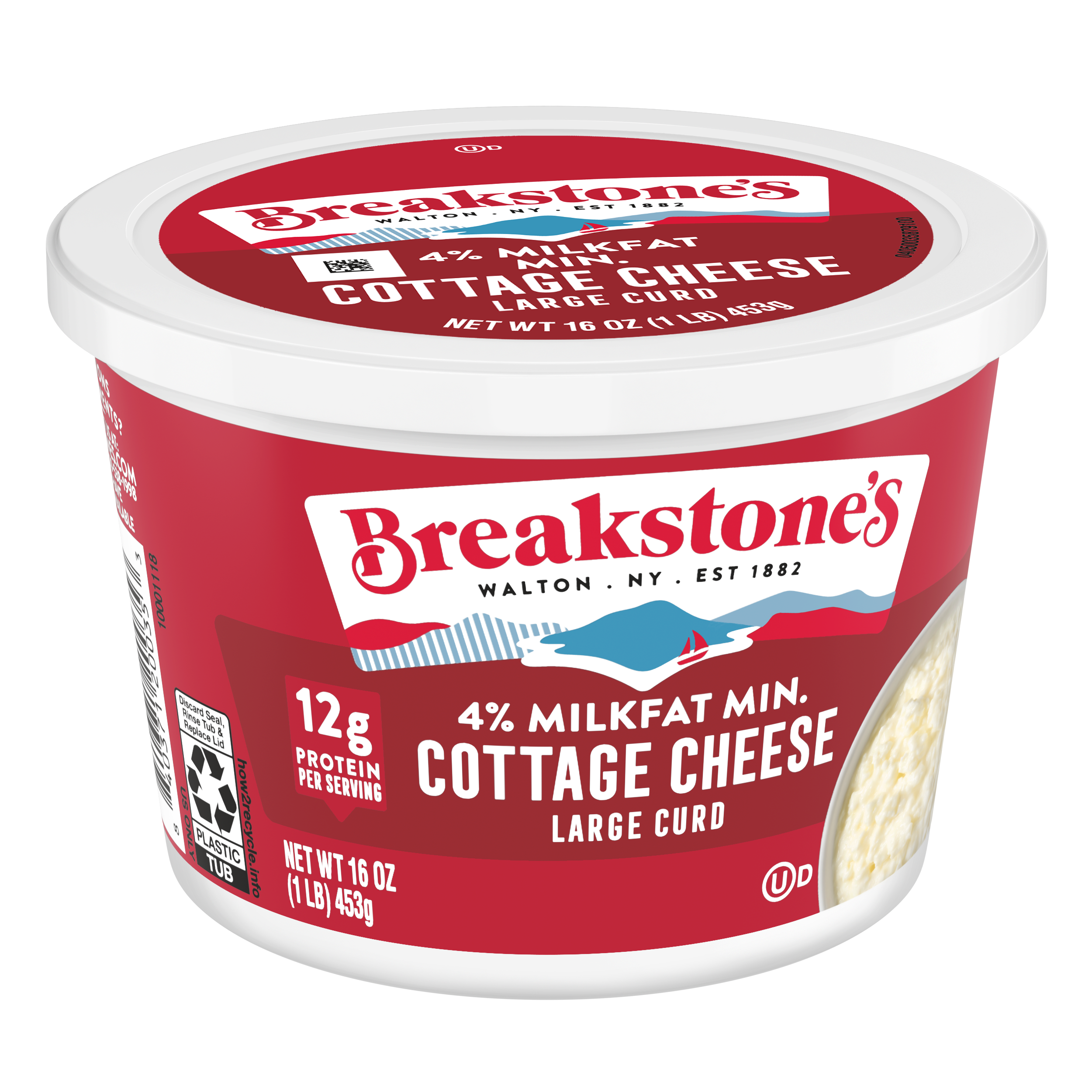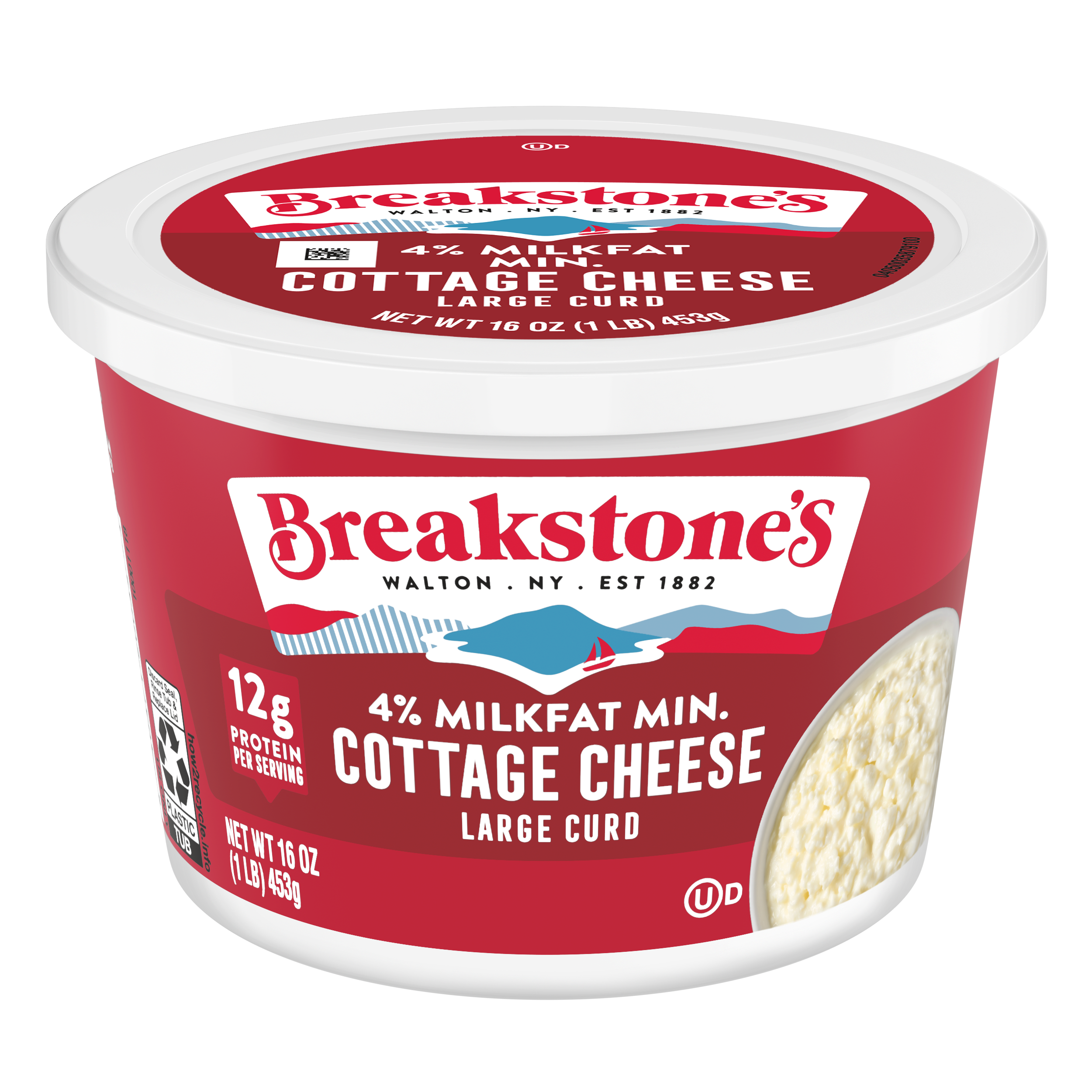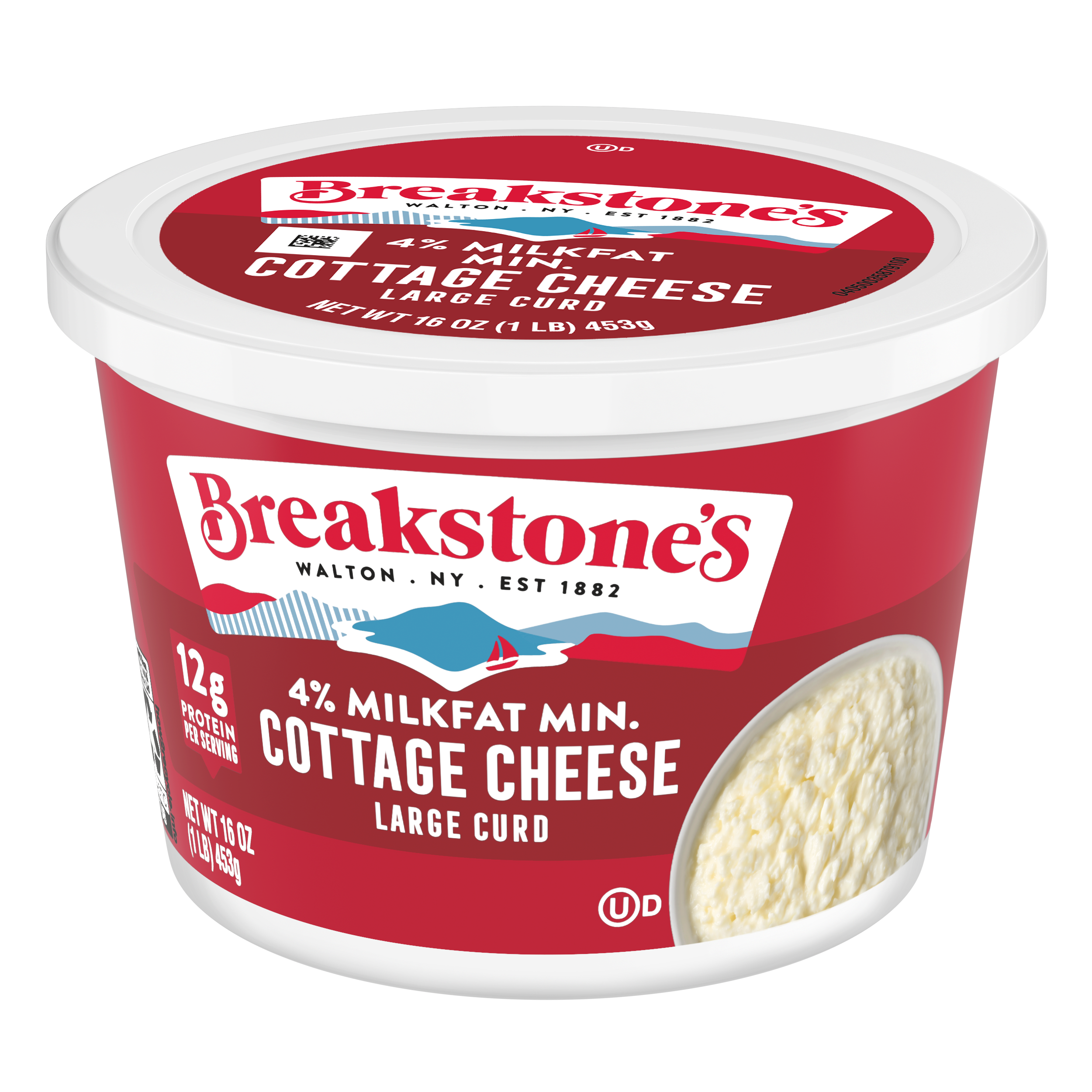 - Breakstone’s 4% milkfat large curd cottage cheese is delicious, creamy, and packed with protein. Since it’s origin in 1882 in Walton New York, each cup of Breakstone’s cottage cheese is a celebration of craftsmanship and expertise evident in hand cut curds wrapped in a rich dressing for a fresh and delectable dairy experience. Each serving of Breakstone’s 4% milkfat cottage cheese has 12g of protein and only 120 calories, making it a better choice for your meals. Enjoyed on its own, as a side dish, a protein snack for lunch or an ingredient in a variety of recipes, Breakstone’s cottage cheese is extremely versatile. Explore a variety of breakfast options using Breakstone’s 4% milkfat cottage cheese as a parfait bowl topped with fruits, on a toast with sweet or savory toppings, or simply blend with fruits or greens for a protein packed smoothie. You can go a step further and use Breakstone’s cottage cheese to make pasta dishes, salads, or even ice cream. Available in a 16oz container, Breakstone’s 4% milkfat cottage cheese can be stored in the fridge and enjoyed for a week once opened, giving you the opportunity to enjoy it in different ways. With over 140 years of heritage, Breakstone’s pays tribute to cultured dairy by bringing delicious high-quality dairy to your home.