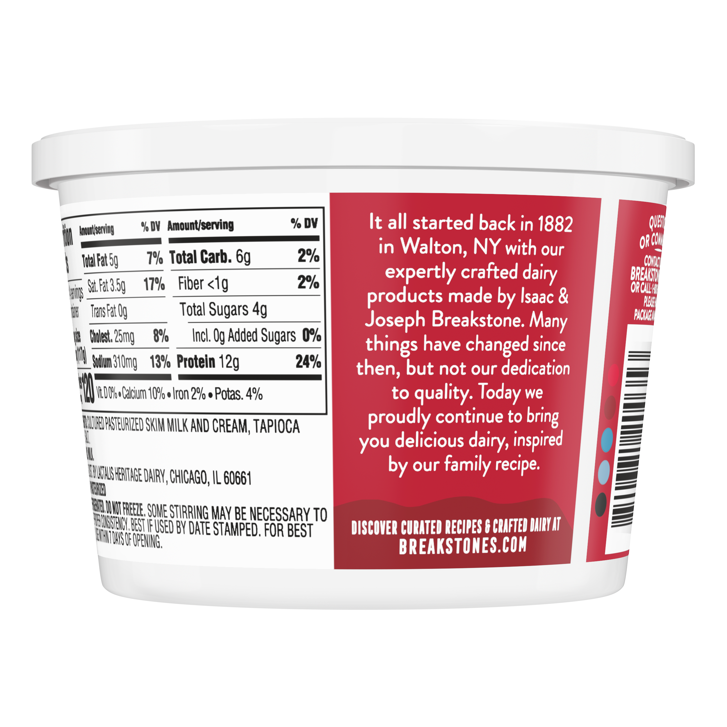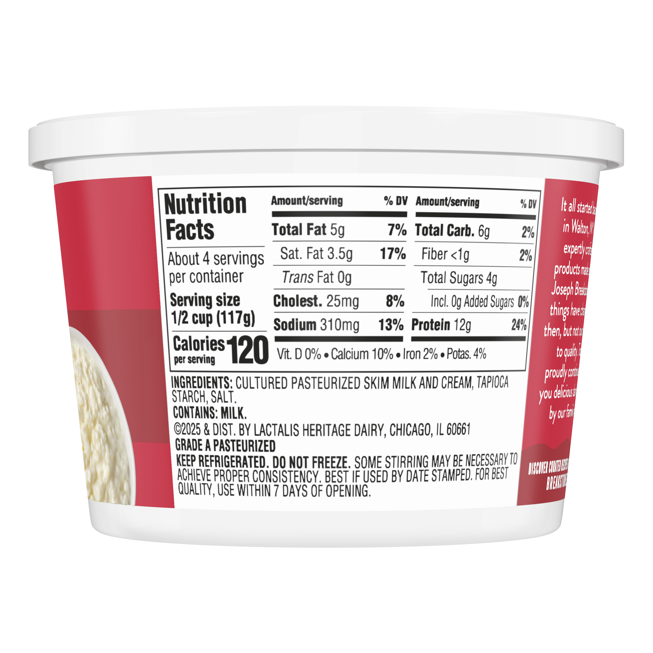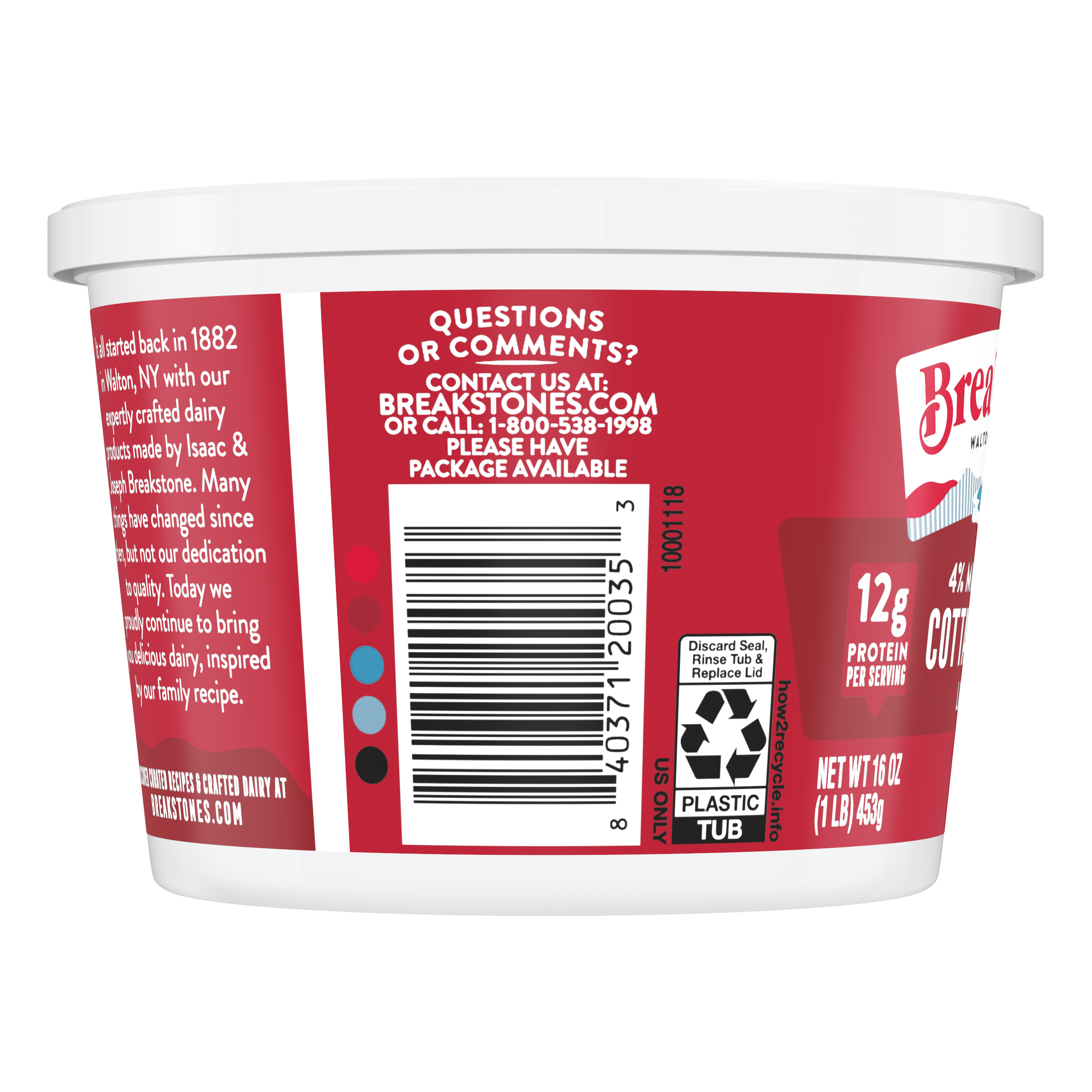 - Breakstone’s 4% milkfat large curd cottage cheese is delicious, creamy, and packed with protein. Since it’s origin in 1882 in Walton New York, each cup of Breakstone’s cottage cheese is a celebration of craftsmanship and expertise evident in hand cut curds wrapped in a rich dressing for a fresh and delectable dairy experience. Each serving of Breakstone’s 4% milkfat cottage cheese has 12g of protein and only 120 calories, making it a better choice for your meals. Enjoyed on its own, as a side dish, a protein snack for lunch or an ingredient in a variety of recipes, Breakstone’s cottage cheese is extremely versatile. Explore a variety of breakfast options using Breakstone’s 4% milkfat cottage cheese as a parfait bowl topped with fruits, on a toast with sweet or savory toppings, or simply blend with fruits or greens for a protein packed smoothie. You can go a step further and use Breakstone’s cottage cheese to make pasta dishes, salads, or even ice cream. Available in a 16oz container, Breakstone’s 4% milkfat cottage cheese can be stored in the fridge and enjoyed for a week once opened, giving you the opportunity to enjoy it in different ways. With over 140 years of heritage, Breakstone’s pays tribute to cultured dairy by bringing delicious high-quality dairy to your home.