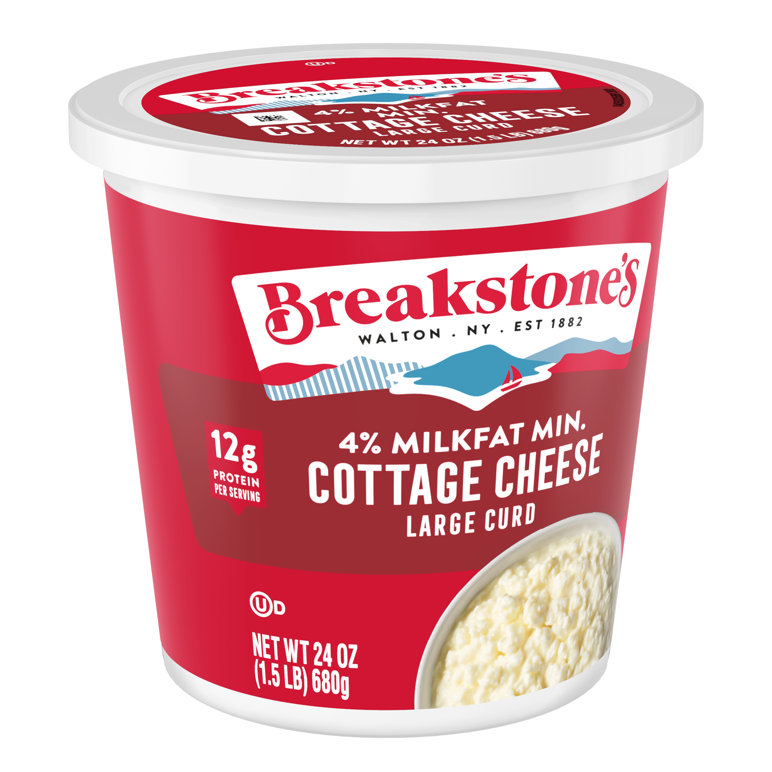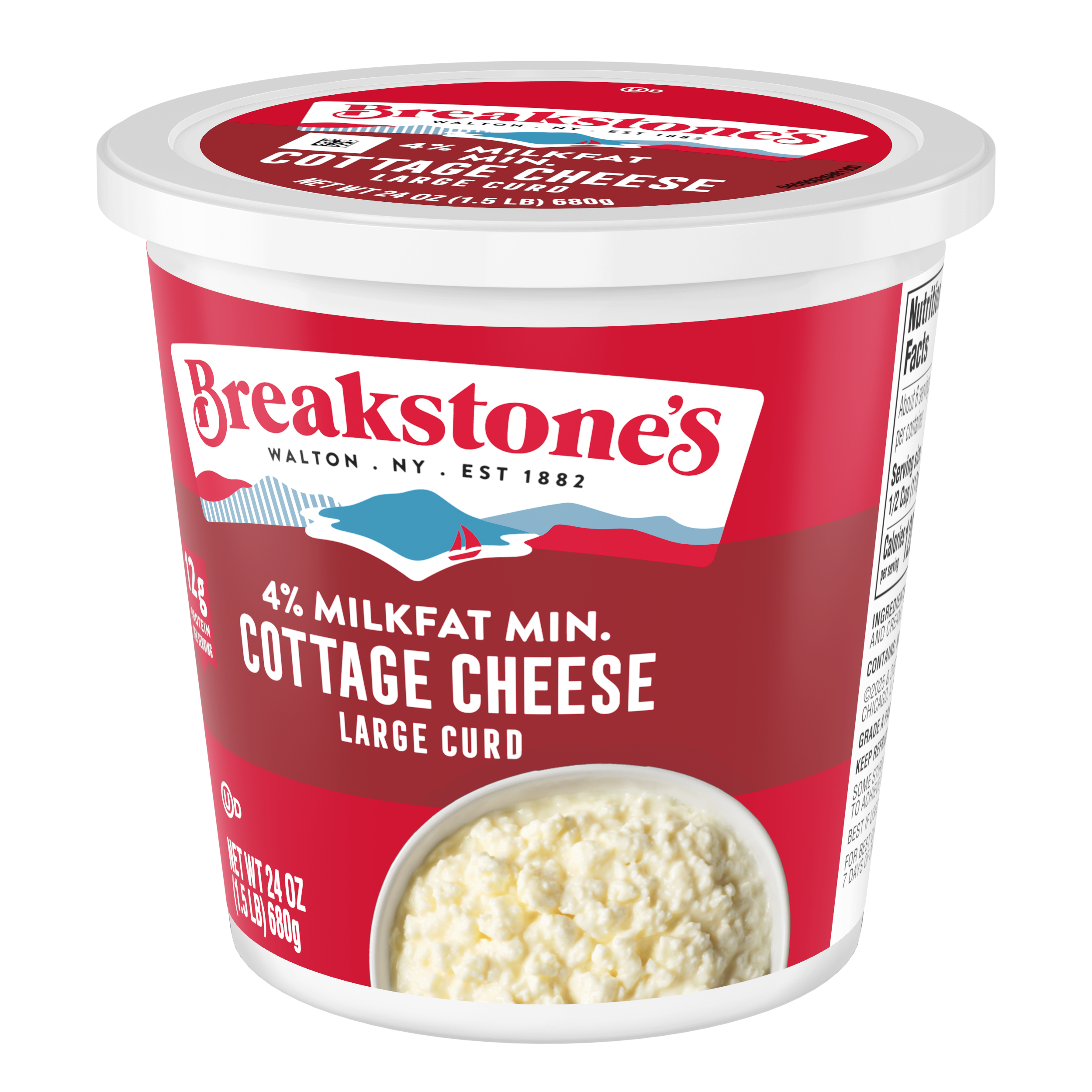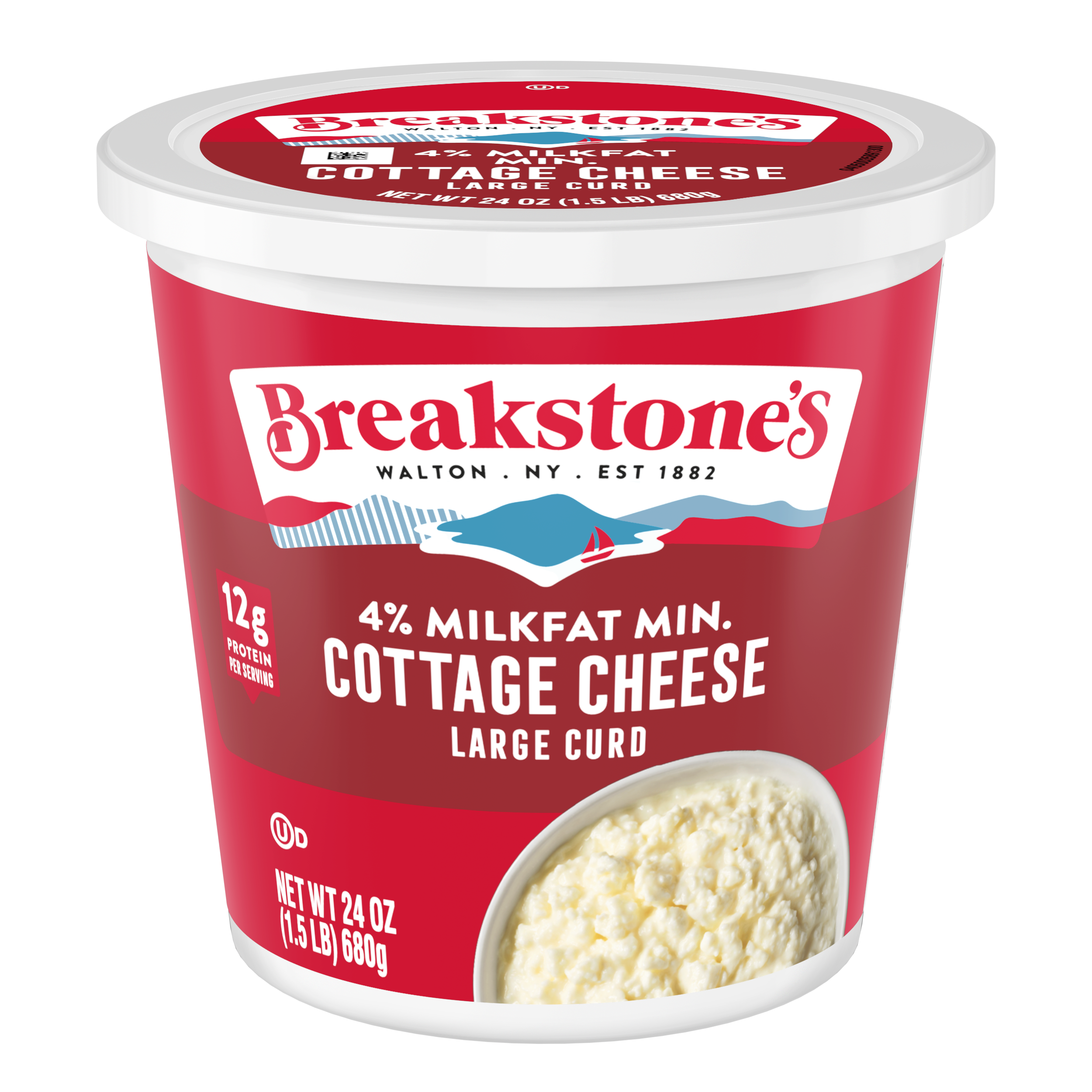 - Breakstone’s 4% milkfat large curd cottage cheese is delicious, creamy, and packed with protein. Since it’s origin in 1882 in Walton New York, each cup of Breakstone’s cottage cheese is a celebration of craftsmanship and expertise evident in hand cut curds wrapped in a rich dressing for a fresh and delectable dairy experience. Each serving of Breakstone’s 4% milkfat cottage cheese has 12g of protein and only 120 calories, making it a better choice for your meals. Enjoyed on its own, as a side dish, a protein snack for lunch or an ingredient in a variety of recipes, Breakstone’s cottage cheese is extremely versatile. Explore a variety of breakfast options using Breakstone’s 4% milkfat cottage cheese as a parfait bowl topped with fruits, on a toast with sweet or savory toppings, or simply blend with fruits or greens for a protein packed smoothie. You can go a step further and use Breakstone’s cottage cheese to make pasta dishes, salads, or even ice cream. Available in a 24oz container, Breakstone’s 4% milkfat cottage cheese can be stored in the fridge and enjoyed for a week once opened, giving you the opportunity to enjoy it in different ways. With over 140 years of heritage, Breakstone’s pays tribute to cultured dairy by bringing delicious high-quality dairy to your home.