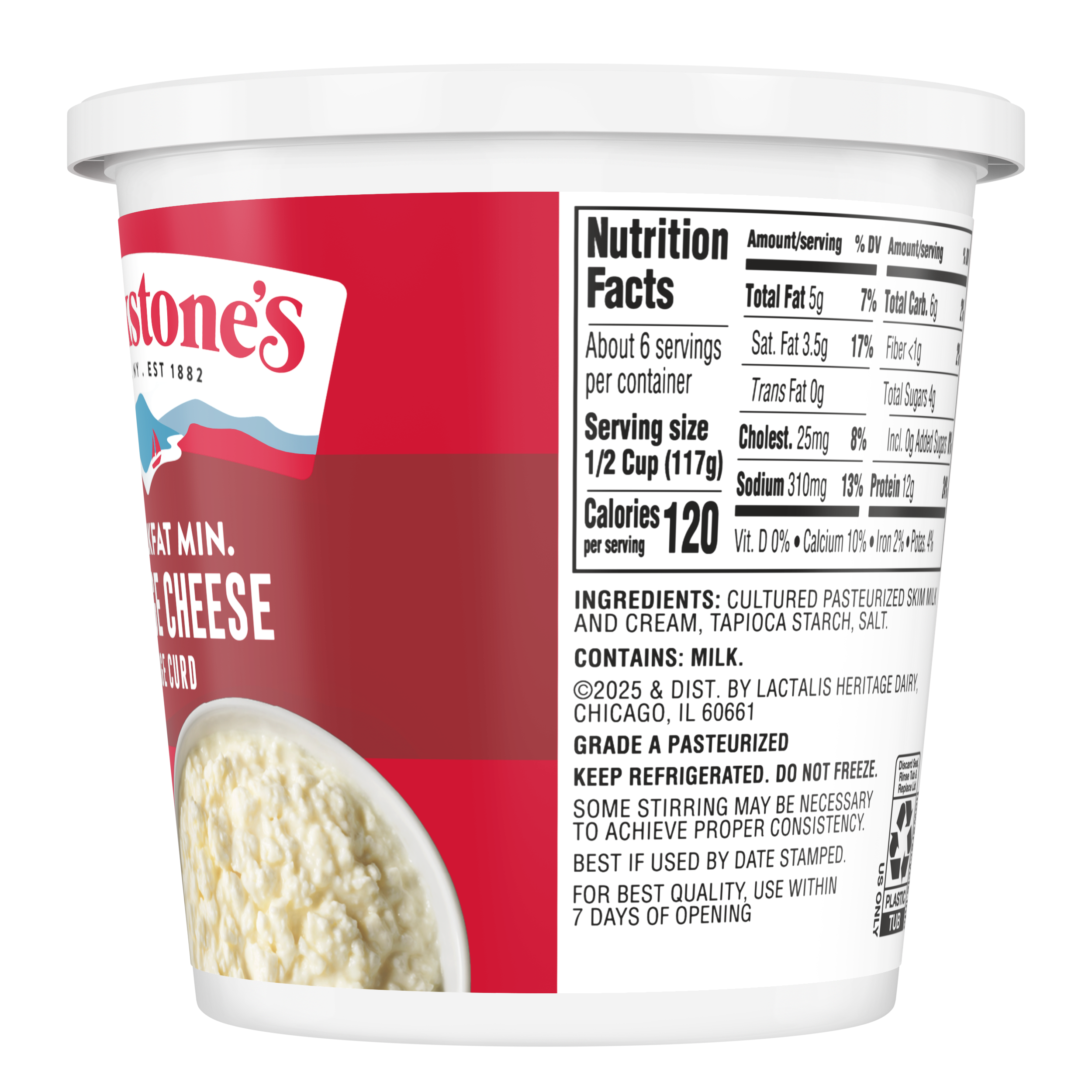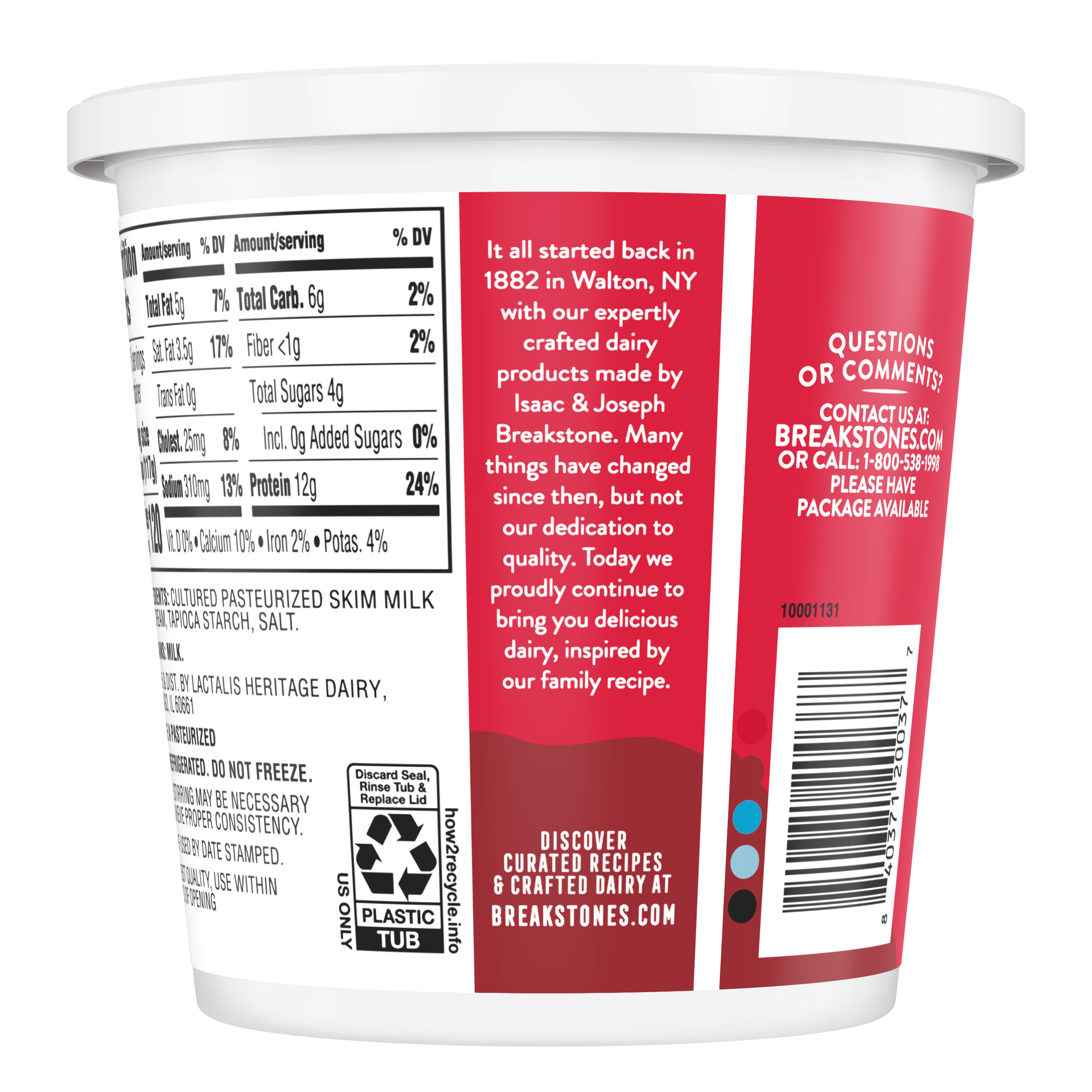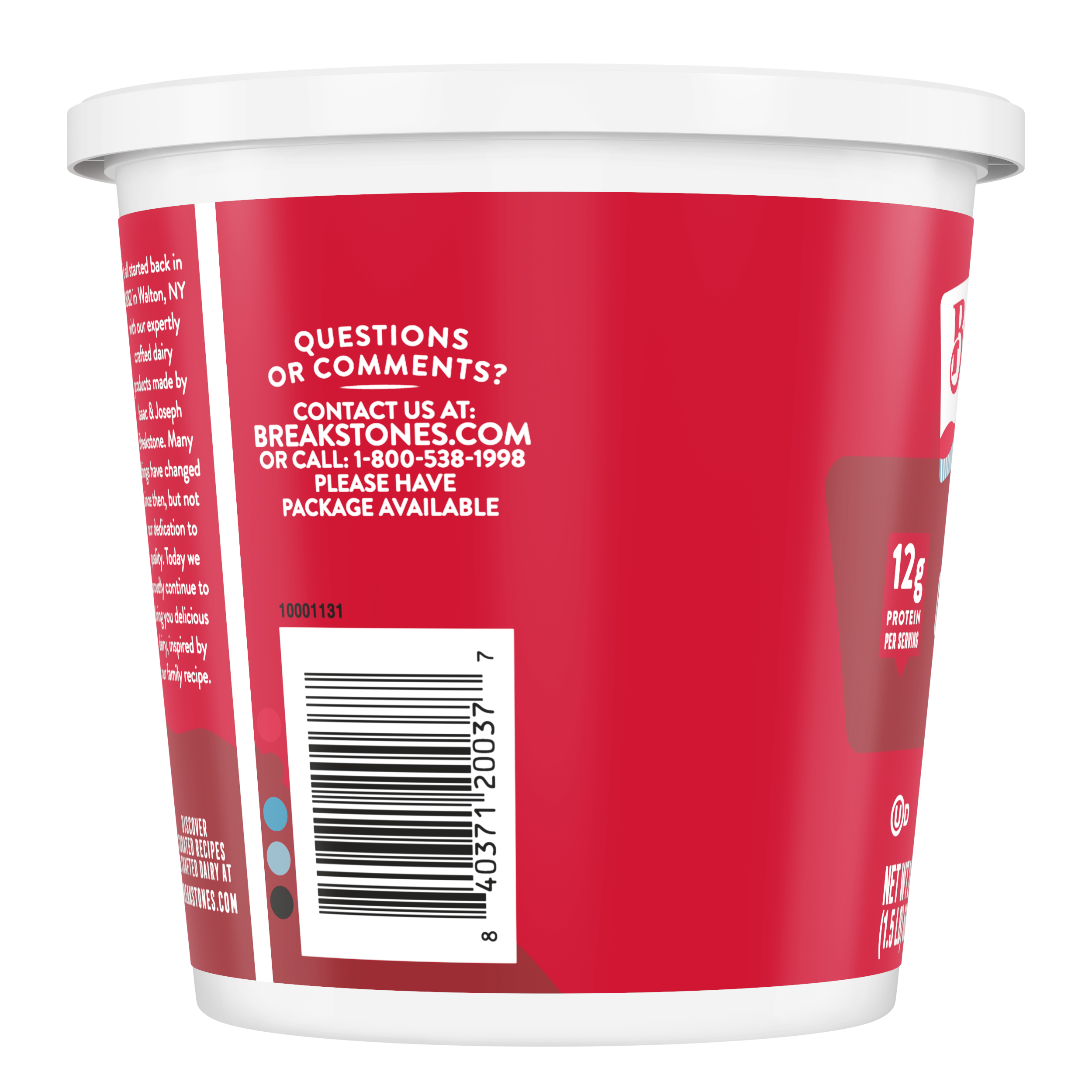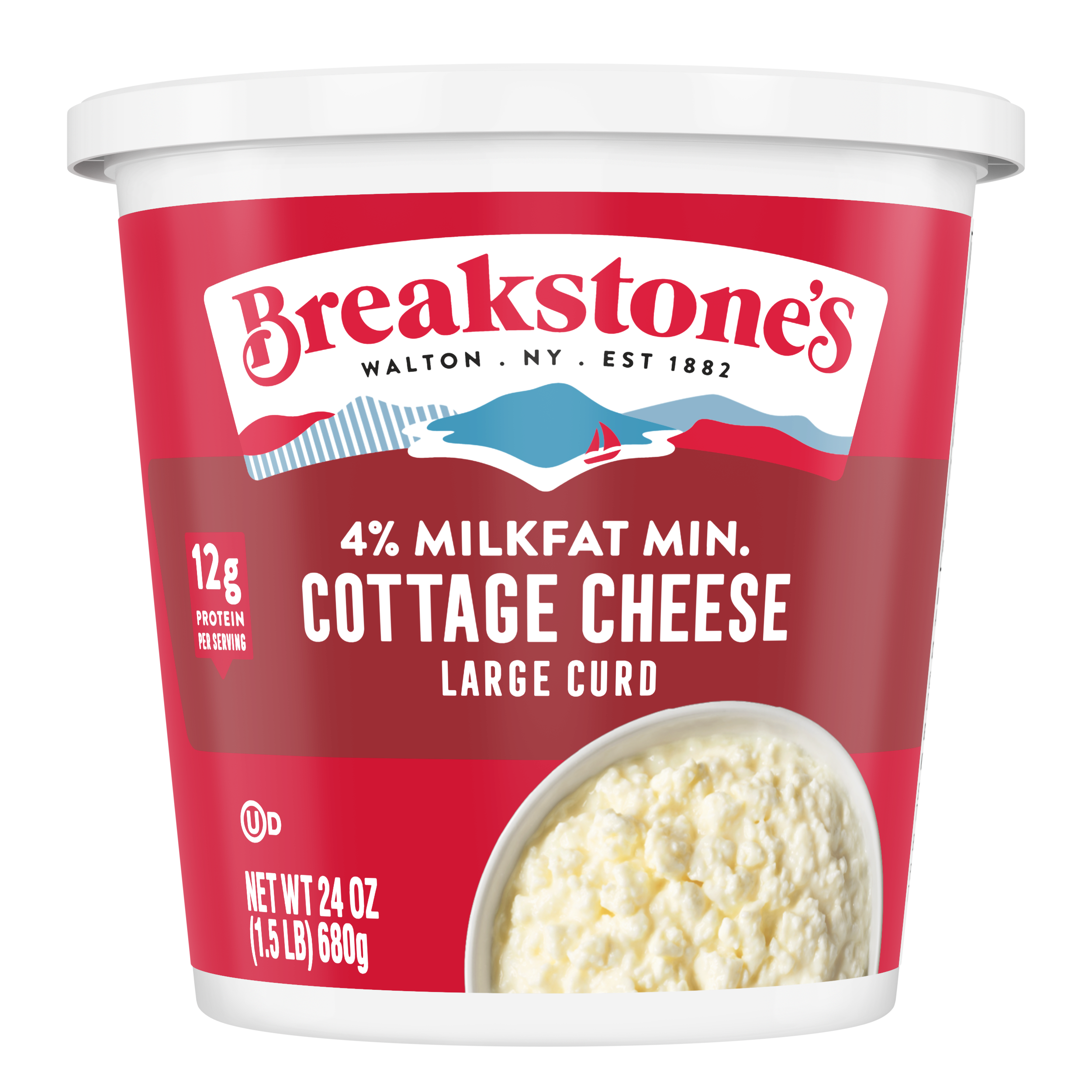 - Breakstone’s 4% milkfat large curd cottage cheese is delicious, creamy, and packed with protein. Since it’s origin in 1882 in Walton New York, each cup of Breakstone’s cottage cheese is a celebration of craftsmanship and expertise evident in hand cut curds wrapped in a rich dressing for a fresh and delectable dairy experience. Each serving of Breakstone’s 4% milkfat cottage cheese has 12g of protein and only 120 calories, making it a better choice for your meals. Enjoyed on its own, as a side dish, a protein snack for lunch or an ingredient in a variety of recipes, Breakstone’s cottage cheese is extremely versatile. Explore a variety of breakfast options using Breakstone’s 4% milkfat cottage cheese as a parfait bowl topped with fruits, on a toast with sweet or savory toppings, or simply blend with fruits or greens for a protein packed smoothie. You can go a step further and use Breakstone’s cottage cheese to make pasta dishes, salads, or even ice cream. Available in a 24oz container, Breakstone’s 4% milkfat cottage cheese can be stored in the fridge and enjoyed for a week once opened, giving you the opportunity to enjoy it in different ways. With over 140 years of heritage, Breakstone’s pays tribute to cultured dairy by bringing delicious high-quality dairy to your home.