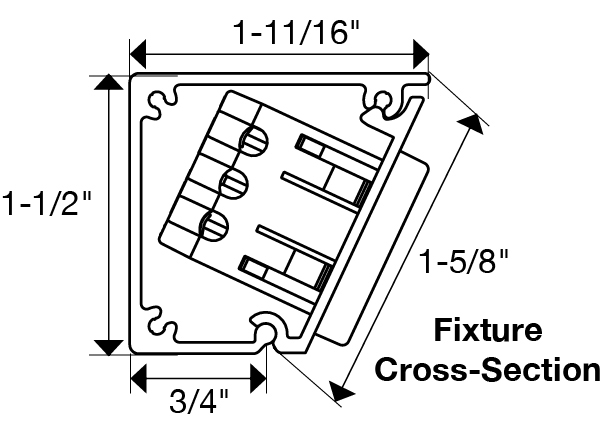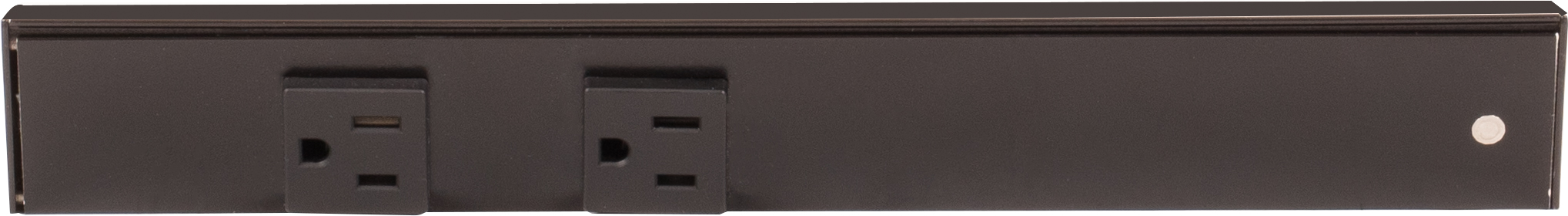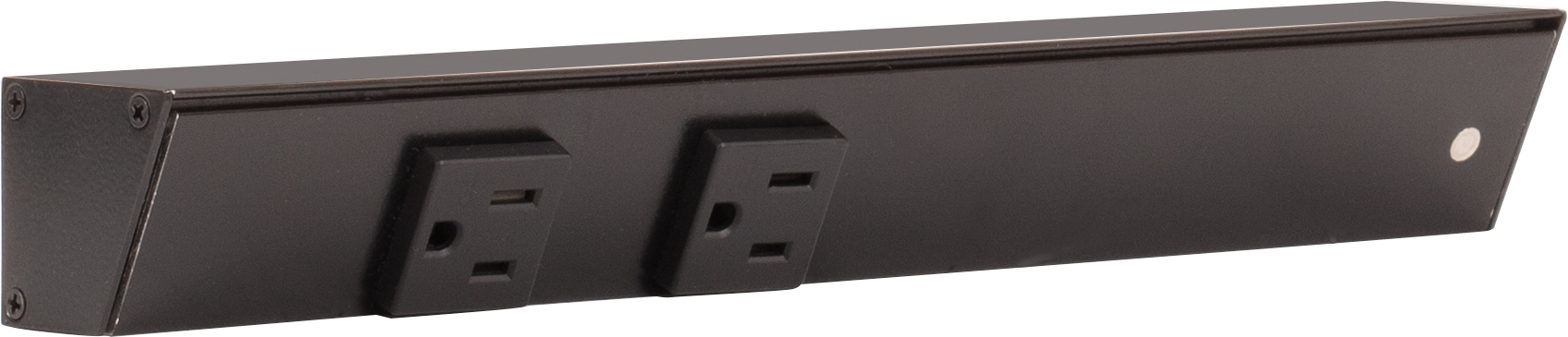 Finish Black Feature 1 Angled design provides easy access to outlets and tucks up under cabinet to disappear at eye level Feature 2 Very compact 1-1/2" profile Feature 3 UL listed fixtures featuring 20-amp tamper-resistant single receptacles that meet code in most markets Feature 4 Standard lengths fit standard cabinet widths for easy ordering Feature 5 Assembled in USA Feature 6 Ships assembled and ready to install, mounting hardware included Feature 7 Durable aluminum profile with a quality powder-coated finish is durable, scratch-resistant, rust-resistant Item Overall Length 12" Item Width 1-11/16" Item Height 1-1/2"