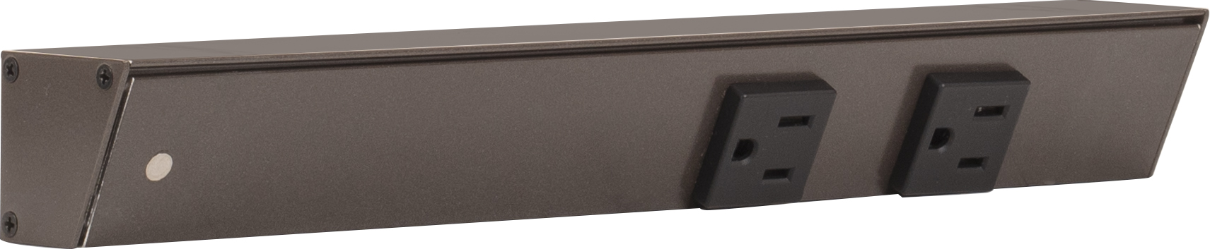 Finish Bronze Feature 1 Angled design provides easy access to outlets and tucks up under cabinet to disappear at eye level Feature 2 Very compact 1-1/2" profile Feature 3 UL listed fixtures featuring 20-amp tamper-resistant single receptacles that meet code in most markets Feature 4 Standard lengths fit standard cabinet widths for easy ordering Feature 5 Assembled in USA Feature 6 Ships assembled and ready to install, mounting hardware included Feature 7 Durable aluminum profile with a quality powder-coated finish is durable, scratch-resistant, rust-resistant Item Overall Length 12" Item Width 1-11/16" Item Height 1-1/2"