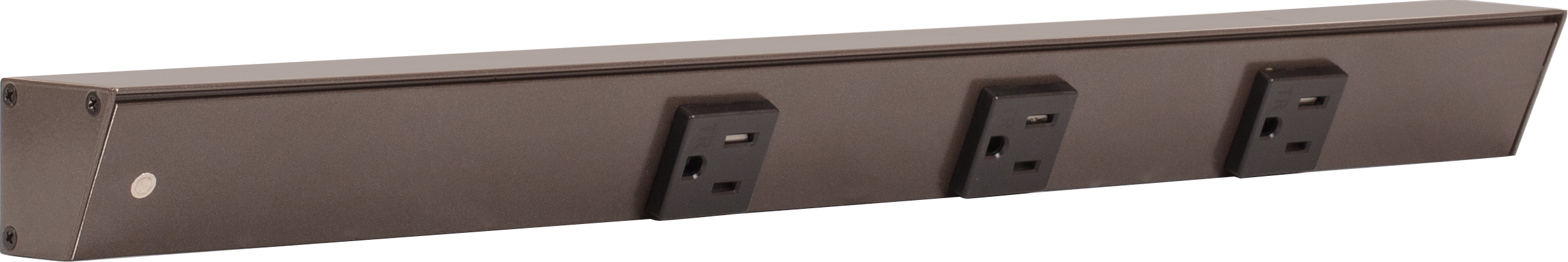 Finish Bronze Feature 1 Angled design provides easy access to outlets and tucks up under cabinet to disappear at eye level Feature 2 Very compact 1-1/2" profile Feature 3 UL listed fixtures featuring 20-amp tamper-resistant single receptacles that meet code in most markets Feature 4 Standard lengths fit standard cabinet widths for easy ordering Feature 5 Assembled in USA Feature 6 Ships assembled and ready to install, mounting hardware included Feature 7 Durable aluminum profile with a quality powder-coated finish is durable, scratch-resistant, rust-resistant Item Overall Length 18" Item Width 1-11/16" Item Height 1-1/2"