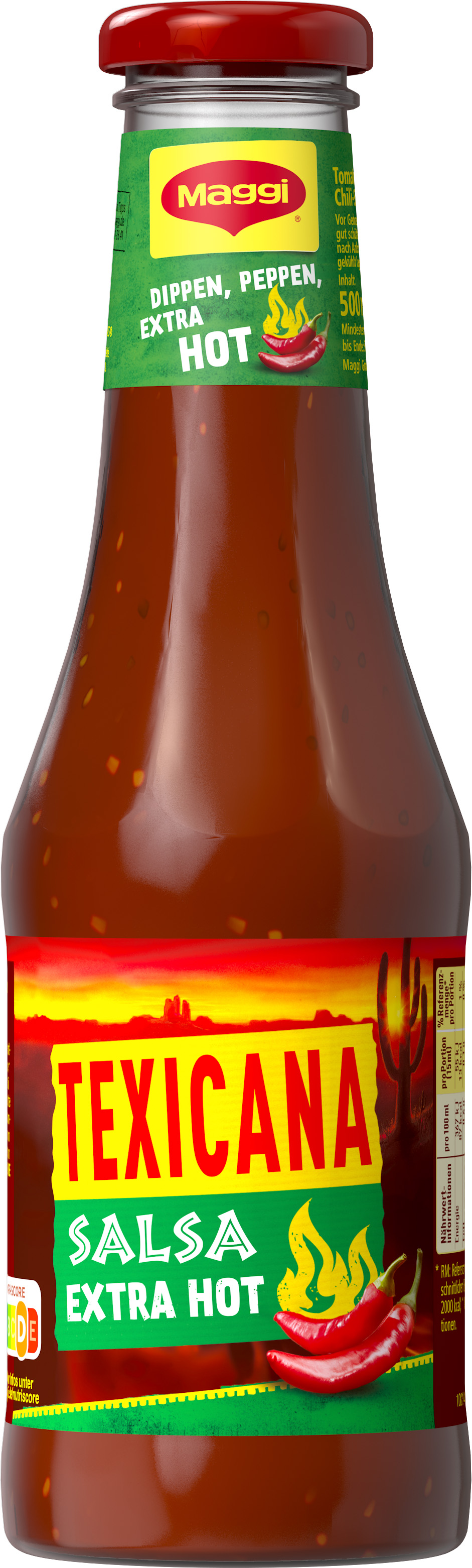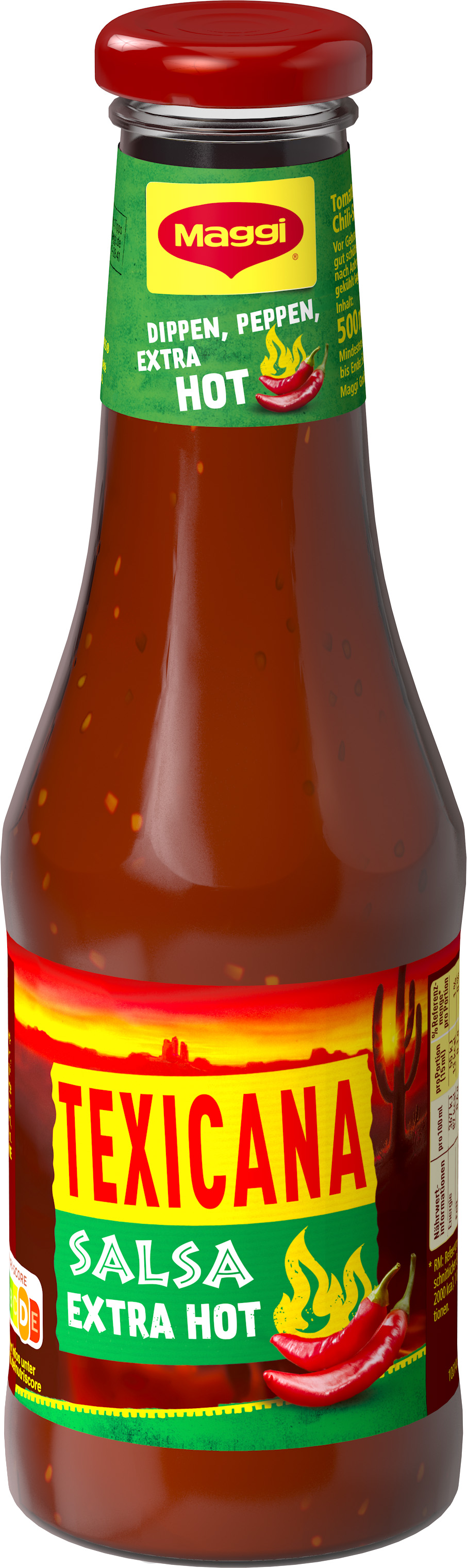 myTime Assortment Yes myTime Article Number 4502070920 myTime Product Title Maggi Texicana Salsa Extra Hot EAN 07613032747350 Material Number 12115677 Marke MAGGI Product Name MAGGI TEXICANA Salsa Extra Hot Net Content 0.5 Net Content UoM LTR Net Weight 544.75 Net Weight UoM GRM Artikel Höhe 235.000 Artikel Höhe UoM MMT Artikel Breite 72.000 Artikel Breite UoM MMT Artikel Länge 72.000 Artikel Länge UoM MMT Schlagwörter BBQ Sauce, Tortilla Chips Dip, Knorr Bezeichnung Tomaten-Chili-Sauce Beschreibung Wer es so richtig scharf mag, für den ist die Maggi Texicana Salsa Extra Hot genau das Richtige! Ob zum Dippen, Peppen oder Würzen – die scharfe Chili-Sauce darf nicht fehlen. Fruchtige Tomaten, feurige Jalapeños und knackige Paprika, pikante Zwiebeln und ein echter Tex-Mex-Gewürz-Mix verleihen der scharfen Salsa Sauce ihren einzigartigen Geschmack. Die extra-scharfe Tex-Mex-Salsa-Sauce Mit der Maggi Texicana Salsa Extra Hot bringt man die pikante Tex-Mex-Küche auf den Teller! Maggi Texicana Salsa Extra Hot eignet sich ideal für Tex-Mex-Klassiker wie Nachos, Tortillas, Tacos, Fajitas oder Quesadillas – nach Belieben mit Hackfleisch gefüllt und mit Käse überbacken. Nutze die Salsa Sauce als scharfen Dip, als Basis für den Party-Klassiker Taco-Salat oder als pikante Würzsauce. ¡Que aproveche! ¡Que aproveche! Genieße die Texicana Salsa Extra Hot zu Grillfleisch, Nachos und zu Pommes Frites. Verfeinere damit kalte und warme Lieblingsgerichte und gib Saucen, Marinaden und Suppen eine scharfe Würze. Sie schmeckt auch vorzüglich zu Schaschlik, Spießen, Pizza und Würsten. Herrlich auch als scharfer Dip für Gemüsesticks. Maggi Internationale Würzsauce Texicana Salsa Extra Hot • Feurige Tomaten-Chili-Sauce • Zum Dippen, Peppen und Würzen kalter und warmer Speisen • Mit fruchtigen Tomaten, leckerer Paprika, knackigen Zwiebeln und scharfen Jalapeño-Chilis • Ideal zum Dippen von Gemüsesticks und Nachos • Perfekt zu Grillfleisch, Steaks, Chili-Con-Carne und typisch mexikanischen Gerichten wie Tortillas Zutaten Zutaten: 45 % Tomatenmark, Branntweinessig, Trinkwasser, Zucker, 4,4 % Jalapeño-Chili, Paprika, Zwiebeln, modifizierte Stärke, Jodsalz (Salz, Kaliumiodat), Gewürze, Aromen, Verdickungsmittel Xanthan. Kann MILCH und SELLERIE enthalten.