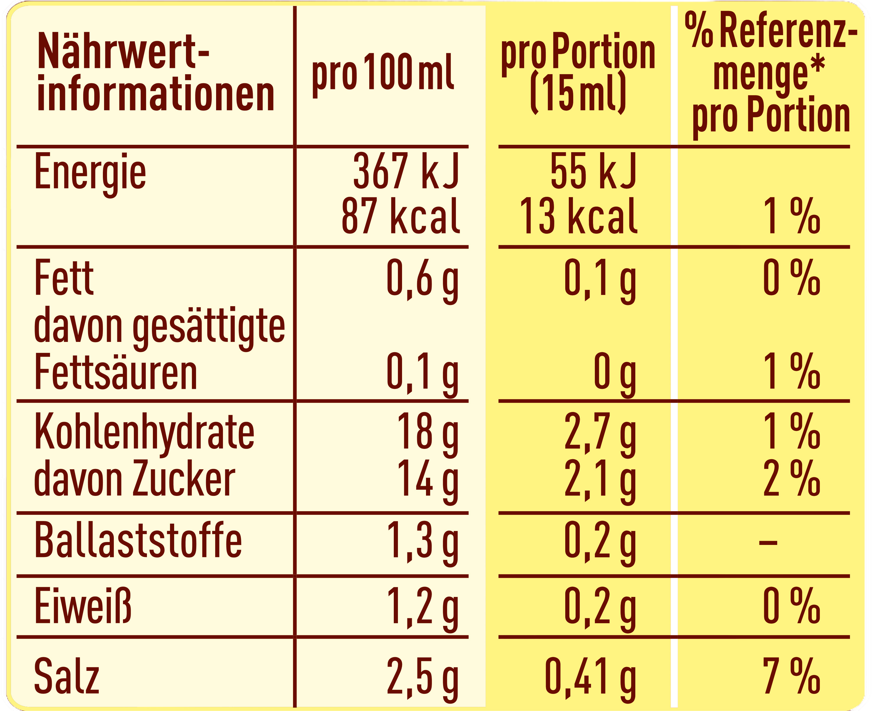 Sub Brand Name TEXICANA Brand Owner Name Société des Produits Nestlé S.A. Functional Name Salsa Extra Hot Country of Origin Germany Haltbarkeit & Lagerung Nach Anbruch gekühlt lagern. Anwendungs- & Gebrauchshinweise Vor Gebrauch gut schütteln. Dietary Regime Code VEGAN Is Diet Type Marked on Package? FALSE Dietary Regime Code [2] VEGETARIAN Is Diet Type Marked on Package? [2] FALSE Third Party Accreditation GREEN_DOT Nutritional Table 1 Zubereitungsgrad Bezugsgröße Portionsgröße Portionsgröße Beschreibung Tagesdosis Referenzwert Nährstoff: Teil von… Messgenauigkeit Nährwert % Messgenauigkeit % Referenzmenge UNPREPARED100MLTENER-EnergieAPPROXIMATELY367kJ UNPREPARED100MLTENER-EnergieAPPROXIMATELY87kCal UNPREPARED100MLTFATFettAPPROXIMATELY0.6g UNPREPARED100MLTFASATFett, davon gesättigte FettsäurenAPPROXIMATELY0.1g UNPREPARED100MLTCHOAVLKohlenhydrateAPPROXIMATELY18g UNPREPARED100MLTSUGAR-Kohlenhydrate, davon ZuckerAPPROXIMATELY14g UNPREPARED100MLTFIBTGBallaststoffeAPPROXIMATELY1.3g UNPREPARED100MLTPRO-EiweißAPPROXIMATELY1.2g UNPREPARED100MLTSALTEQSalz ÄquivalentAPPROXIMATELY2.5g Nutritional Table 2 Zubereitungsgrad Bezugsgröße Portionsgröße Portionsgröße Beschreibung Tagesdosis Referenzwert Nährstoff: Teil von… Messgenauigkeit Nährwert % Messgenauigkeit % Referenzmenge UNPREPARED1PTN15MLTpro Portion (15ml)Referenzmenge für einen durchschnittlichen Erwachsenen (8400 kJ/ 2000 kcal).ENER-EnergieAPPROXIMATELY55kJ1 UNPREPARED1PTN15MLTpro Portion (15ml)Referenzmenge für einen durchschnittlichen Erwachsenen (8400 kJ/ 2000 kcal).ENER-EnergieAPPROXIMATELY13kCal1 UNPREPARED1PTN15MLTpro Portion (15ml)Referenzmenge für einen durchschnittlichen Erwachsenen (8400 kJ/ 2000 kcal).FATFettAPPROXIMATELY0.1g0 UNPREPARED1PTN15MLTpro Portion (15ml)Referenzmenge für einen durchschnittlichen Erwachsenen (8400 kJ/ 2000 kcal).FASATFett, davon gesättigte FettsäurenAPPROXIMATELY0g1 UNPREPARED1PTN15MLTpro Portion (15ml)Referenzmenge für einen durchschnittlichen Erwachsenen (8400 kJ/ 2000 kcal).CHOAVLKohlenhydrateAPPROXIMATELY2.7g1 UNPREPARED1PTN15MLTpro Portion (15ml)Referenzmenge für einen durchschnittlichen Erwachsenen (8400 kJ/ 2000 kcal).SUGAR-Kohlenhydrate, davon ZuckerAPPROXIMATELY2.1g2 UNPREPARED1PTN15MLTpro Portion (15ml)Referenzmenge für einen durchschnittlichen Erwachsenen (8400 kJ/ 2000 kcal).FIBTGBallaststoffeAPPROXIMATELY0.2g UNPREPARED1PTN15MLTpro Portion (15ml)Referenzmenge für einen durchschnittlichen Erwachsenen (8400 kJ/ 2000 kcal).PRO-EiweißAPPROXIMATELY0.2g0 UNPREPARED1PTN15MLTpro Portion (15ml)Referenzmenge für einen durchschnittlichen Erwachsenen (8400 kJ/ 2000 kcal).SALTEQSalz ÄquivalentAPPROXIMATELY0.41g7 Contact Maggi GmbH Contact Address 78221 Singen (Hohentwiel)