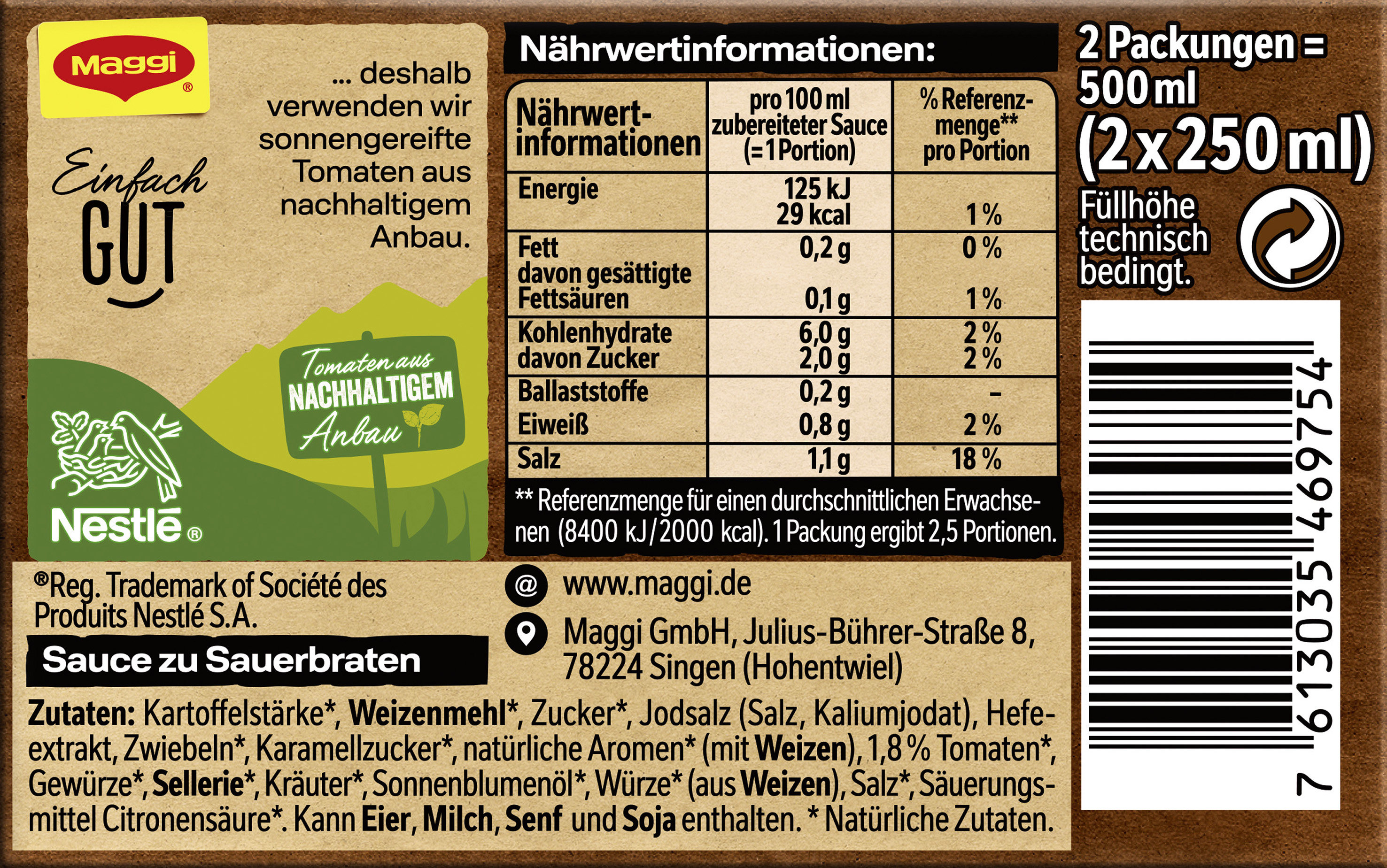 myTime Assortment Yes myTime Article Number 4502070565 myTime Product Title Maggi Sauce zu Sauerbraten EAN 07613035469754 Material Number 12297890 Marke MAGGI Product Name MAGGI Sauce Sauerbraten Multipack, ergibt 500ml Net Content Statement 2 x 250 ml Net Content 0.5 Net Content UoM LTR Net Weight 44 Net Weight UoM GRM Artikel Höhe 63.000 Artikel Höhe UoM MMT Artikel Breite 99.000 Artikel Breite UoM MMT Artikel Länge 37.000 Artikel Länge UoM MMT Schlagwörter Fertigsauce, Fleischsauce, Knorr Bezeichnung Sauce zu Sauerbraten Beschreibung Leckere Fleischgerichte gelingen am besten mit guten Zutaten und viel Freude am Kochen. Richtig perfekt wird das Gericht mit einer leckeren Sauce. Die mit Sellerie, Tomate und Rosmarin fein abgeschmeckte Maggi Sauce zu Sauerbraten ist das i-Tüpfelchen für Sauerbraten und eine ideale Grundlage für individuelle Saucenkreationen. Einfache oder ausgefallene Saucenvarianten lassen sich mit ihr täglich neu verwirklichen. Die ideale Sauce zu Sauerbraten und Wildgerichten Maggi Sauce zu Sauerbraten schmeckt auch besonders gut zu Rinderbraten, Semmelknödeln, Rotkraut und allen Arten von Wildgerichten. Kartoffelklöße oder Spätzle bringen ihre fein abgeschmeckte Kombination aus Sellerie, Tomate und Rosmarin perfekt zur Geltung. Wer beim Kochen gerne eigene Ideen verwirklicht, kann Maggi Sauce zu Sauerbraten nach Belieben verfeinern und seine ganz eigene, individuelle Sauce daraus machen. Rühre einfach den Inhalt eines Einzelpäckchens in 250ml heißes Wasser oder anfallende Flüssigkeit ein. Lass die Sauce aufkochen und 1 Minute kochen. Fertig ist die Basis für die eigene Saucenkreation. Nach Belieben mit Wein, Preiselbeeren und Rosinen verfeinern. Zubereitung Zubereitung: Inhalt eines Einzelpäckchens in 250ml heißes, nicht kochendes Wasser mit dem Schneebesen einrühren. Sauce aufkochen und bei geringer Wärmezufuhr 3 Min. kochen. Gelegentlich umrühren. Tipp: Besonders lecker wirds durch Einrühren in anfallende Flüssigkeit. Zutaten Zutaten: Kartoffelstärke*, WEIZENMEHL*, Zucker*, Jodsalz (Salz, Kaliumjodat), Hefeextrakt, Zwiebeln*, Karamellzucker*, natürliche Aromen* (mit WEIZEN), 1,8% Tomaten*, Gewürze*, SELLERIE*, Kräuter*, Sonnenblumenöl*, Würze* (aus WEIZEN), Salz*, Säuerungsmittel Citronensäure*. Kann EIER, MILCH, SENF und SOJA enthalten. *Natürliche Zutaten.
