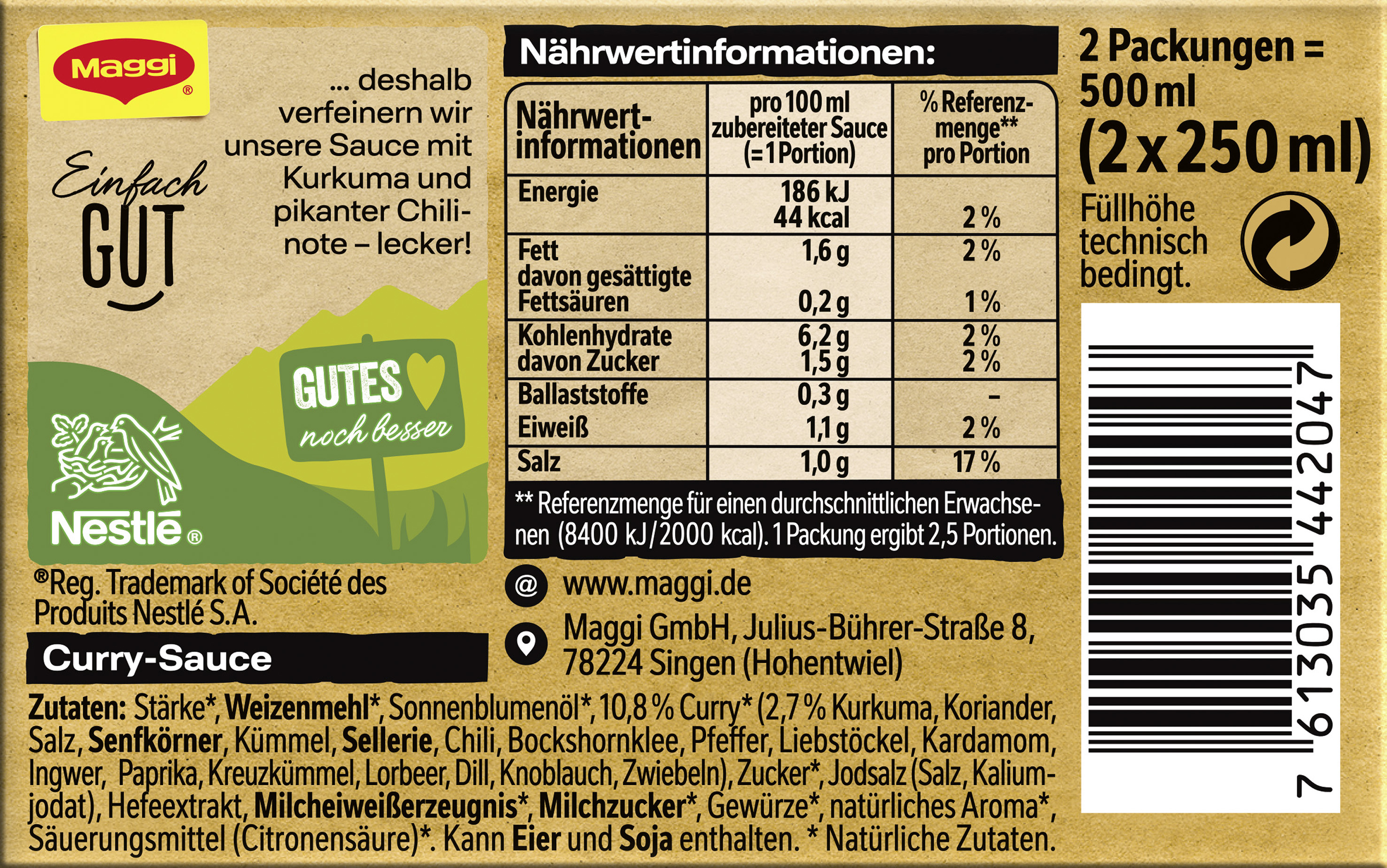 myTime Assortment Yes myTime Article Number 4502070387 myTime Product Title Maggi Currysauce EAN 07613035442047 Material Number 12296394 Marke MAGGI Product Name MAGGI Currysauce 2er Multipack, ergibt 500ml Net Content Statement 2 x 250 ml Net Content 0.5 Net Content UoM LTR Net Weight 54 Net Weight UoM GRM Artikel Höhe 63.000 Artikel Höhe UoM MMT Artikel Breite 99.000 Artikel Breite UoM MMT Artikel Länge 37.000 Artikel Länge UoM MMT Schlagwörter Fertigsauce, Curry Gewürz, Knorr Bezeichnung Curry-Sauce Beschreibung Lust auf orientalisch? Wie wäre es mit einem leckeren Gericht mit Currysauce? Die Maggi Curry Sauce ist besonders aromatisch durch Kurkuma, Ingwer und Koriander und sehr lecker zu vielen Gemüse-, Fisch- und Fleischgerichten. Currysauce für Currywurst und Wokgerichte Maggi Curry Sauce eignet sich hervorragend für kreative Experimente in der Küche. Durch exotische Gewürze wie Kurkuma, Ingwer und Koriander ist sie die ideale Sauce für ein indisches Curry oder asiatische Wokgerichte. Doch auch zu Reis, Gemüsegerichten, zur Currywurst oder zu Fisch und Garnelen schmeckt die Currysauce sehr lecker. Probiere auch eigene individuelle Saucenvarianten aus und peppe die Sauce mit weiteren Zutaten auf! Rühre einfach den Inhalt eines Einzelpäckchens mit dem Schneebesen in 250ml heißes, nicht kochendes Wasser oder anfallende Flüssigkeit ein. Sauce aufkochen und 3 Minuten lang kochen lassen. Kombiniere die Sauce nach Belieben mit Orangensaft, Kokosflocken oder Sahne. Zubereitung Zubereitung: Inhalt eines Einzelpäckchens in 250 ml heißes, nicht kochendes Wasser mit dem Schneebesen einrühren. Sauce aufkochen und bei geringer Wärmezufuhr 3 Min. kochen. Gelegentlich umrühren. Tipp: Besonders lecker wirds durch Einrühren in anfallende Flüssigkeit. Zutaten Zutaten: Stärke*, WEIZENMEHL*, Sonnenblumenöl*, 10,8% Curry* (2,7% Kurkuma, Koriander, Salz, SENFKÖRNER, Kümmel, SELLERIE, Chili, Bockshornklee, Pfeffer, Liebstöckel, Kardamom, Ingwer, Paprika, Kreuzkümmel, Lorbeer, Dill, Knoblauch, Zwiebeln), Zucker*, Jodsalz (Salz, Kaliumjodat), Hefeextrakt, MILCHEIWEISSERZEUGNIS*, MILCHZUCKER*, Gewürze*, natürliches Aroma*, Säuerungsmittel (Citronensäure)*. Kann EIER und SOJA enthalten. *Natürliche Zutaten.
