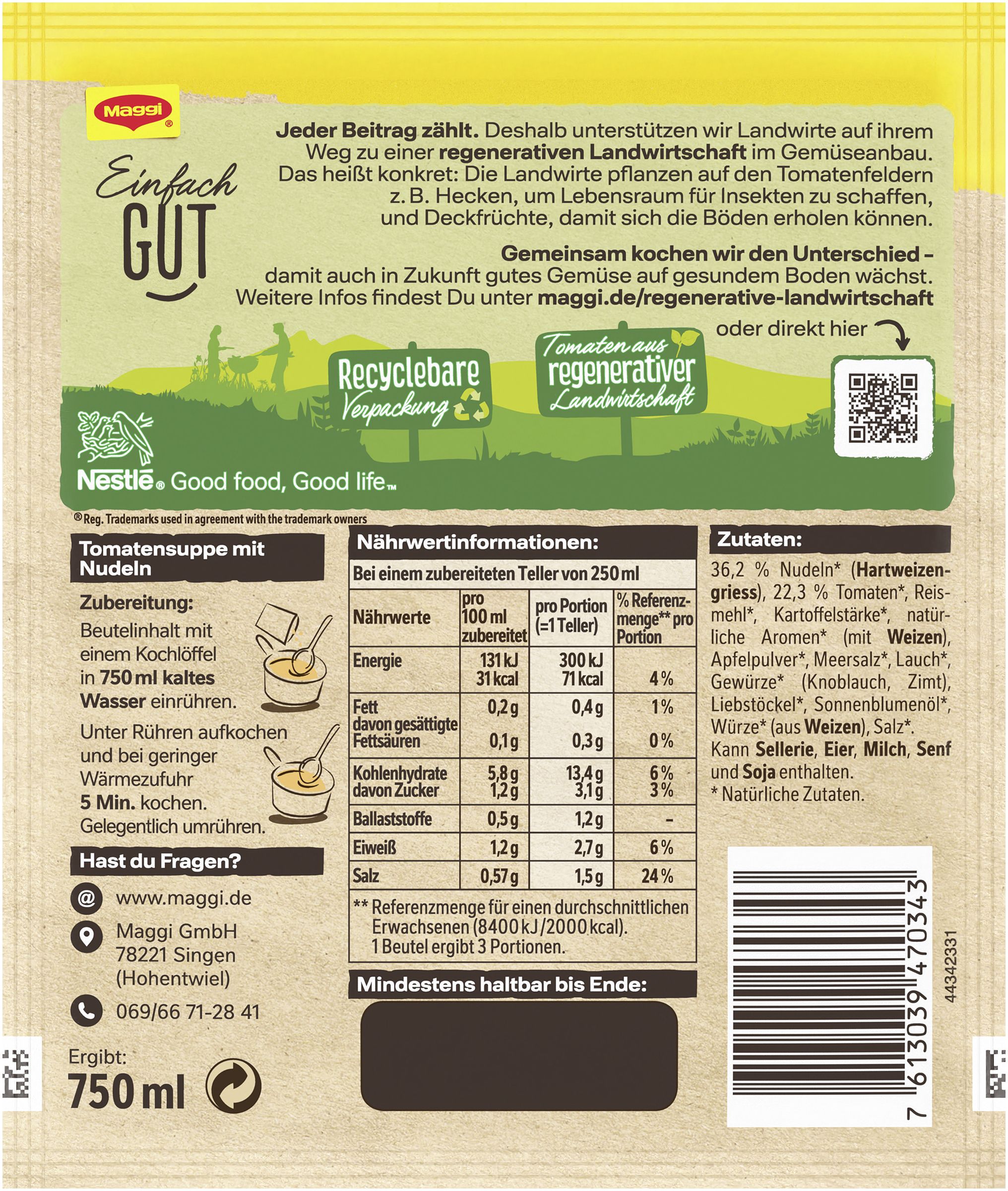 myTime Assortment Yes myTime Article Number 4502070349 myTime Product Title Maggi Guten Appetit Gespenster Suppe EAN 07613039470343 Material Number 12444261 Marke MAGGI Product Name MAGGI GUTEN APPETIT Gespenster Suppe,ergibt 750ml Net Content 750 Net Content UoM MLT Net Weight 69 Net Weight UoM GRM Artikel Höhe 150.000 Artikel Höhe UoM MMT Artikel Breite 127.000 Artikel Breite UoM MMT Artikel Länge 17.000 Artikel Länge UoM MMT Bezeichnung Tomatensuppe mit Nudeln Beschreibung Jeder Beitrag zählt. Deshalb unterstützen wir Landwirte auf ihrem Weg zu einer regenerativen Landwirtschaft im Gemüseanbau. Das heißt konkret: Die Landwirte pflanzen auf den Tomatenfeldern z.B. Hecken, um Lebensraum für Insekten zu schaffen, und Deckfrüchte, damit sich die Böden erholen können. Zubereitung Zubereitung: Beutelinhalt mit einem Kochlöffel in 750 ml kaltes Wasser einrühren. Unter Rühren aufkochen und bei geringer Wärmezufuhr 5 Min. kochen. Gelegentlich umrühren. Zutaten Zutaten: 36,2 % Nudeln* (HARTWEIZENGRIESS), 22,3 % Tomaten*, Reismehl*, Kartoffelstärke*, natürliche Aromen* (mit WEIZEN), Apfelpulver*, Meersalz*, Lauch*, Gewürze* (Knoblauch, Zimt), Liebstöckel*, Sonnenblumenöl*, Würze* (aus WEIZEN), Salz*. Kann SELLERIE, EIER, MILCH, SENF und SOJA enthalten. *Natürliche Zutaten.