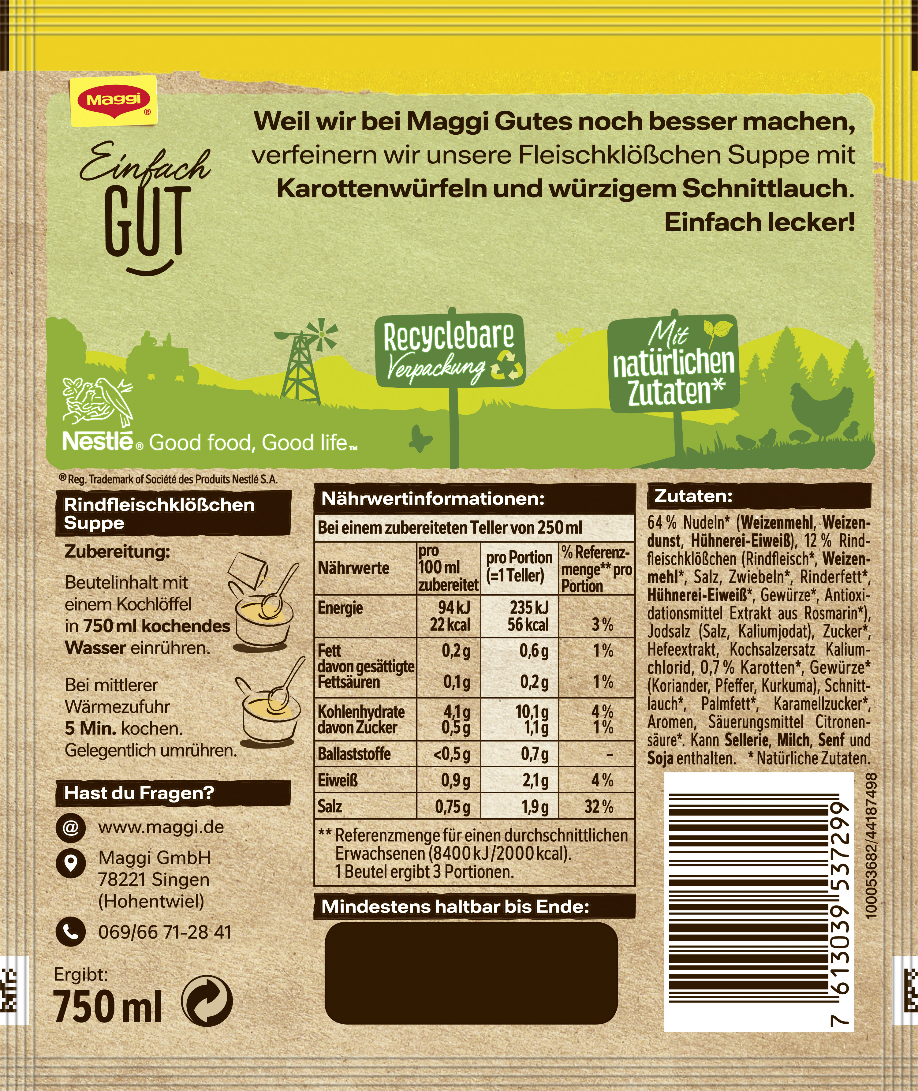 myTime Assortment Yes myTime Article Number 4502070348 myTime Product Title Maggi Guten Appetit Fleischklößchen Suppe EAN 07613039537299 Material Number 12445276 Marke MAGGI Product Name MAGGI GUTEN APPETIT Fleischklößchen Suppe, ergibt 750ml Net Content 750 Net Content UoM MLT Net Weight 50 Net Weight UoM GRM Artikel Höhe 150.000 Artikel Höhe UoM MMT Artikel Breite 127.000 Artikel Breite UoM MMT Artikel Länge 18.000 Artikel Länge UoM MMT Schlagwörter Tütensuppe, Fertigsuppe, Knorr Bezeichnung Rindfleischklößchen Suppe Beschreibung Wer Fleischsuppen mag, wird die Maggi Guten Appetit Fleischklößchen Suppe lieben. Dieses Suppenrezept ist ein echter Klassiker! Die herzhafte Fleischsuppe mit würzigen Rindfleischklößchen und Nudeln begeistert Jung und Alt. In wenigen Minuten ist die leckere Fleischklößchensuppe fertig und kann von hungrigen Suppenfans verspeist werden! Fleischklößchensuppe einfach zubereiten Rühre einfach den Beutelinhalt in 750 ml kaltes Wasser ein. Lass das Ganze unter Rühren aufkochen und bei mittlerer Wärmezufuhr für ca. 5 Minuten kochen. Dabei gelegentlich umrühren und fertig sind drei Teller der herzhaft-leckeren Fleischklößchensuppe. Unser Guten-Appetit-Tipp: Bestreue die Suppe mit 1 EL gehackter Petersilie für eine frische Kräuternote! Weitere kreative und leckere Rezeptideen gibt’s auf maggi.de. Zubereitung Zubereitung: Beutelinhalt mit einem Kochlöffel in 750 ml kochendes Wasser einrühren. Bei mittlerer Wärmezufuhr 5 Min. kochen. Gelegentlich umrühren. Zutaten Zutaten: 64 % Nudeln* (WEIZENMEHL, WEIZENDUNST, HÜHNEREI-EIWEISS), 12 % Rindfleischklößchen (Rindfleisch*, WEIZENMEHL*, Salz, Zwiebeln*, Rinderfett*, HÜHNEREI-EIWEISS*, Gewürze*, Antioxidationsmittel Extrakt aus Rosmarin*), Jodsalz (Salz, Kaliumjodat), Zucker*, Hefeextrakt, Kochsalzersatz Kaliumchlorid, 0,7 % Karotten*, Gewürze* (Koriander, Pfeffer, Kurkuma), Schnittlauch*, Palmfett*, Karamellzucker*, Aromen, Säuerungsmittel Citronensäure*. Kann SELLERIE, MILCH, SENF und SOJA enthalten. *Natürliche Zutaten.