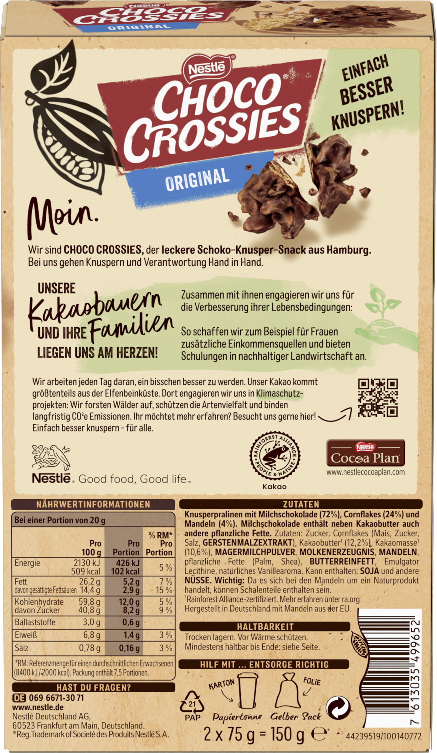 myTime Assortment Yes myTime Article Number 4502037136 myTime Product Title Nestlé Choco Crossies Classic EAN 07613035499652 Material Number 12413681 Marke NESTLE Product Name NESTLE CHOCO CROSSIES CLASSIC 150g Net Content Statement 2 x 75 g Net Content 150 Net Content UoM GRM Net Weight 150 Net Weight UoM GRM Artikel Höhe 110.000 Artikel Höhe UoM MMT Artikel Breite 188.000 Artikel Breite UoM MMT Artikel Länge 41.000 Artikel Länge UoM MMT Schlagwörter mandeln, flake, schokolade, crossi, schoko crossis, flakes, schokolade, schoko crispies, chocolate nestle, nestle, chocolate chips, schokoflakes, choco chips, schoko chips, chococrossies, flakes, chocolate flakes mit schokolade, schoko crossies Bezeichnung Knusperpralinen mit Milchschokolade (72%), Cornflakes (24%) und Mandeln (4%). Beschreibung CHOCO CROSSIES Original Lass es knuspern! Krosse Flakes und knackige Mandeln, umhüllt von zartschmelzender Milchschokolade. Der unverwechselbare Nestlé-Klassiker CHOCO CROSSIES Original lässt die Herzen aller Fans schokoladiger Knusper-Erlebnisse höher schlagen. • Unser unverwechselbarer Klassiker mit knusprigen Flakes und knackigen Mandeln in zarter Milchschokolade • Durch die Kombination von Schokoladigkeit und Knusprigkeit ist richtig was los im Mund • Schokoladiger Knusperspaß für Groß und Klein • 100% Kakao aus nachhaltiger Beschaffung: Schokolade aus Rainforest Alliance-zertifizierten Kakao hergestellt Zutaten Zutaten: Zucker, Cornflakes (Mais, Zucker, Salz, GERSTENMALZEXTRAKT), Kakaobutter* (12,2%), Kakaomasse* (10,6%), MAGERMILCHPULVER, MOLKENERZEUGNIS, MANDELN, pflanzliche Fette (Palm, Shea), BUTTERREINFETT, Emulgator Lecithine, natürliches Vanillearoma. Kann enthalten: SOJA und andere NÜSSE.