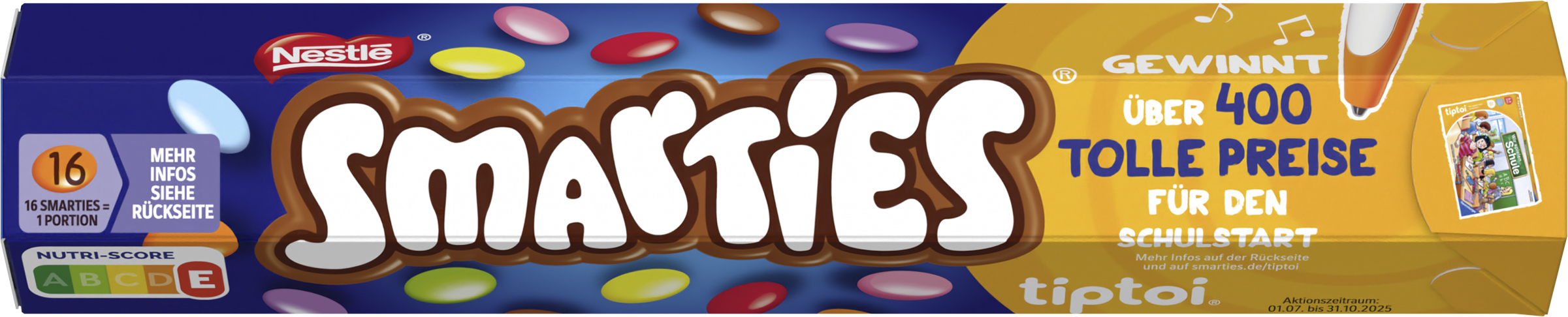 myTime Assortment Yes myTime Article Number 4502038240 EAN 00000040345512 Material Number 12540164 Marke NESTLE Product Name NESTLE SMARTIES Riesenrolle 130g Net Content 130.000 Net Content UoM GRM Net Weight 130 Net Weight UoM GRM Artikel Höhe 40.000 Artikel Höhe UoM MMT Artikel Breite 191.000 Artikel Breite UoM MMT Artikel Länge 40.000 Artikel Länge UoM MMT Schlagwörter Kindergeburtstag, Geburtstag, Schokolinsen, Schokolade, Überraschung, bunt, ohne Farbstoffe, Torte, süß, Muffins, Kuchen, Dekoration, Natur, Nestlé Cocoa Plan, Rainforest Alliance, zertifizierter Kakao, Papierverpackung, recyclebar, nachhaltige Schokolade, backen Bezeichnung Schokolinsen (65% Milchschokolade) mit Zuckerüberzug. Beschreibung SMARTIES Schokolinsen sind nicht nur schokoladig-lecker und fröhlich-bunt, sondern bieten zusätzlich großen Spielspaß. Unverkennbar in der klassischen Riesenrolle, eignen sich SMARTIES perfekt als kleines Geschenk oder zum Teilen. Mit bunten Farben aus der Natur, ohne Aromen und Zusatzstoffe und in recyclebarer Verpackung. Zutaten Zutaten: Zucker, MAGERMILCHPULVER, Kakaomasse*, Kakaobutter*, Glukosesirup, WEIZENMEHL, MOLKENERZEUGNIS, BUTTERREINFETT, pflanzliche Fette (Palm, Shea), Stärke, Emulgator Lecithine, Farbstoff (Betenrot, Carotin, Kurkumin), Spirulinakonzentrat, Überzugsmittel (Carnaubawachs, Bienenwachs weiß), Pflanzenkonzentrate (Färberdistel, Rettich) GERSTENMALZEXTRAKT.
