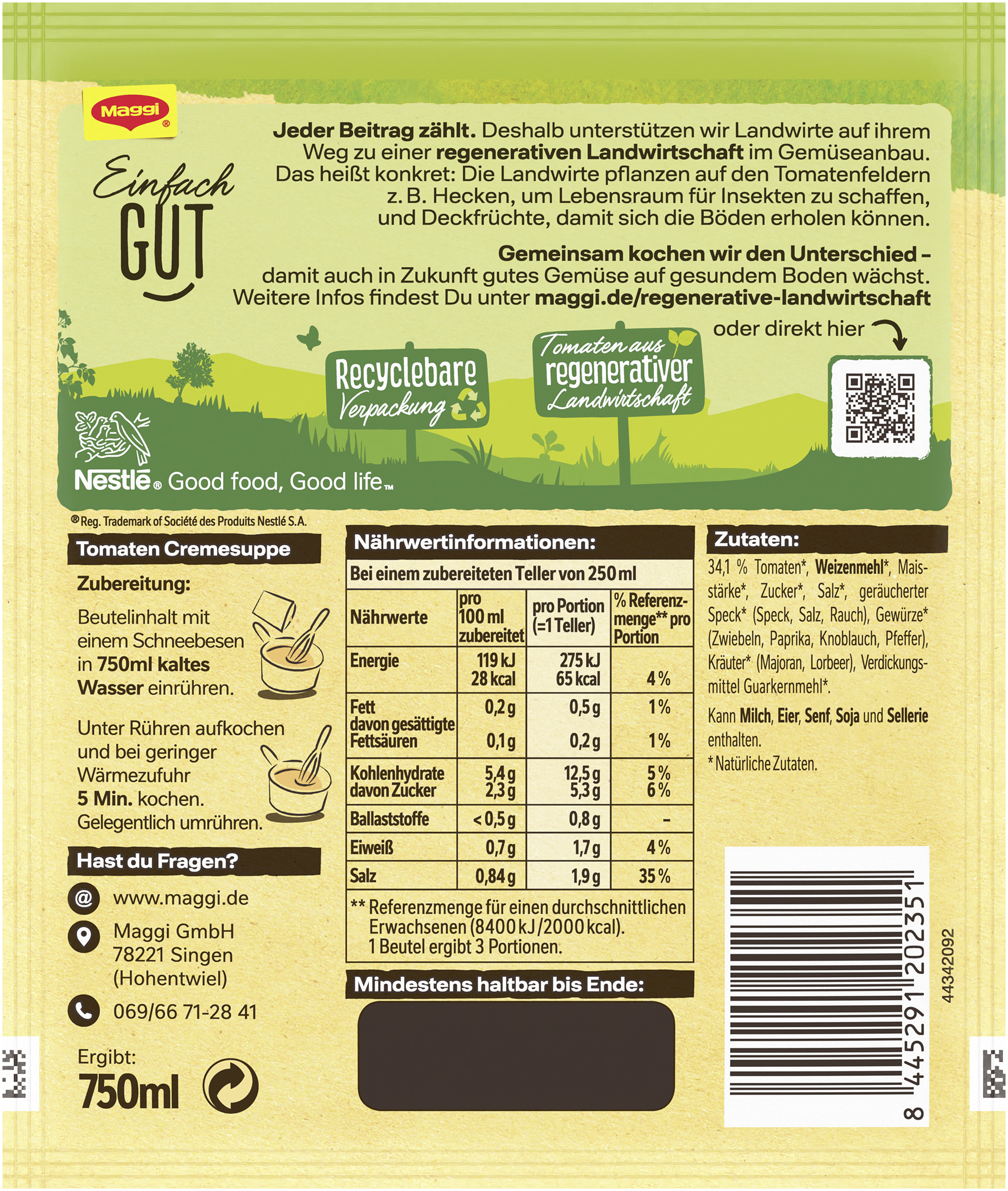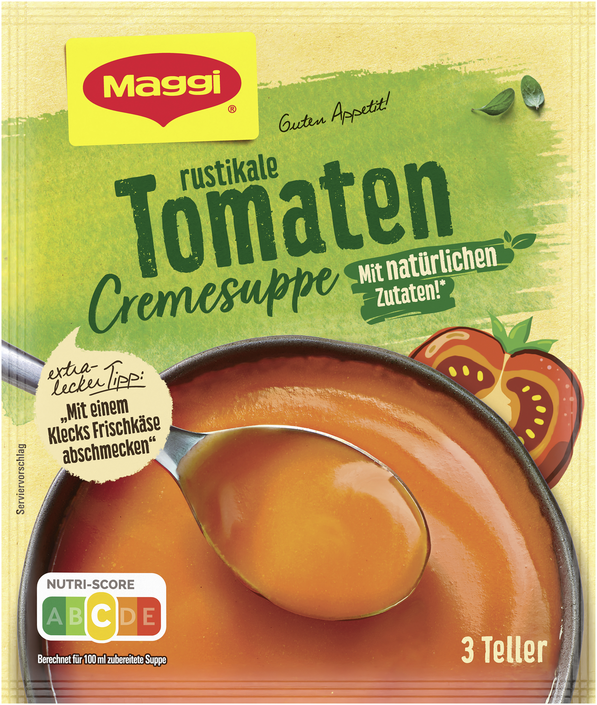myTime Assortment Yes myTime Article Number 4502070326 myTime Product Title Maggi Guten Appetit Tomaten Cremesuppe EAN 08445291202351 Material Number 12582365 Marke MAGGI Product Name MAGGI GUTEN APPETIT Suppe Tomaten Creme, ergibt 750ml Net Content 750 Net Content UoM MLT Net Weight 63 Net Weight UoM GRM Artikel Höhe 150.000 Artikel Höhe UoM MMT Artikel Breite 127.000 Artikel Breite UoM MMT Artikel Länge 13.000 Artikel Länge UoM MMT Schlagwörter Tütensuppe, Fertigsuppe, Knorr Bezeichnung Tomaten Cremesuppe Beschreibung Lust auf eine cremige italienische Tomatensuppe mit feiner Specknote? Dann ist die Maggi Guten Appetit Tomaten Cremesuppe genau das Richtige! Ob original, als Tomatensuppe mit Reis oder aufgepeppt mit regionalen Kräutern, Gewürzen, Crème fraîche oder Croutons – einfach lecker! Italienische Tomatensuppe schnell und einfach zubereiten Rühre den Beutelinhalt in 750 ml kaltes Wasser ein. Lass das Ganze unter Rühren aufkochen und bei geringer Wärmezufuhr für etwa 5 Minuten kochen. Rühre dabei gelegentlich um. Schon sind drei Teller der Tomaten Cremesuppe mit feiner Specknote fertig! Unser Guten-Appetit-Tipp: Serviere die Tomatensuppe mit Reis oder mit 50 ml angeschlagener Sahne und etwas gehacktem Basilikum. Die Maggi Guten Appetit Tomaten Cremesuppe geht immer! An kalten und regnerischen Tagen ist die fruchtige Suppe besonders lecker. Aber auch an heißen Sommertagen wird sie der ganzen Familie schmecken. Man kann die Tomatensuppe heiß und mit Reis servieren oder kalt im Stil einer Gazpacho. Eine echte Erfrischung an heißen Sommertagen! Maggi Guten Appetit Tomaten Cremesuppe • Dafür wird benötigt: ein Topf, ein Kochlöffel und 750 ml Wasser • Ergibt drei Teller leckere Tomatencremesuppe • Fruchtig-cremige Tomatensuppe mit feiner Specknote • Einfach und schnell zuzubereiten • Guten-Appetit-Tipp: Mit 50 ml angeschlagener Sahne und gehacktem Basilikum servieren Zubereitung Zubereitung: Beutelinhalt mit einem Schneebesen in 750 ml kaltes Wasser einrühren. Unter Rühren aufkochen und bei geringer Wärmezufuhr 5 Min. kochen. Gelegentlich umrühren. Zutaten Zutaten: 34,1 % Tomaten*, WEIZENMEHL*, Maisstärke*, Zucker*, Salz*, geräucherter Speck* (Speck, Salz, Rauch), Gewürze* (Zwiebeln, Paprika, Knoblauch, Pfeffer), Kräuter* (Majoran, Lorbeer), Verdickungsmittel Guarkernmehl*. Kann MILCH, EIER, SENF, SOJA und SELLERIE enthalten.