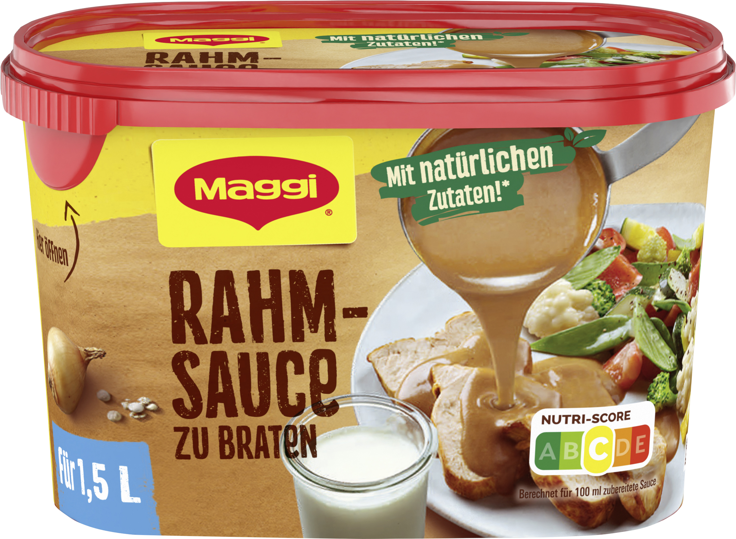 myTime Assortment Yes myTime Article Number 4502070396 myTime Product Title Maggi Rahmsauce zu Braten EAN 04005500037927 Material Number 11892023 Marke MAGGI Product Name MAGGI Rahmsauce zu Braten, ergibt 1,5 Liter Net Content 1.5 Net Content UoM LTR Net Weight 192 Net Weight UoM GRM Artikel Höhe 86.000 Artikel Höhe UoM MMT Artikel Breite 132.000 Artikel Breite UoM MMT Artikel Länge 65.000 Artikel Länge UoM MMT Schlagwörter Fertigsauce, Fleischsauce, Knorr Bezeichnung Rahmsauce zu Braten Beschreibung Wer zu einem saftigen Braten noch das cremige i-Tüpfelchen sucht, ist mit der Maggi Rahm-Sauce zu Braten perfekt ausgestattet. Mit der Rahmsauce werden Rahmschnitzel, Braten und viele weitere Fleischgerichte zu leckeren kulinarischen Highlights. In der praktischen Vorratsdose lässt sich die Sauce zu Braten jeden Tag aufs Neue schnell und einfach zubereiten und nach Belieben verfeinern. Cremig und lecker – Rahmsauce zu Braten Maggi Rahm-Sauce zu Braten eignet sich hervorragend zum Verlängern, Würzen und Binden eigener Saucenkreationen. Besonders lecker schmeckt die Rahmsauce zu Braten sowie zu Geschnetzeltem, Frikadellen und Medaillons. Ihr voller Geschmack durch Zwiebeln, Sahne und Pfeffer rundet die Fleischgerichte perfekt ab. Für die Zubereitung einfach 3EL Rahmsauce in 250ml heißes Wasser oder anfallende Flüssigkeit mit dem Schneebesen einrühren. Sauce aufkochen. Fertig! Damit es noch cremiger wird, am besten mit 200ml Wasser und 50ml Sahne zubereiten. Maggi Rahm-Sauce zu Braten • Voller Geschmack durch Zwiebeln, Sahne und Pfeffer • Besonders lecker zu Braten, Geschnetzeltem, Frikadellen und Medaillons • Ideal zum Verlängern, Würzen und Binden eigener Saucenideen • Besonders cremig wird es mit 200ml Wasser und 50ml Sahne • Kreative, leckere Ideen für mehr Inspiration und Abwechslung gibt’s auf den Packungen und im Rezeptbereich auf maggi.de Zubereitung Zubereitung: 3 EL Rahmsauce zu Braten in 250ml heißes, nicht kochendes Wasser mit dem Schneebesen einrühren. Sauce aufkochen und bei geringer Wärmezufuhr 3 Min. kochen. Gelegentlich umrühren. Tipp: Besonders lecker wirds durch Einrühren in anfallende Flüssigkeit. Zutaten Zutaten: WEIZENMEHL*, 22,5% SAHNEPULVER*, Stärke*, Reismehl*, Hefeextrakt, Jodsalz (Salz, Kaliumjodat), Gewürze* (4,4% Zwiebeln, weißer Pfeffer, Knoblauchpulver), natürliche Aromen* (mit WEIZEN), Karamellzucker*, Zucker*, Würze* (aus WEIZEN), Salz*, Sonnenblumenöl*, Paprikaöl*. Kann EIER, SENF, SOJA und SELLERIE enthalten. *natürliche Zutaten