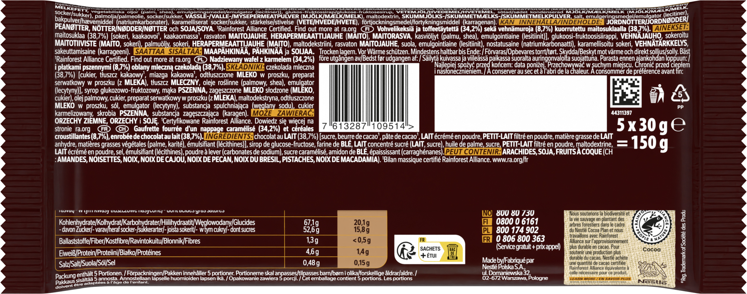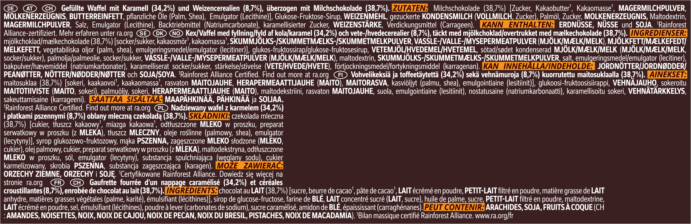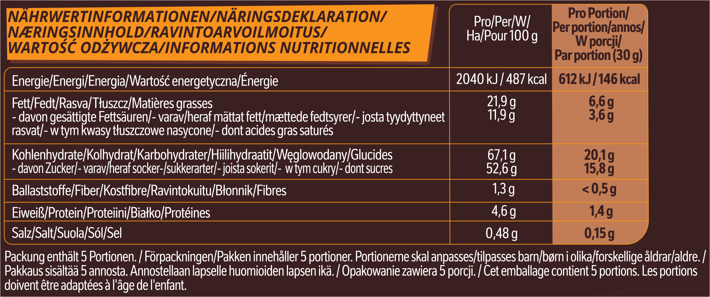 Sub Brand Name LION Brand Owner Name Société des Produits Nestlé S.A. Functional Name Knusperwaffel Country of Origin Poland Allergen Statement Magermilchpulver, Molkenerzeugnis, Butterreinfett, Weizenmehl, Kondensmilch, Vollmilch, Weizenstärke Haltbarkeit & Lagerung Trocken lagern. Vor Wärme schützen. Third Party Accreditation RAINFOREST_ALLIANCE_PEOPLE_NATURE Nutritional Table 1 Zubereitungsgrad Bezugsgröße Portionsgröße Portionsgröße Beschreibung Tagesdosis Referenzwert Nährstoff: Teil von… Messgenauigkeit Nährwert % Messgenauigkeit % Referenzmenge UNPREPARED100GRMENER-EnergieAPPROXIMATELY2040kJ UNPREPARED100GRMENER-EnergieAPPROXIMATELY487kCal UNPREPARED100GRMFATFettAPPROXIMATELY21.9g UNPREPARED100GRMFASATFett, davon gesättigte FettsäurenAPPROXIMATELY11.9g UNPREPARED100GRMCHOAVLKohlenhydrateAPPROXIMATELY67.1g UNPREPARED100GRMSUGAR-Kohlenhydrate, davon ZuckerAPPROXIMATELY52.6g UNPREPARED100GRMFIBTGBallaststoffeAPPROXIMATELY1.3g UNPREPARED100GRMPRO-EiweißAPPROXIMATELY4.6g UNPREPARED100GRMSALTEQSalz ÄquivalentAPPROXIMATELY0.48g Nutritional Table 2 Zubereitungsgrad Bezugsgröße Portionsgröße Portionsgröße Beschreibung Tagesdosis Referenzwert Nährstoff: Teil von… Messgenauigkeit Nährwert % Messgenauigkeit % Referenzmenge UNPREPARED1PTN30GRMENER-EnergieAPPROXIMATELY612kJ UNPREPARED1PTN30GRMENER-EnergieAPPROXIMATELY146kCal UNPREPARED1PTN30GRMFATFettAPPROXIMATELY6.6g UNPREPARED1PTN30GRMFASATFett, davon gesättigte FettsäurenAPPROXIMATELY3.6g UNPREPARED1PTN30GRMCHOAVLKohlenhydrateAPPROXIMATELY20.1g UNPREPARED1PTN30GRMSUGAR-Kohlenhydrate, davon ZuckerAPPROXIMATELY15.8g UNPREPARED1PTN30GRMFIBTGBallaststoffeLESS_THAN0.5g UNPREPARED1PTN30GRMPRO-EiweißAPPROXIMATELY1.4g UNPREPARED1PTN30GRMSALTEQSalz ÄquivalentAPPROXIMATELY0.15g Contact Nestlé Polska S.A. Contact Address ul. Domaniewska 32, 02-672 Warszawa