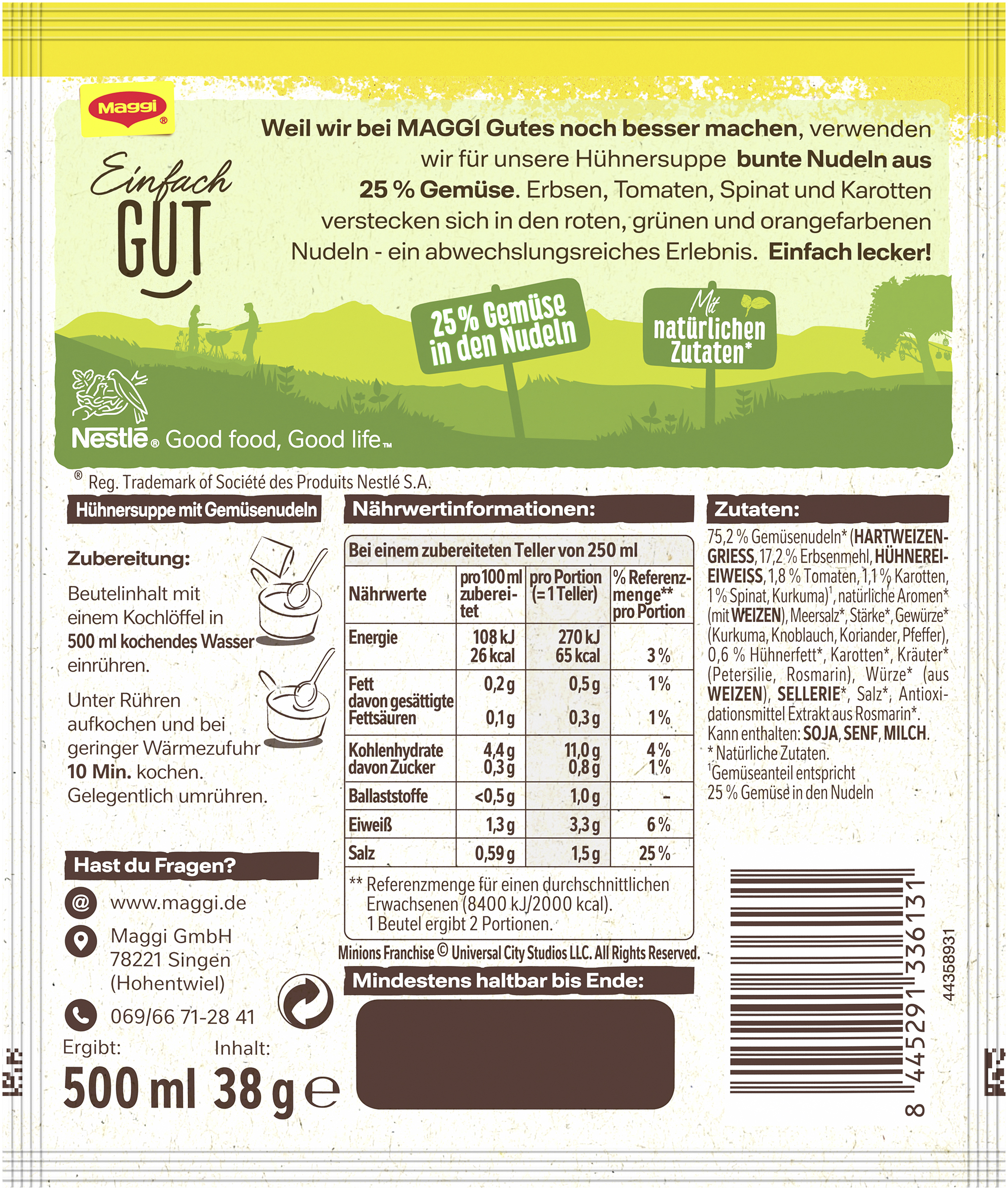 myTime Assortment Yes myTime Article Number 4502073402 myTime Product Title Maggi Guten Appetit Minions Huhn Suppe EAN 08445291336131 Material Number 12591490 Marke MAGGI Product Name MAGGI GUTEN APPETIT Suppe Minions Huhn, ergibt 500ml Net Content 500 Net Content UoM MLT Net Weight 38 Net Weight UoM GRM Artikel Höhe 150.000 Artikel Höhe UoM MMT Artikel Breite 127.000 Artikel Breite UoM MMT Artikel Länge 16.000 Artikel Länge UoM MMT Schlagwörter Tütensuppe, Fertigsuppe, Maggi, Knorr, Suppe, Fertiggericht, Herbst, Winter Bezeichnung Hühnersuppe mit Gemüsenudeln Beschreibung Genießen Sie die köstliche Minions Hühner Suppe von Maggi! Diese Suppe bietet ein unvergleichliches Geschmackserlebnis und sorgt für Spaß beim Essen. Die bunten Motivnudeln, zu 25% aus Gemüse, machen jede Portion zu einem Highlight. Erbsen, Tomaten, Spinat und Karotten verstecken sich in den roten, grünen und orangefarbenen Nudeln. Die perfekte Wahl für große und kleine Suppenfans! Rühre einen Beutelinhalt MAGGI Guten Appetit Minions Hühner Suppe mit einem Kochlöffel in 500 ml kochendes Wasser ein und lass die Nudelsuppe unter Rühren kurz aufkochen. Bei geringer Wärmezufuhr weitere 10 Minuten kochen lassen und gelegentlich umrühren. Schon sind zwei Teller der leckeren Hühner Suppe fertig! Entdecken Sie weitere kreative und köstliche Rezeptideen auf maggi.de. Zubereitung Zubereitung: Beutelinhalt mit einem Kochlöffel in 500 ml kochendes Wasser einrühren. Unter Rühren aufkochen und bei geringer Wärmezufuhr 10 Min. kochen. Gelegentlich umrühren. Zutaten Zutaten: 75,2% Gemüsenudeln* (HARTWEIZENGRIESS, 17,2% Erbsenmehl, HÜHNEREIEIWEISS, 1,8% Tomaten, 1,1% Karotten, 1% Spinat, Kurkuma)**, natürliche Aromen* (mit WEIZEN), Meersalz*, Stärke*, Gewürze* (Kurkuma, Knoblauch, Koriander, Pfeffer), 0,6% Hühnerfett*, Karotten*, Kräuter* (Petersilie, Rosmarin), Würze* (aus WEIZEN), SELLERIE*, Salz*, Antioxidationsmittel Extrakt aus Rosmarin*. Kann enthalten: SOJA, SENF, MILCH.