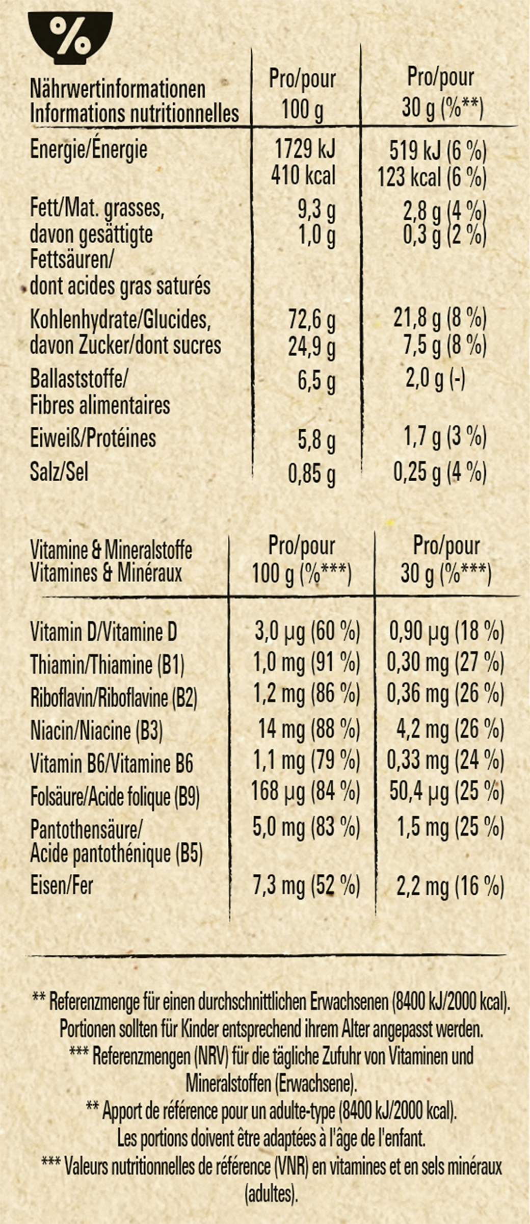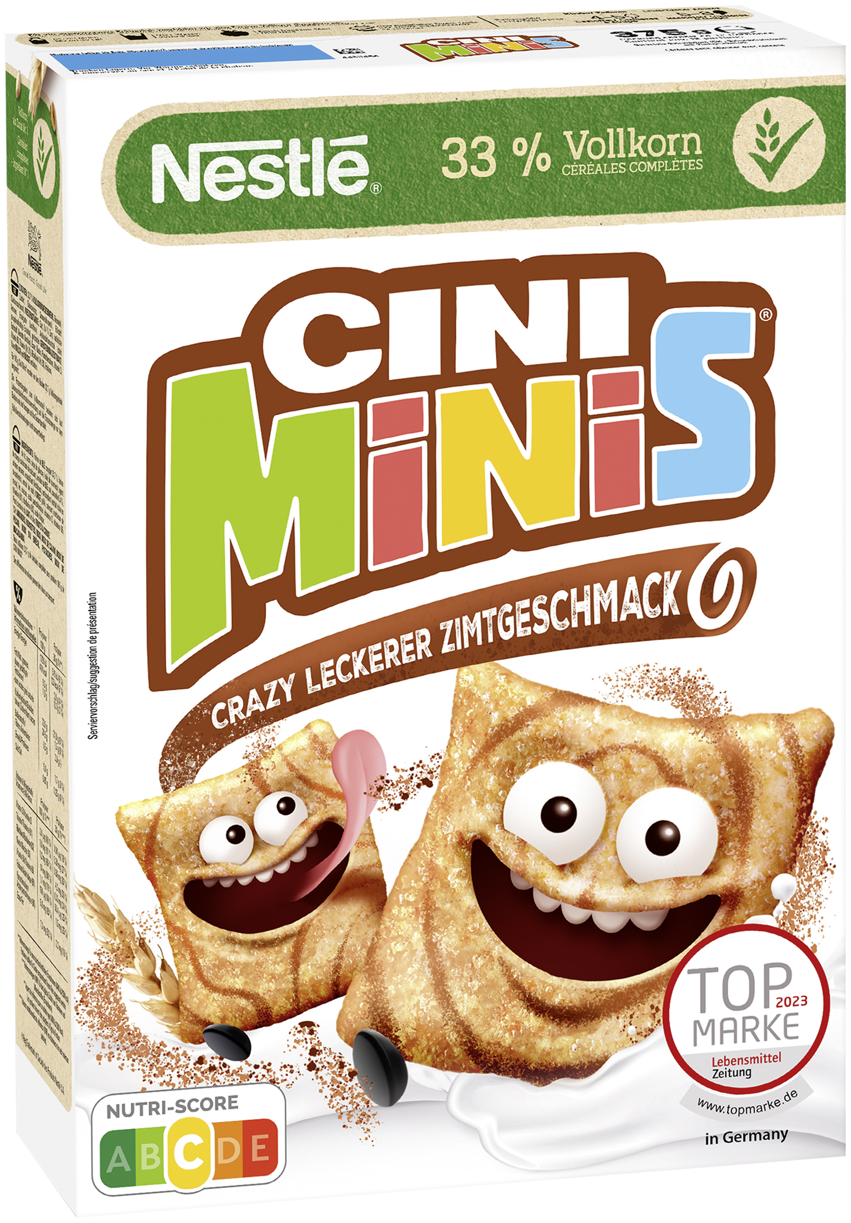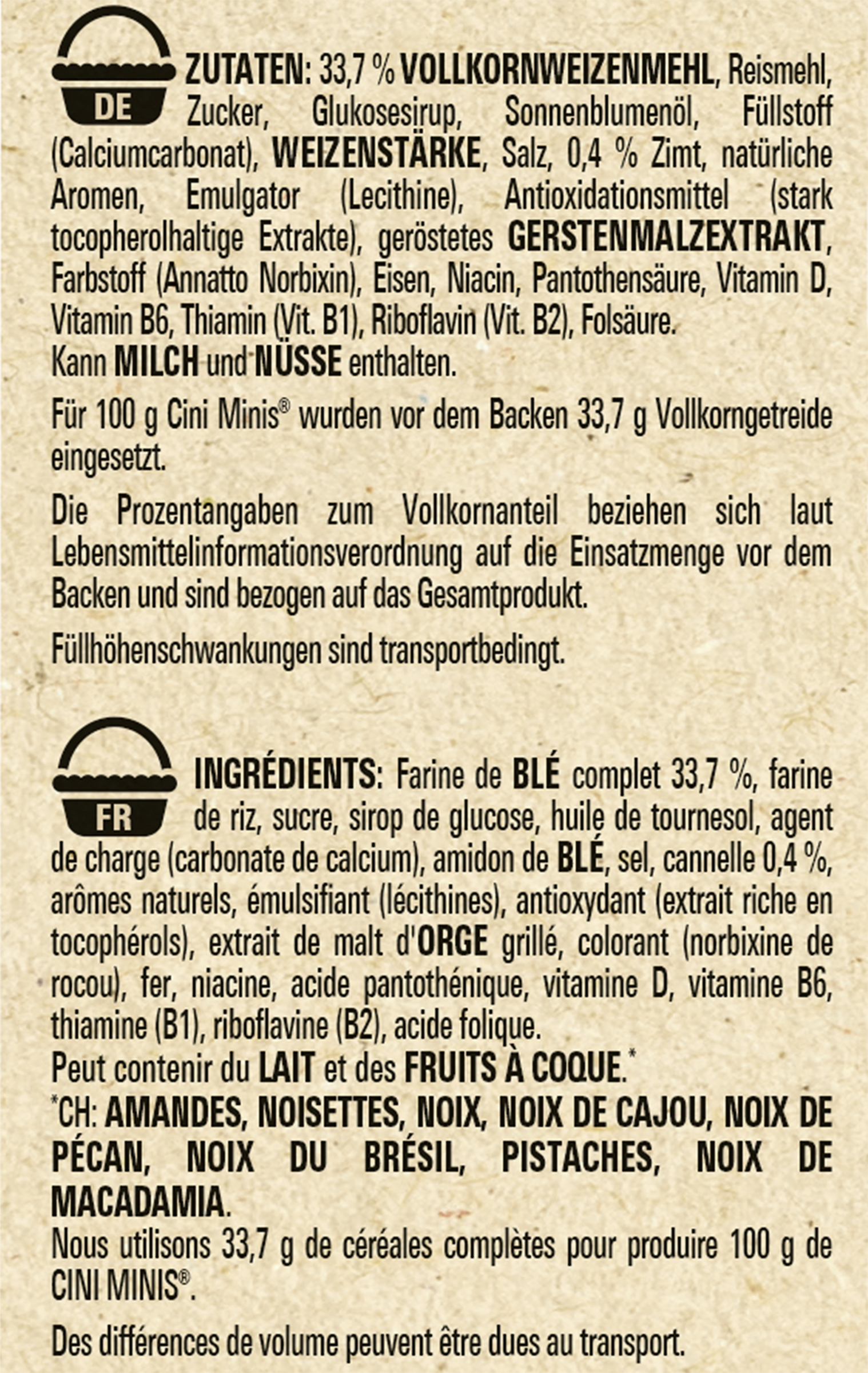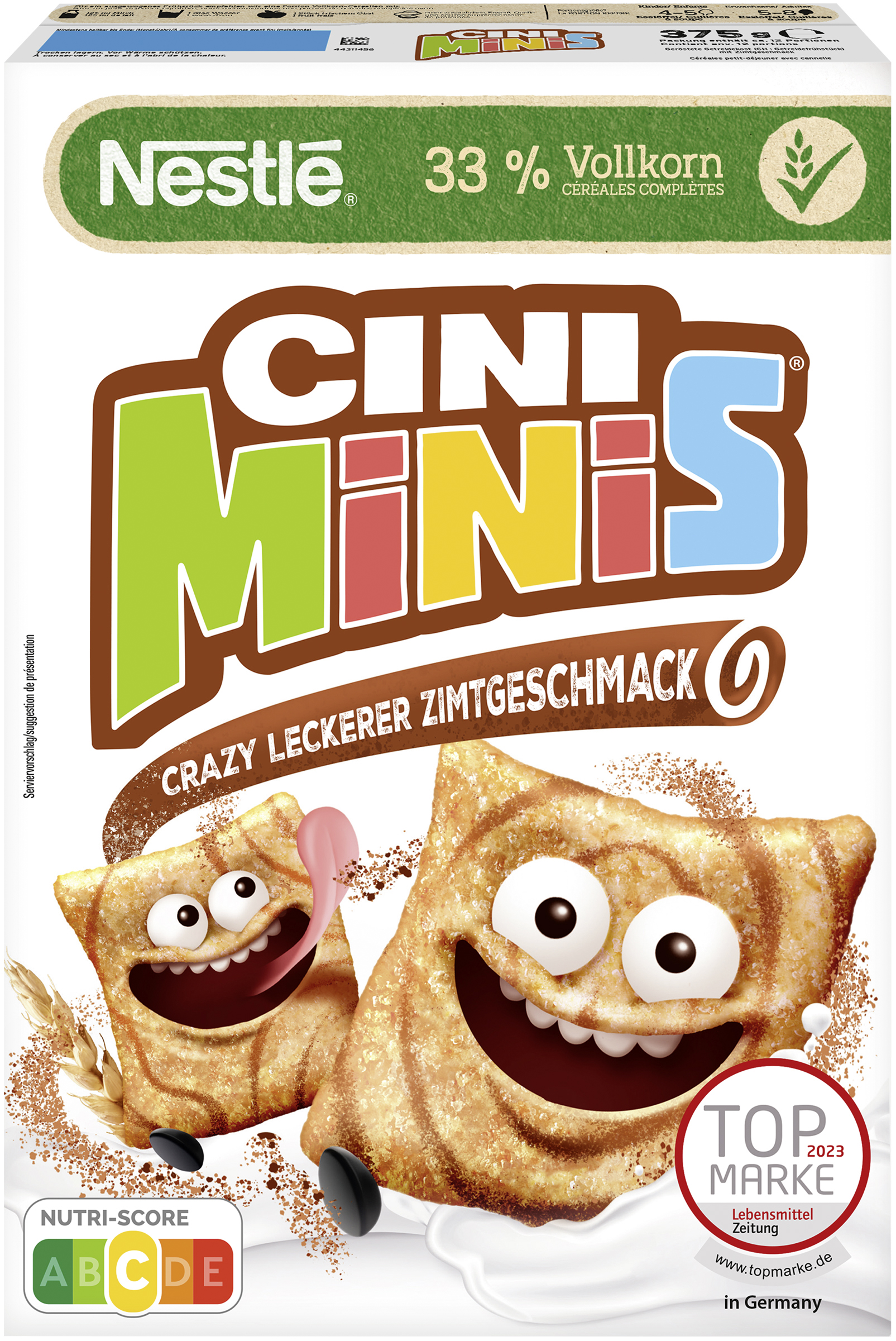 myTime Assortment Yes myTime Article Number 4502110035 myTime Product Title Nestlé Cini-Minis Cerealien EAN 03387390333008 Material Number 12282797 Marke NESTLE Product Name NESTLE CINI-MINIS Cerealien 375g Net Content 375 Net Content UoM GRM Net Weight 375 Net Weight UoM GRM Artikel Höhe 275.000 Artikel Höhe UoM MMT Artikel Breite 192.000 Artikel Breite UoM MMT Artikel Länge 52.000 Artikel Länge UoM MMT Schlagwörter frühstücksideen, Cerealien, vollkorn, süßes frühstück, Zimt, Kinderfrühstück, zimtgeschmack Bezeichnung Geröstete Getreidekost mit Zimtgeschmack Beschreibung Ein leckeres Frühstück sorgt am Morgen für den richtigen Auftakt. Mit NESTLÉ CINI MINIS und dem irre leckeren Zimtgeschmack starten Sie knusprig in den neuen Tag. Lustige Zimtwirbel auf jedem goldgelben Stückchen machen die Cerealien mit Vollkorn zum leckeren Kinderfrühstück. Geben Sie die knusprigen Cerealien mit Zimtgeschmack in eine Schüssel, Milch oder Joghurt darüber und schon sind alle anderen Frühstücksideen vergessen. NESTLÉ CINI MINIS enthalten 37% Vollkorn und viele wichtige Vitamine sowie Calcium. NESTLÉ CINI MINIS • Leckerer Zimtgeschmack. • Knusprige Cerealien aus 37% Vollkorn gebacken. • Enthält wichtige Vitamine sowie Calcium und Eisen. • Mit frischer Milch oder Joghurt schnell und einfach zubereitet. Produkte mit Vollkorn für eine ausgewogene Ernährung Beginnen Sie Ihren Tag mit einem leckeren Frühstück und genießen Sie Produkte mit Vollkorn. Zur leichten Orientierung finden Sie auf unseren NESTLÉ Cerealien Packungen ein Vollkornhäkchen, welches Ihnen Vollkorngetreide als Zutat Nr. 1 garantiert. Vollkorngetreide ist Lieferant wichtiger Nährstoffe und wird daher von Ernährungsexperten weltweit, z.B. der deutschen Gesellschaft für Ernährung, als Bestandteil einer ausgewogenen Ernährung empfohlen. Mit dem NESTLÉ Cerealien Versprechen haben wir es uns zum Ziel gemacht, die NESTLÉ Cerealien Produkte kontinuierlich zu verbessern. Wir arbeiten fortlaufend daran, sowohl den Geschmack als auch die Rezeptur aller NESTLÉ Cerealien weiter zu optimieren. Zutaten Zutaten: 33,7% VOLLKORNWEIZENMEHL, Reismehl, Zucker, Glukosesirup, Sonnenblumenöl, Füllstoff (Calciumcarbonat), WEIZENSTÄRKE, Salz, 0,4% Zimt, natürliche Aromen, Emulgator (Lecithine), Antioxidationsmittel (stark tocopherolhaltige Extrakte), geröstetes GERSTENMALZEXTRAKT, Farbstoff (Annatto Norbixin), Eisen, Niacin, Pantothensäure, Vitamin D, Vitamin B6, Thiamin (Vit. B1), Riboflavin (Vit. B2), Folsäure. Kann MILCH und NÜSSE enthalten.