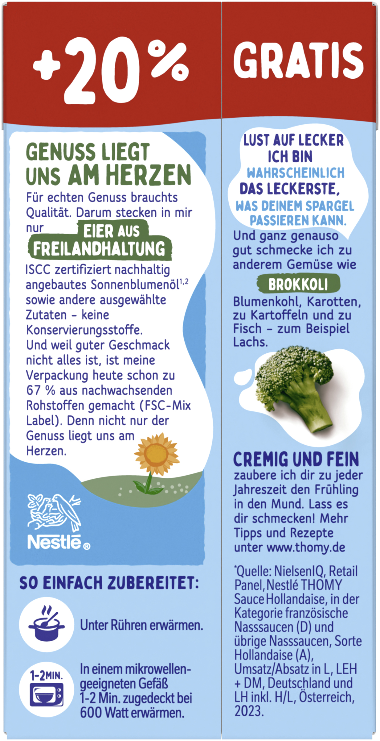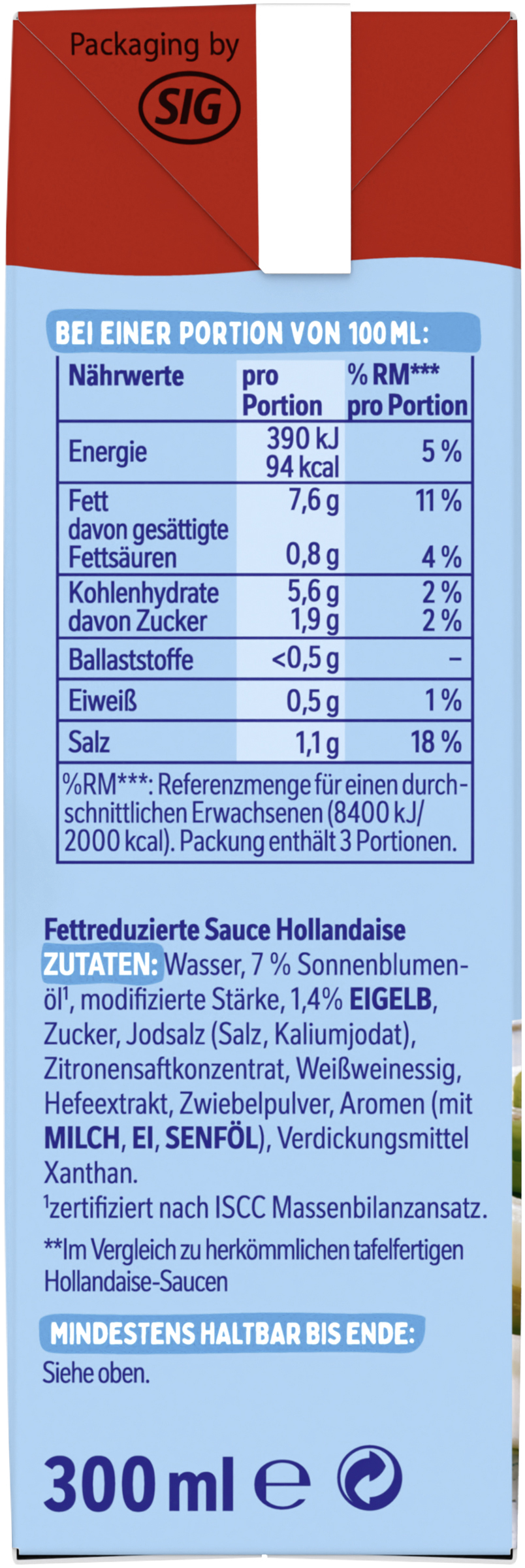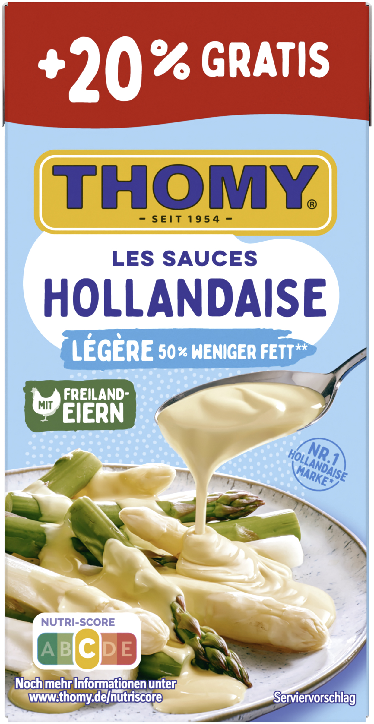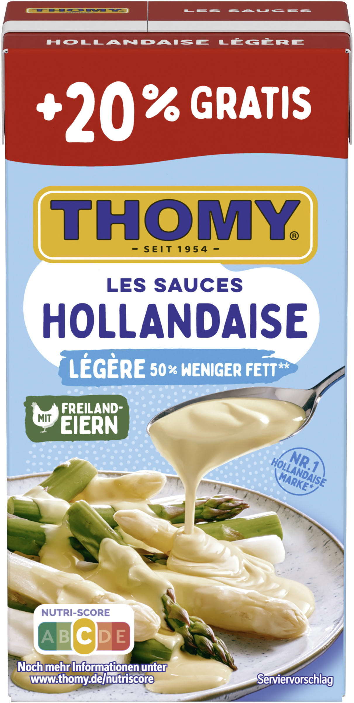 myTime Assortment Yes myTime Article Number 4502081141 myTime Product Title Thomy Les Sauces Hollandaise Légère EAN 00000040114309 Material Number 12016399 Marke THOMY Product Name THOMY LES SAUCES Hollandaise Legere 300ml Promotion +20% Net Content 300 Net Content UoM MLT Net Weight 307.8 Net Weight UoM GRM Artikel Höhe 127.000 Artikel Höhe UoM MMT Artikel Breite 64.000 Artikel Breite UoM MMT Artikel Länge 41.000 Artikel Länge UoM MMT Schlagwörter Sauce Hollandaise, Spargelsauce, Spargelsoße, Spagel, Helle Sauce, Hollondaise, schnelle Sauce, Holländische Lebensmittel, leichte Hollandaise, Lukull, Knorr Bezeichnung Fettreduzierte Sauce Hollandaise Beschreibung GENUSS LIEGT UNS AM HERZEN Cremiger Genuss braucht Qualität. Das GENUSS LIEGT UNS AM HERZEN Cremiger Genuss braucht Qualität. Das geht auch mit weniger Fett. In der Thomy Les Sauces Hollandaise Légère stecken nur EIER AUS FREILANDHALTUNG und ausgewählte Zutaten und keine Konservierungsstoffe. Und weil guter Geschmack nicht alles ist, ist die Verpackung heute schon zu 67% aus nachwachsenden Rohstoffen gemacht, natürlich mit dem FSC-Mix Label. • Mit 50% weniger Fett* und Eiern aus Freilandhaltung • Ohne Konservierungsstoffe • Wahrscheinlich das leichteste, was Deinem Spargel passieren kann • Nutri-Score C • Zu 67% aus nachwachsenden Rohstoffen: Mach mit und schließe den Recyclingkreis. • Der Klassiker zu Spargel • Ideal auch zu anderem Gemüse, wie Brokkoli oder Blumenkohl, zu Kartoffeln und zu Fisch – z.B. Lachs Nur für kurze Zeit - THOMY Les Sauces Hollandaise Légère im Bonuspack! THOMY… hier kommt der Genuss In höchster Thomy-Qualität Der Nutri-Score ist ein freiwilliges Kennzeichnungssystem, das als Orientierungshilfe dient, Lebensmittel nach ihrer Nährwertqualität zu bewerten. Verbraucher können mithilfe der fünfstufigen und farbig hinterlegten Buchstabenskala das Nährwertprofil eines Produkts erkennen. *Im Vergleich zu herkömmlichen tafelfertigen Hollandaise Saucen.geht auch mit weniger Fett. In der Thomy Les Sauces Hollandaise Légère stecken nur EIER AUS FREILANDHALTUNG und ausgewählte Zutaten und keine Konservierungsstoffe. Und weil guter Geschmack nicht alles ist, ist die Verpackung heute schon zu 67% aus nachwachsenden Rohstoffen gemacht, natürlich mit dem FSC-Mix Label. • Mit 50% weniger Fett* und Eiern aus Freilandhaltung • Ohne Konservierungsstoffe • Typischer, feiner Geschmack und lecker cremig • Nutri-Score C • Zu 67% aus nachwachsenden Rohstoffen: Mach mit und schließe den Recyclingkreis. • Der Klassiker zu Spargel • Ideal auch zu anderem Gemüse, wie Brokkoli oder Blumenkohl, zu Kartoffeln und zu Fisch – z.B. Lachs Nur für kurze Zeit - THOMY Les Sauces Hollandaise Légère im Bonuspack! THOMY… hier kommt der Genuss In höchster Thomy-Qualität Der Nutri-Score ist ein freiwilliges Kennzeichnungssystem, das als Orientierungshilfe dient, Lebensmittel nach ihrer Nährwertqualität zu bewerten. Verbraucher können mithilfe der fünfstufigen und farbig hinterlegten Buchstabenskala das Nährwertprofil eines Produkts erkennen. *Im Vergleich zu herkömmlichen tafelfertigen Hollandaise Saucen. Zubereitung So einfach zubereitet: Unter Rühren erwärmen. Zutaten Zutaten: Wasser, 7 % Sonnenblumenöl*, modifizierte Stärke, 1,4% EIGELB, Zucker, Jodsalz (Salz, Kaliumjodat), Zitronensaftkonzentrat, Weißweinessig, Hefeextrakt, Zwiebelpulver, Aromen (mit MILCH, EI, SENFÖL), Verdickungsmittel Xanthan.