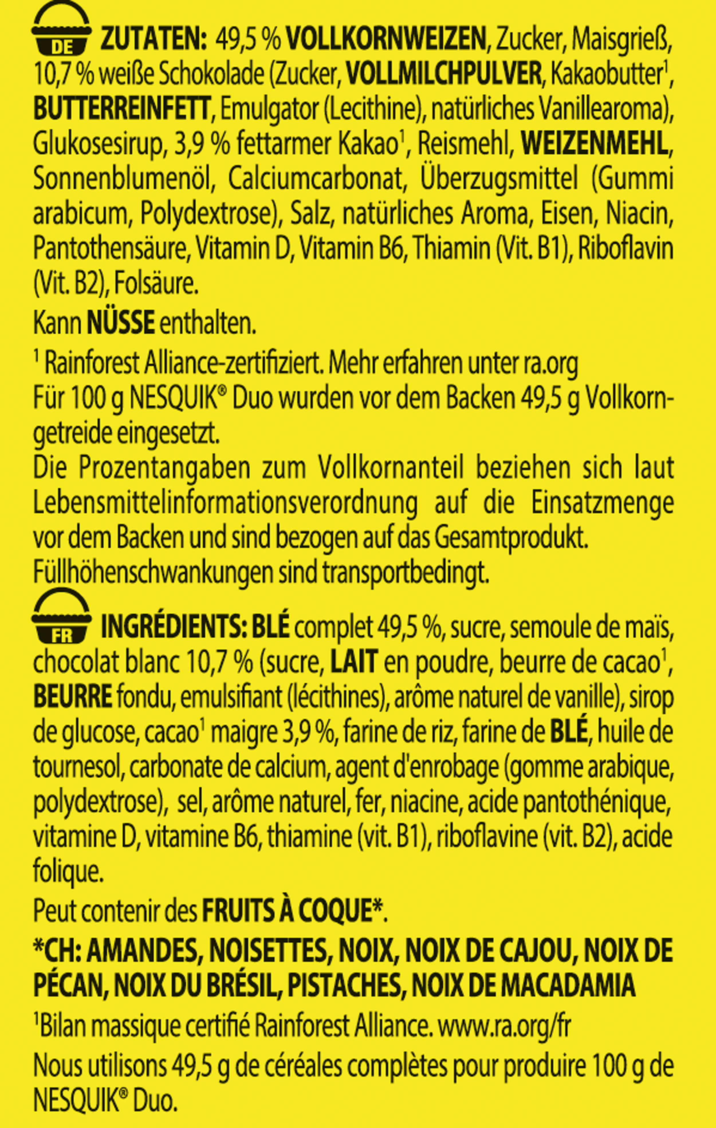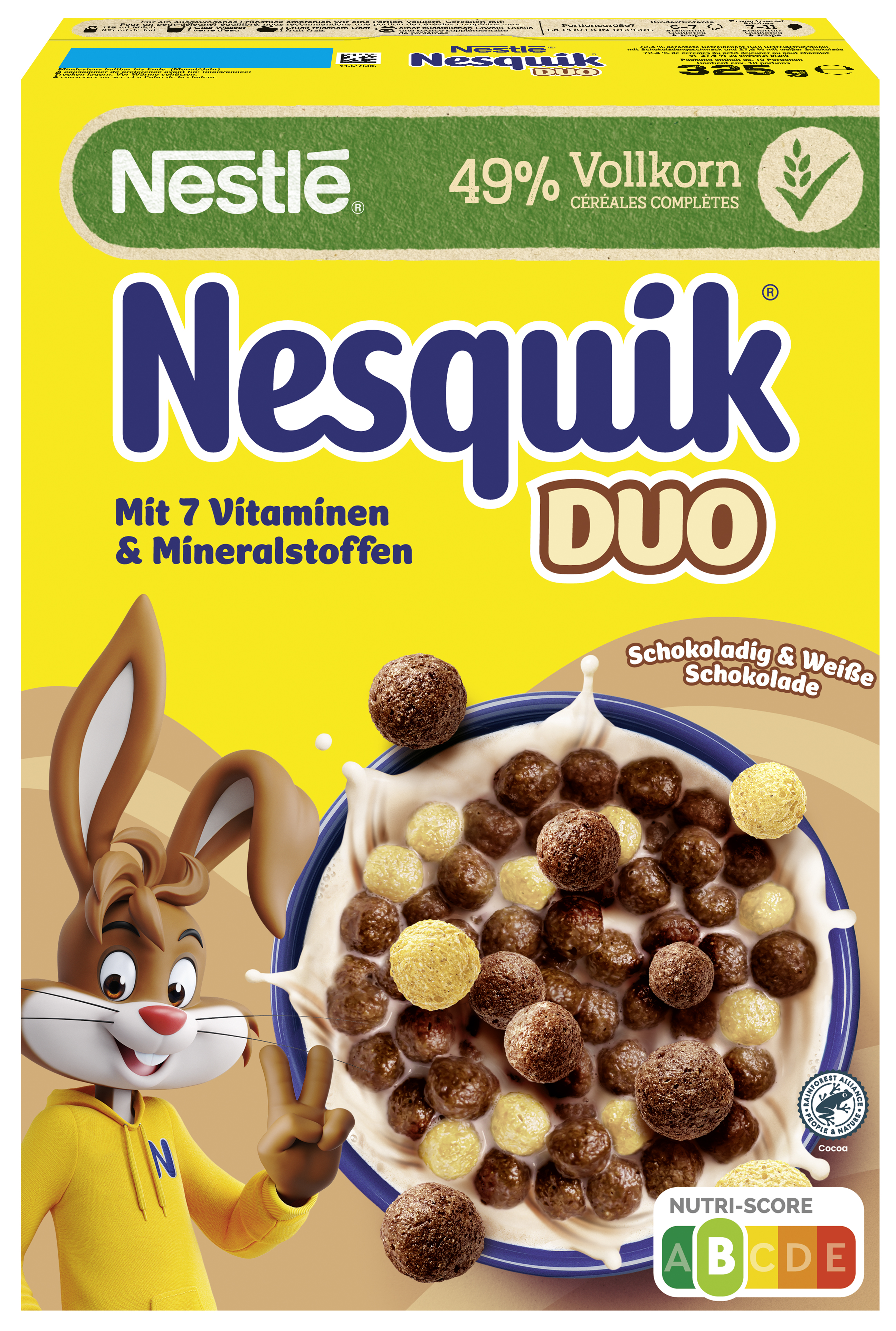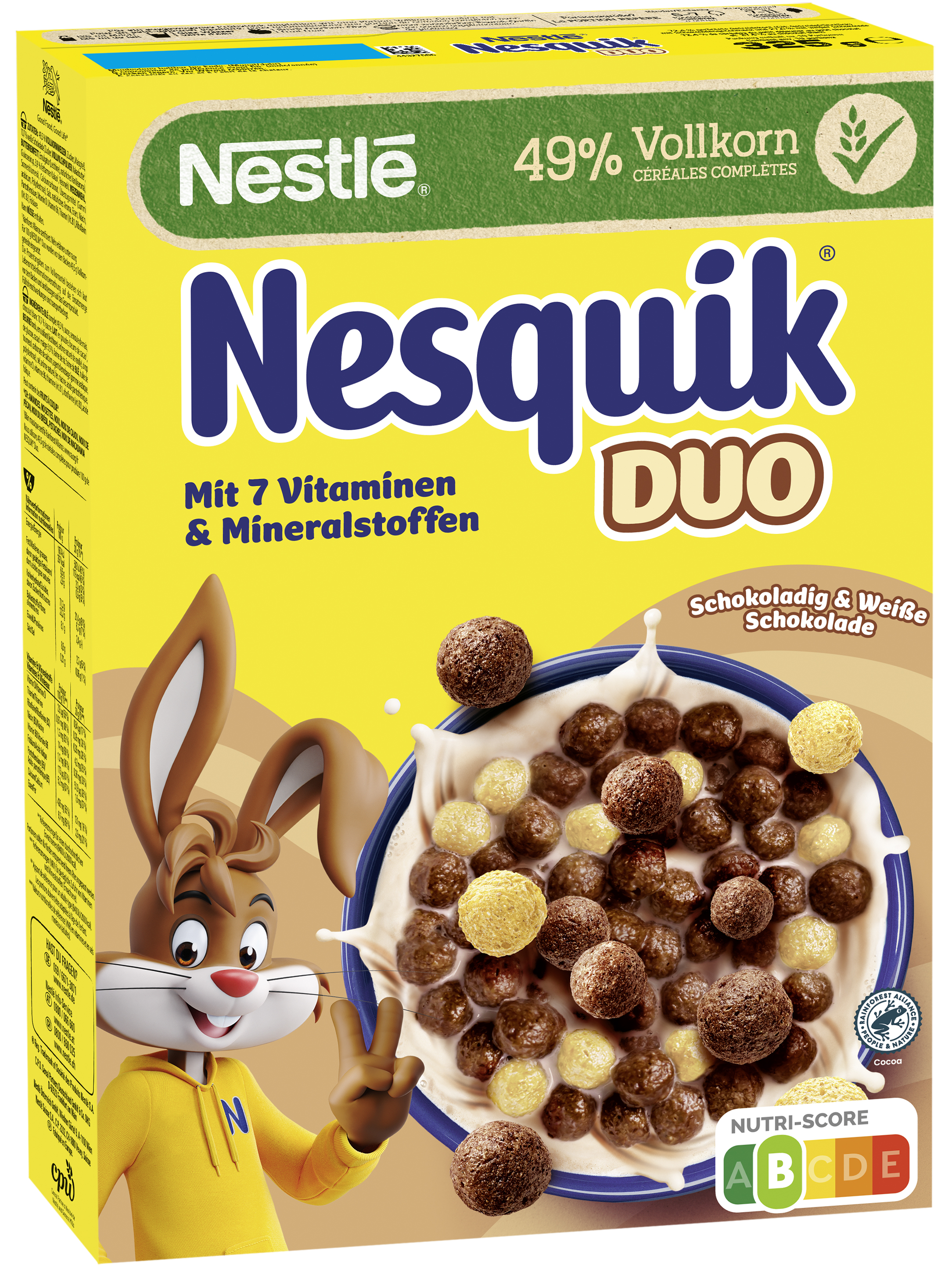 myTime Assortment Yes myTime Article Number 4502110201 myTime Product Title Nestlé Nesquik Duo Cerealien EAN 07613031570126 Material Number 12312054 Marke NESTLE Product Name NESTLE NESQUIK DUO Cerealien 325g Net Content 325.000 Net Content UoM GRM Net Weight 325 Net Weight UoM GRM Artikel Höhe 275.000 Artikel Höhe UoM MMT Artikel Breite 192.000 Artikel Breite UoM MMT Artikel Länge 52.000 Artikel Länge UoM MMT Bezeichnung 72,4 % geröstete Getreidekost mit Schokoladengeschmack und 27,6 % mit weißer Schokolade Beschreibung Versorgen Sie sich schon zum Auftakt des Tages mit wichtigen Vitaminen und Calcium, sowie einer leckeren Portion guter Laune. Das leckere NESTLÉ NESQUIK DUO besteht aus einer lustigen Mischung von knusprigen schokobraunen und weißen Cerealien-Bällchen aus 49% Vollkorngetreide gebacken. Starten Sie mit Ihrer Familie gutgelaunt in den Tag. NESTLÉ NESQUIK DUO Produkte mit Vollkorn für eine ausgewogene Ernährung Beginnen Sie Ihren Tag mit einem leckeren Frühstück und genießen Sie Produkte mit Vollkorn. Zur leichten Orientierung finden Sie auf unseren NESTLÉ Cerealien Packungen ein Vollkornhäkchen, welches Ihnen Vollkorngetreide als Zutat Nr. 1 garantiert. Vollkorngetreide ist Lieferant wichtiger Nährstoffe und wird daher von Ernährungsexperten weltweit, z.B. der deutschen Gesellschaft für Ernährung, als Bestandteil einer ausgewogenen Ernährung empfohlen. Mit dem NESTLÉ Cerealien Versprechen haben wir es uns zum Ziel gemacht, die NESTLÉ Cerealien Produkte kontinuierlich zu verbessern. Wir arbeiten fortlaufend daran, sowohl den Geschmack als auch die Rezeptur aller NESTLÉ Cerealien weiter zu optimieren. Zutaten Zutaten: 49,5% VOLLKORNWEIZEN, Zucker, Maisgrieß, 10,7% weiße Schokolade (Zucker, VOLLMILCHPULVER, Kakaobutter*, BUTTERREINFETT, Emulgator (Lecithine), natürliches Vanillearoma), Glukosesirup, 3,9% fettarmer Kakao*, Reismehl, WEIZENMEHL, Sonnenblumenöl, Calciumcarbonat, Überzugmittel (Gummi arabicum, Polydextrose), Salz, natürliches Aroma, Eisen, Niacin, Pantothensäure, Vitamin D, Vitamin B6, Thiamin (Vit. B1), Riboflavin (Vit. B2), Folsäure. Kann NÜSSE enthalten.