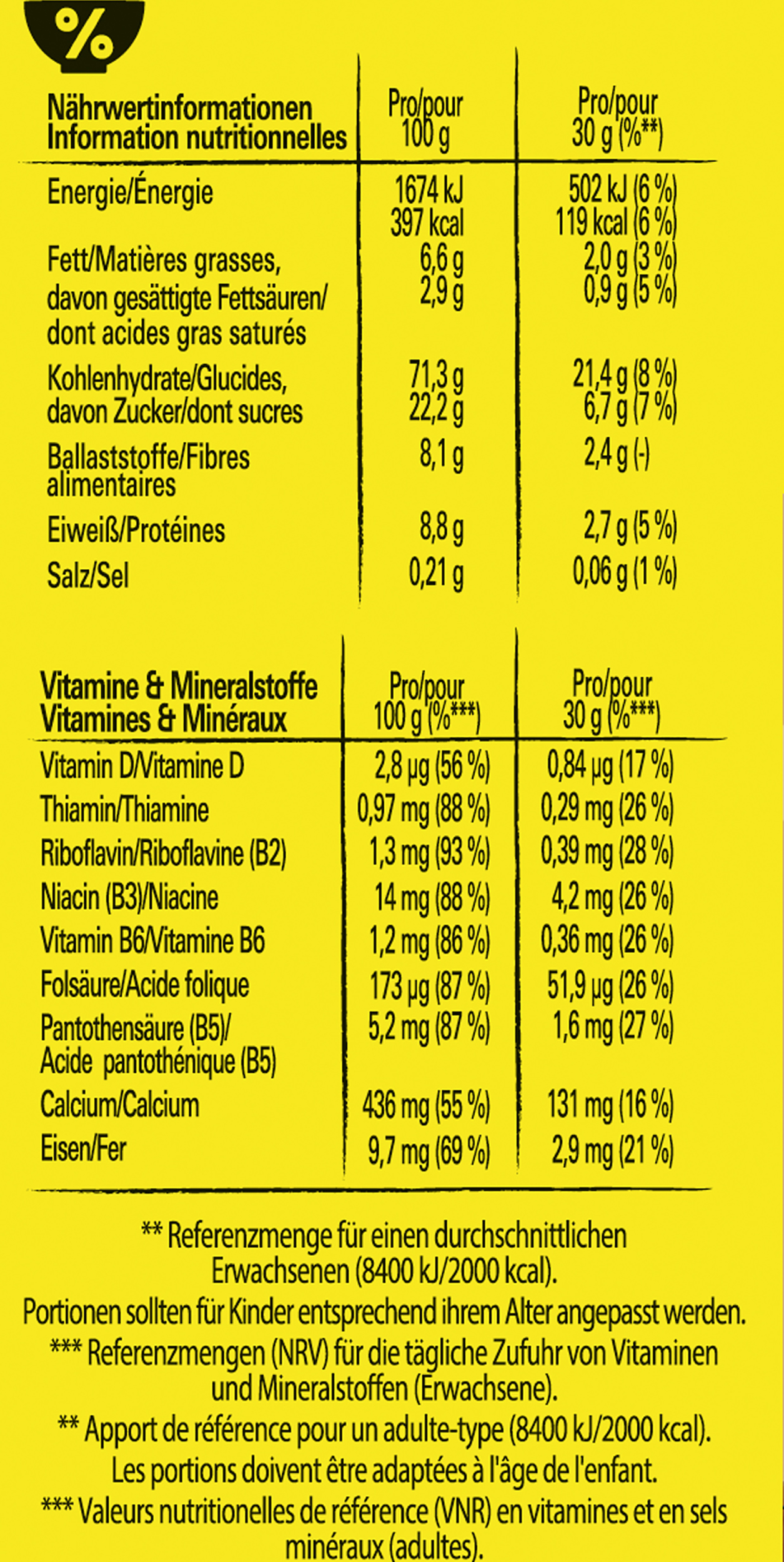 Sub Brand Name NESQUIK DUO Brand Owner Name Société des Produits Nestlé S.A. Functional Name Geröstete Getreidekost Country of Origin Poland Allergen Statement Vollkornweizen, Vollmilchpulver, Butterreinfett, Weizenmehl Haltbarkeit & Lagerung Trocken lagern. Vor Wärme schützen. Anwendungs- & Gebrauchshinweise Portionen sollten für Kinder entsprechen ihrem Alter angepasst werden. Third Party Accreditation GREEN_DOT Third Party Accreditation [2] RAINFOREST_ALLIANCE_PEOPLE_NATURE Nutritional Table 1 Zubereitungsgrad Bezugsgröße Portionsgröße Portionsgröße Beschreibung Tagesdosis Referenzwert Nährstoff: Teil von… Messgenauigkeit Nährwert % Messgenauigkeit % Referenzmenge UNPREPARED1PTN30GRMReferenzmenge für einen durchschnittlichen Erwachsenen (8400 kJ/ 2000 kcal).#Referenzmengen (NRV) für die tägliche Zufuhr von Vitaminen und Mineralstoffen (Erwachsene).ENER-EnergieAPPROXIMATELY119kCal6 UNPREPARED1PTN30GRMReferenzmenge für einen durchschnittlichen Erwachsenen (8400 kJ/ 2000 kcal).#Referenzmengen (NRV) für die tägliche Zufuhr von Vitaminen und Mineralstoffen (Erwachsene).ENER-EnergieAPPROXIMATELY502kJ6 UNPREPARED1PTN30GRMReferenzmenge für einen durchschnittlichen Erwachsenen (8400 kJ/ 2000 kcal).#Referenzmengen (NRV) für die tägliche Zufuhr von Vitaminen und Mineralstoffen (Erwachsene).FATFettAPPROXIMATELY2.0g3 UNPREPARED1PTN30GRMReferenzmenge für einen durchschnittlichen Erwachsenen (8400 kJ/ 2000 kcal).#Referenzmengen (NRV) für die tägliche Zufuhr von Vitaminen und Mineralstoffen (Erwachsene).FASATFett, davon gesättigte FettsäurenAPPROXIMATELY0.9g5 UNPREPARED1PTN30GRMReferenzmenge für einen durchschnittlichen Erwachsenen (8400 kJ/ 2000 kcal).#Referenzmengen (NRV) für die tägliche Zufuhr von Vitaminen und Mineralstoffen (Erwachsene).CHOAVLKohlenhydrateAPPROXIMATELY21.4g8 UNPREPARED1PTN30GRMReferenzmenge für einen durchschnittlichen Erwachsenen (8400 kJ/ 2000 kcal).#Referenzmengen (NRV) für die tägliche Zufuhr von Vitaminen und Mineralstoffen (Erwachsene).SUGAR-Kohlenhydrate, davon ZuckerAPPROXIMATELY6.7g7 UNPREPARED1PTN30GRMReferenzmenge für einen durchschnittlichen Erwachsenen (8400 kJ/ 2000 kcal).#Referenzmengen (NRV) für die tägliche Zufuhr von Vitaminen und Mineralstoffen (Erwachsene).FIBTGBallaststoffeAPPROXIMATELY2.4g UNPREPARED1PTN30GRMReferenzmenge für einen durchschnittlichen Erwachsenen (8400 kJ/ 2000 kcal).#Referenzmengen (NRV) für die tägliche Zufuhr von Vitaminen und Mineralstoffen (Erwachsene).PRO-EiweißAPPROXIMATELY2.7g5 UNPREPARED1PTN30GRMReferenzmenge für einen durchschnittlichen Erwachsenen (8400 kJ/ 2000 kcal).#Referenzmengen (NRV) für die tägliche Zufuhr von Vitaminen und Mineralstoffen (Erwachsene).SALTEQSalz ÄquivalentAPPROXIMATELY0.06g1 UNPREPARED1PTN30GRMReferenzmenge für einen durchschnittlichen Erwachsenen (8400 kJ/ 2000 kcal).#Referenzmengen (NRV) für die tägliche Zufuhr von Vitaminen und Mineralstoffen (Erwachsene).VITD-Vitamin DAPPROXIMATELY0.84μg17 UNPREPARED1PTN30GRMReferenzmenge für einen durchschnittlichen Erwachsenen (8400 kJ/ 2000 kcal).#Referenzmengen (NRV) für die tägliche Zufuhr von Vitaminen und Mineralstoffen (Erwachsene).THIAVitamin B 1, ThiaminAPPROXIMATELY0.29mg26 UNPREPARED1PTN30GRMReferenzmenge für einen durchschnittlichen Erwachsenen (8400 kJ/ 2000 kcal).#Referenzmengen (NRV) für die tägliche Zufuhr von Vitaminen und Mineralstoffen (Erwachsene).RIBFVitamin B 2, RiboflavinAPPROXIMATELY0.39mg28 UNPREPARED1PTN30GRMReferenzmenge für einen durchschnittlichen Erwachsenen (8400 kJ/ 2000 kcal).#Referenzmengen (NRV) für die tägliche Zufuhr von Vitaminen und Mineralstoffen (Erwachsene).NIANiacinAPPROXIMATELY4.2mg26 UNPREPARED1PTN30GRMReferenzmenge für einen durchschnittlichen Erwachsenen (8400 kJ/ 2000 kcal).#Referenzmengen (NRV) für die tägliche Zufuhr von Vitaminen und Mineralstoffen (Erwachsene).VITB6-Vitamin B 6APPROXIMATELY0.36mg26 UNPREPARED1PTN30GRMReferenzmenge für einen durchschnittlichen Erwachsenen (8400 kJ/ 2000 kcal).#Referenzmengen (NRV) für die tägliche Zufuhr von Vitaminen und Mineralstoffen (Erwachsene).FOLDFEFOLDEisenAPPROXIMATELY51.9μg26 UNPREPARED1PTN30GRMReferenzmenge für einen durchschnittlichen Erwachsenen (8400 kJ/ 2000 kcal).#Referenzmengen (NRV) für die tägliche Zufuhr von Vitaminen und Mineralstoffen (Erwachsene).PANTACPantothensäureAPPROXIMATELY1.6mg27 UNPREPARED1PTN30GRMReferenzmenge für einen durchschnittlichen Erwachsenen (8400 kJ/ 2000 kcal).#Referenzmengen (NRV) für die tägliche Zufuhr von Vitaminen und Mineralstoffen (Erwachsene).CACalciumAPPROXIMATELY131mg16 UNPREPARED1PTN30GRMReferenzmenge für einen durchschnittlichen Erwachsenen (8400 kJ/ 2000 kcal).#Referenzmengen (NRV) für die tägliche Zufuhr von Vitaminen und Mineralstoffen (Erwachsene).FEEisenAPPROXIMATELY2.9mg21 Nutritional Table 2 Zubereitungsgrad Bezugsgröße Portionsgröße Portionsgröße Beschreibung Tagesdosis Referenzwert Nährstoff: Teil von… Messgenauigkeit Nährwert % Messgenauigkeit % Referenzmenge UNPREPARED100GRMReferenzmengen (NRV) für die tägliche Zufuhr von Vitaminen und Mineralstoffen (Erwachsene).ENER-EnergieAPPROXIMATELY397kCal UNPREPARED100GRMReferenzmengen (NRV) für die tägliche Zufuhr von Vitaminen und Mineralstoffen (Erwachsene).ENER-EnergieAPPROXIMATELY1674kJ UNPREPARED100GRMReferenzmengen (NRV) für die tägliche Zufuhr von Vitaminen und Mineralstoffen (Erwachsene).FATFettAPPROXIMATELY6.6g UNPREPARED100GRMReferenzmengen (NRV) für die tägliche Zufuhr von Vitaminen und Mineralstoffen (Erwachsene).FASATFett, davon gesättigte FettsäurenAPPROXIMATELY2.9g UNPREPARED100GRMReferenzmengen (NRV) für die tägliche Zufuhr von Vitaminen und Mineralstoffen (Erwachsene).CHOAVLKohlenhydrateAPPROXIMATELY71.3g UNPREPARED100GRMReferenzmengen (NRV) für die tägliche Zufuhr von Vitaminen und Mineralstoffen (Erwachsene).SUGAR-Kohlenhydrate, davon ZuckerAPPROXIMATELY22.2g UNPREPARED100GRMReferenzmengen (NRV) für die tägliche Zufuhr von Vitaminen und Mineralstoffen (Erwac