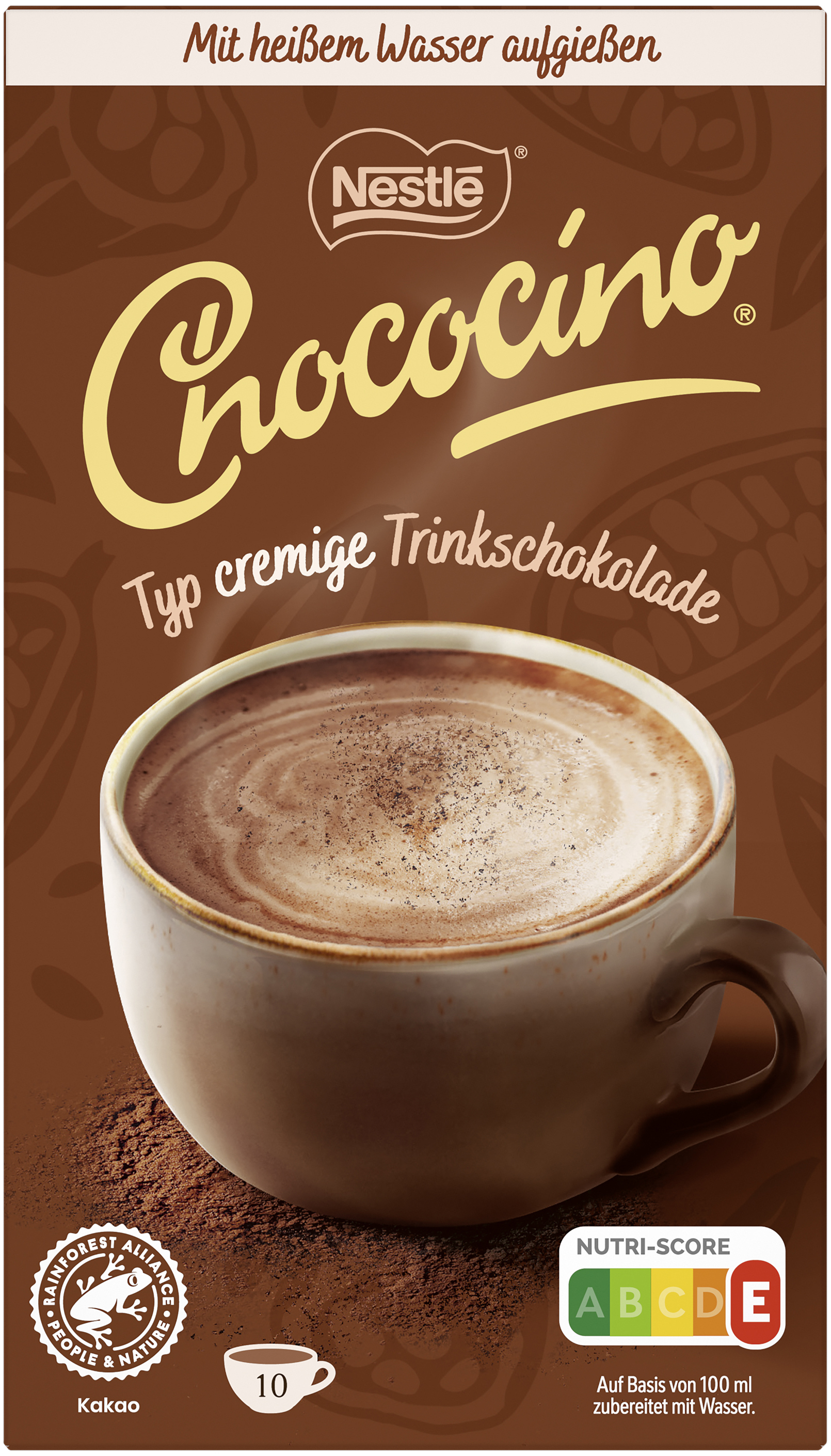 myTime Assortment Yes myTime Article Number 4502090040 myTime Product Title Nestlé Chococino EAN 07613036300261 Material Number 12598321 Marke NESTLE Product Name NESTLE CHOCOCINO 220g Net Content Statement 10 Portionsbeutel Net Content 220.000 Net Content UoM GRM Net Weight 220 Net Weight UoM GRM Artikel Höhe 165.000 Artikel Höhe UoM MMT Artikel Breite 94.000 Artikel Breite UoM MMT Artikel Länge 78.000 Artikel Länge UoM MMT Schlagwörter milchshake, powder, chocolate, kakaostreuer, trinken, trinkschokolade, trinkschokolade-pulver, trinkschokoladenpulver, schokoladenmilch, schokoladen-milchshake, schoko-milch kinder-milchshake, trinkkakao, trinkkakaopulver, nesquik-pulver, cacao Bezeichnung Kakaohaltiges Getränkepulver mit Magermilchpulver Beschreibung Genießen Sie Nestlé Chococino – ein cremiges Kakaogetränk mit feinem Schaum und ausgewogenem Kakaogeschmack. Die einfache Zubereitung gelingt schnell: Beutelinhalt in eine Tasse geben, mit 110ml heißem, nicht kochendem Wasser aufgießen, umrühren und genießen. Das enthaltende Kakaopulver sorgt für ein angenehmes Aroma und ein ausgewogenes Geschmackserlebnis bei jedem Schluck. Nestlé Chococino eignet sich nicht nur für entspannte Genussmomente am Nachmittag, sondern auch als abendlicher Genuss. Ob als wärmendes Getränk an kalten Tagen oder als entspannender Moment zwischendurch – dieses cremige Kakaogetränk überzeugt mit seiner samtigen Textur und dem ausgewogenen Kakaogeschmack. Die praktische 220g-Packung mit 10 einzelnen Portionen sorgt für gleichbleibend frischen Genuss. Mit Nestlé Chococino wird jede Auszeit zu einem angenehmen Genussmoment. Zubereitung Beutelinhalt in eine normale Kaffeetasse geben. Mit heißem, nicht kochendem Wasser (110 ml) aufgießen. Gut umrühren, fertig. Zurücklehnen und Ihren leckeren Chococino genießen! Zutaten Zutaten: Zucker, MAGERMILCHPULVER (21%), stark entöltes Kakaopulver* (16%), MILCHZUCKER, Kokosnussfett, Glukosesirup, Salz, natürliches Aroma.
