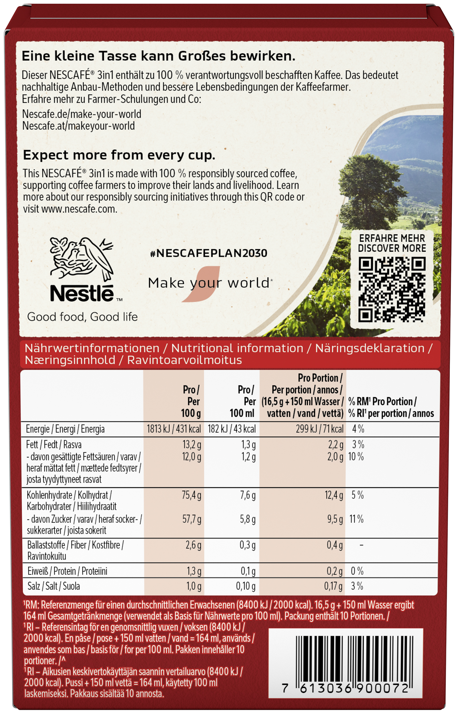 Sub Brand Name 3IN1 3 IN 1 Brand Owner Name Société des Produits Nestlé S.A. Functional Name Instantkaffee Country of Origin Hungary Allergen Statement Milcheiweiß Haltbarkeit & Lagerung Trocken lagern. Vor Wärme schützen. Third Party Accreditation GREEN_DOT Nutritional Table 1 Zubereitungsgrad Bezugsgröße Portionsgröße Portionsgröße Beschreibung Tagesdosis Referenzwert Nährstoff: Teil von… Messgenauigkeit Nährwert % Messgenauigkeit % Referenzmenge PREPARED100MLT16,5g + 150ml Wasser ergibt 164ml Gesamtgetränkmenge (verwendet als Basis für Nährwerte pro 100ml)ENER-EnergieAPPROXIMATELY182kJ PREPARED100MLT16,5g + 150ml Wasser ergibt 164ml Gesamtgetränkmenge (verwendet als Basis für Nährwerte pro 100ml)ENER-EnergieAPPROXIMATELY43kCal PREPARED100MLT16,5g + 150ml Wasser ergibt 164ml Gesamtgetränkmenge (verwendet als Basis für Nährwerte pro 100ml)FATFettAPPROXIMATELY1.3g PREPARED100MLT16,5g + 150ml Wasser ergibt 164ml Gesamtgetränkmenge (verwendet als Basis für Nährwerte pro 100ml)FASATFett, davon gesättigte FettsäurenAPPROXIMATELY1.2g PREPARED100MLT16,5g + 150ml Wasser ergibt 164ml Gesamtgetränkmenge (verwendet als Basis für Nährwerte pro 100ml)CHOAVLKohlenhydrateAPPROXIMATELY7.6g PREPARED100MLT16,5g + 150ml Wasser ergibt 164ml Gesamtgetränkmenge (verwendet als Basis für Nährwerte pro 100ml)SUGAR-Kohlenhydrate, davon ZuckerAPPROXIMATELY5.8g PREPARED100MLT16,5g + 150ml Wasser ergibt 164ml Gesamtgetränkmenge (verwendet als Basis für Nährwerte pro 100ml)FIBTGBallaststoffeAPPROXIMATELY0.3g PREPARED100MLT16,5g + 150ml Wasser ergibt 164ml Gesamtgetränkmenge (verwendet als Basis für Nährwerte pro 100ml)PRO-EiweißAPPROXIMATELY0.1g PREPARED100MLT16,5g + 150ml Wasser ergibt 164ml Gesamtgetränkmenge (verwendet als Basis für Nährwerte pro 100ml)SALTEQSalz ÄquivalentAPPROXIMATELY0.10g Nutritional Table 2 Zubereitungsgrad Bezugsgröße Portionsgröße Portionsgröße Beschreibung Tagesdosis Referenzwert Nährstoff: Teil von… Messgenauigkeit Nährwert % Messgenauigkeit % Referenzmenge PREPARED1PTNBei einer Portion von 16,5g Pulver und 150ml WasserReferenzmenge für einen durchschnittlichen Erwachsenen (8400 kJ/ 2000 kcal).ENER-EnergieAPPROXIMATELY299kJ4 PREPARED1PTNBei einer Portion von 16,5g Pulver und 150ml WasserReferenzmenge für einen durchschnittlichen Erwachsenen (8400 kJ/ 2000 kcal).ENER-EnergieAPPROXIMATELY71kCal4 PREPARED1PTNBei einer Portion von 16,5g Pulver und 150ml WasserReferenzmenge für einen durchschnittlichen Erwachsenen (8400 kJ/ 2000 kcal).FATFettAPPROXIMATELY2.2g3 PREPARED1PTNBei einer Portion von 16,5g Pulver und 150ml WasserReferenzmenge für einen durchschnittlichen Erwachsenen (8400 kJ/ 2000 kcal).FASATFett, davon gesättigte FettsäurenAPPROXIMATELY2.0g10 PREPARED1PTNBei einer Portion von 16,5g Pulver und 150ml WasserReferenzmenge für einen durchschnittlichen Erwachsenen (8400 kJ/ 2000 kcal).CHOAVLKohlenhydrateAPPROXIMATELY12.4g5 PREPARED1PTNBei einer Portion von 16,5g Pulver und 150ml WasserReferenzmenge für einen durchschnittlichen Erwachsenen (8400 kJ/ 2000 kcal).SUGAR-Kohlenhydrate, davon ZuckerAPPROXIMATELY9.5g11 PREPARED1PTNBei einer Portion von 16,5g Pulver und 150ml WasserReferenzmenge für einen durchschnittlichen Erwachsenen (8400 kJ/ 2000 kcal).FIBTGBallaststoffeAPPROXIMATELY0.4g PREPARED1PTNBei einer Portion von 16,5g Pulver und 150ml WasserReferenzmenge für einen durchschnittlichen Erwachsenen (8400 kJ/ 2000 kcal).PRO-EiweißAPPROXIMATELY0.2g0 PREPARED1PTNBei einer Portion von 16,5g Pulver und 150ml WasserReferenzmenge für einen durchschnittlichen Erwachsenen (8400 kJ/ 2000 kcal).SALTEQSalz ÄquivalentAPPROXIMATELY0.17g3 Nutritional Table 3 Zubereitungsgrad Bezugsgröße Portionsgröße Portionsgröße Beschreibung Tagesdosis Referenzwert Nährstoff: Teil von… Messgenauigkeit Nährwert % Messgenauigkeit % Referenzmenge UNPREPARED100GRMENER-EnergieAPPROXIMATELY1813kJ UNPREPARED100GRMENER-EnergieAPPROXIMATELY431kCal UNPREPARED100GRMFATFettAPPROXIMATELY13.2g UNPREPARED100GRMFASATFett, davon gesättigte FettsäurenAPPROXIMATELY12.0g UNPREPARED100GRMCHOAVLKohlenhydrateAPPROXIMATELY75.4g UNPREPARED100GRMSUGAR-Kohlenhydrate, davon ZuckerAPPROXIMATELY57.7g UNPREPARED100GRMFIBTGBallaststoffeAPPROXIMATELY2.6g UNPREPARED100GRMPRO-EiweißAPPROXIMATELY1.3g UNPREPARED100GRMSALTEQSalz ÄquivalentAPPROXIMATELY1.0g Contact Nestlé Deutschland AG Contact Address 60523 Frankfurt am Main