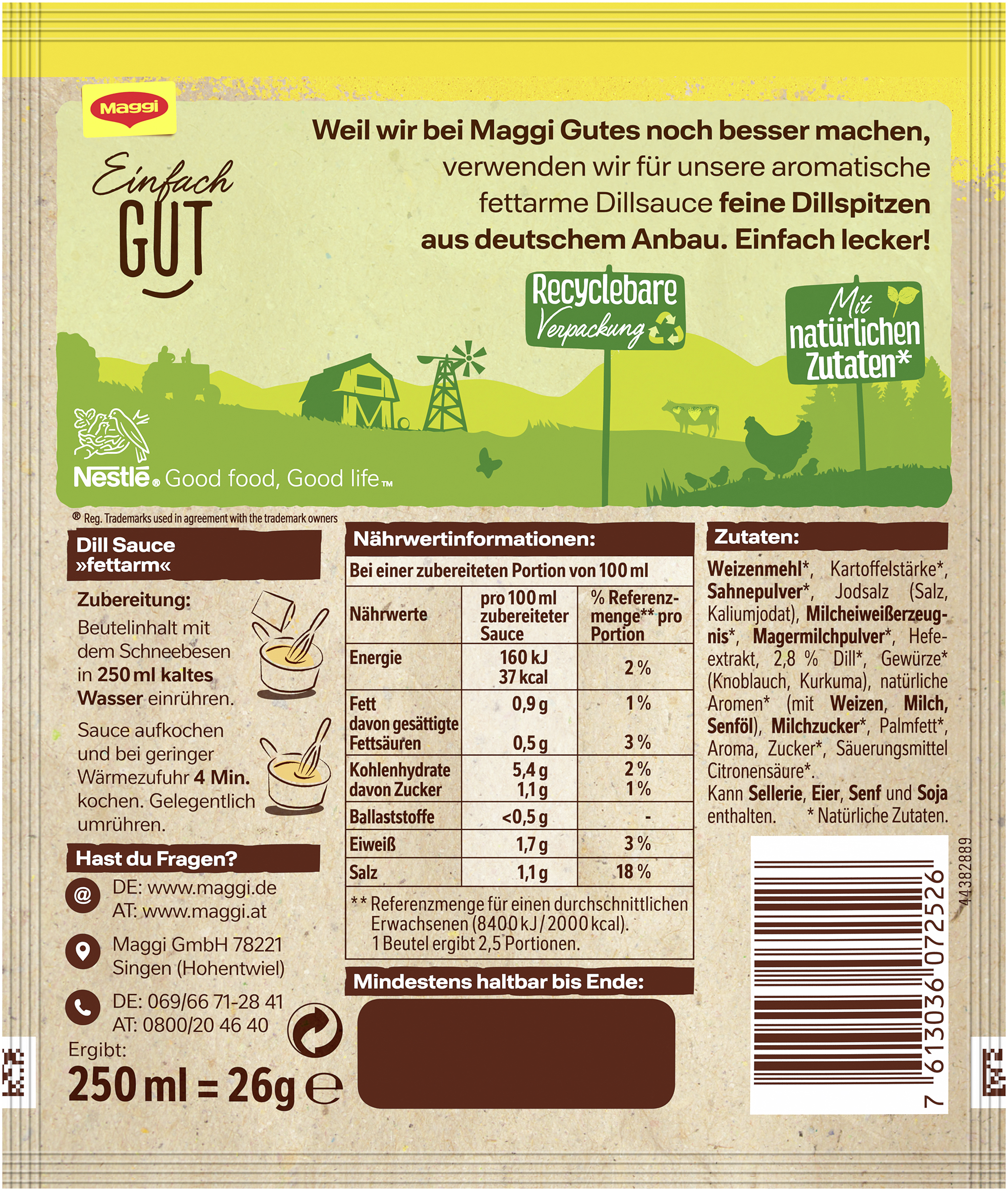 myTime Assortment Yes myTime Article Number 4502070497 myTime Product Title Maggi Für Geniesser Sauce Dill Fettarm EAN 07613036072526 Material Number 12337748 Marke MAGGI Product Name MAGGI FÜR GENIESSER Sauce Dill Fettarm, ergibt 250ml Net Content 250 Net Content UoM MLT Net Weight 26 Net Weight UoM GRM Artikel Höhe 150.000 Artikel Höhe UoM MMT Artikel Breite 127.000 Artikel Breite UoM MMT Artikel Länge 8.000 Artikel Länge UoM MMT Schlagwörter Fertigsauce, Fischsauce, Knorr, dillsoße, dillsauce, dill sauce, dill soße, dillsoße zu fisch, dillsoße rezept, dillsosse, dillsoße fisch, rezept dillsoße, dillsoße für fisch, dillsoße ohne sahne, fisch mit dillsoße, lachs mit dillsoße, dillsoße mit milch Bezeichnung Dill Sauce >>fettarm<< Beschreibung Die feinen Dillspitzen machen die Maggi für Genießer Dill Sauce einfach lecker. Damit ist sie die ideale Soße für Fisch und Gemüse. Die Dillsauce ist fettarm und ergänzt leichte Gerichte somit auf ideale Weise. Sie ist die perfekte Sauce für alle, die cremige Saucen lieben, aber bewusst und leicht genießen möchten. Kurz zusammengefasst – Maggi Dill Sauce fettarm: • Ergibt 250ml Sauce bzw. ca. 2,5 Portionen • Mit feinen Dillspitzen aus deutschem Anbau • Unter 1,5% Fett • Vegetarisch • Minimaler Zeitaufwand • Maximale Erfolgsgarantie bei vollmundigem Geschmack • Ausgewählte Zutaten Unsere Dill Sauce Rezeptidee zum Nachkochen: Frischkäse-Limetten-Sauce. Sauce nach Anweisung zubereiten. 1EL fettarmen Frischkäse und 2TL Limettensaft unterrühren und kurz heiß werden lassen. Weitere kreative und leckere Ideen für noch mehr Inspiration und Abwechslung beim Kochen gibt´s im Rezeptbereich auf maggi.de – Natürlich mit Geling-Garantie. Zubereitung Beutelinhalt mit dem Schneebesen in 250 ml kaltes Wasser einrühren. Sauce aufkochen und bei geringer Wärmezufuhr 4 Min. kochen. Gelegentlich umrühren. Zutaten Zutaten: WEIZENMEHL*, Kartoffelstärke*, SAHNEPULVER*, Jodsalz (Salz, Kaliumjodat), MILCHEIWEISSERZEUGNIS*, MAGERMILCHPULVER*, Hefeextrakt, 2,8% Dill*, Gewürze* (Knoblauch, Kurkuma), natürliche Aromen* (mit WEIZEN, MILCH, SENFÖL), MILCHZUCKER*, Palmfett*, Aroma, Zucker*, Säuerungsmittel Citronensäure*.