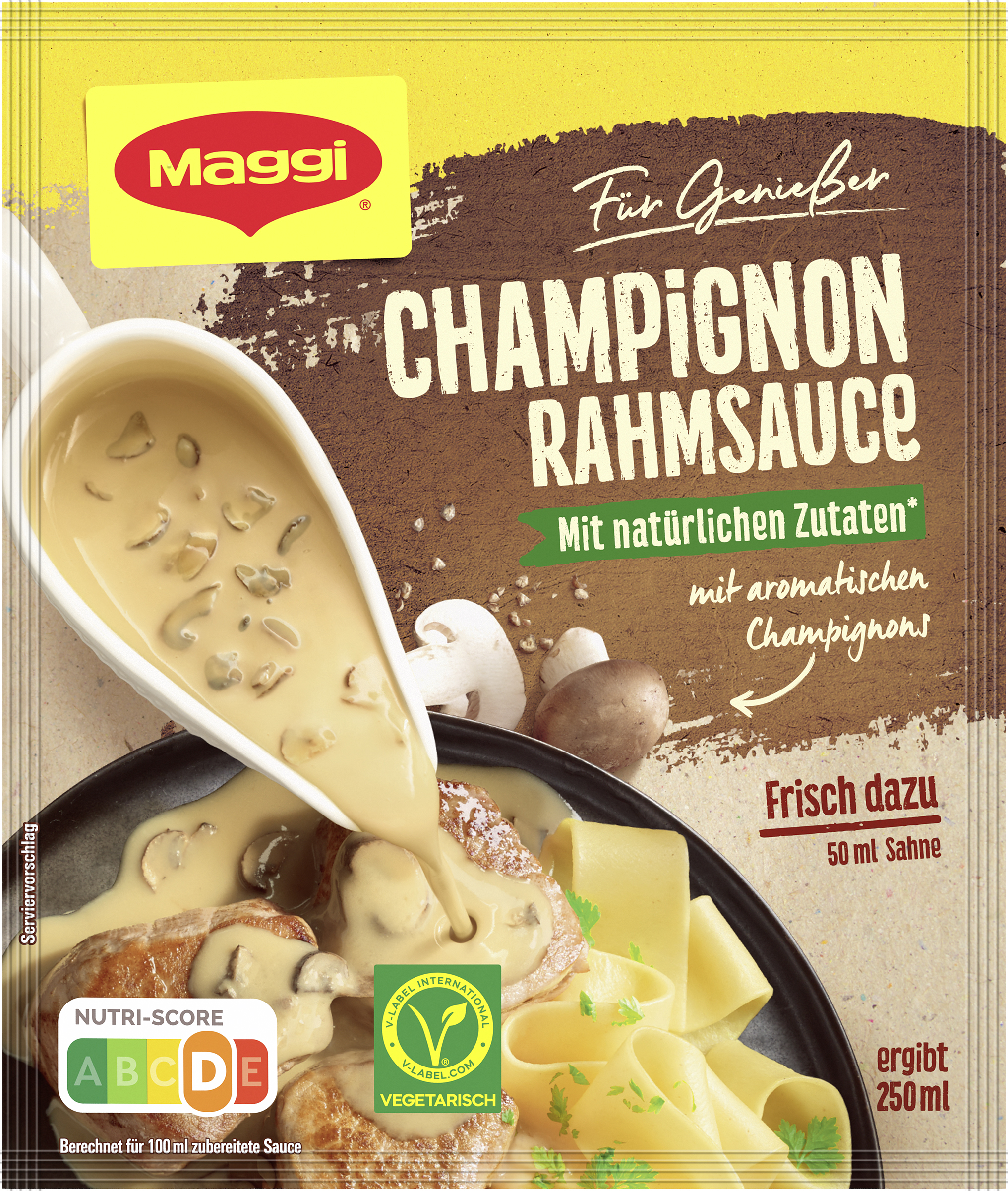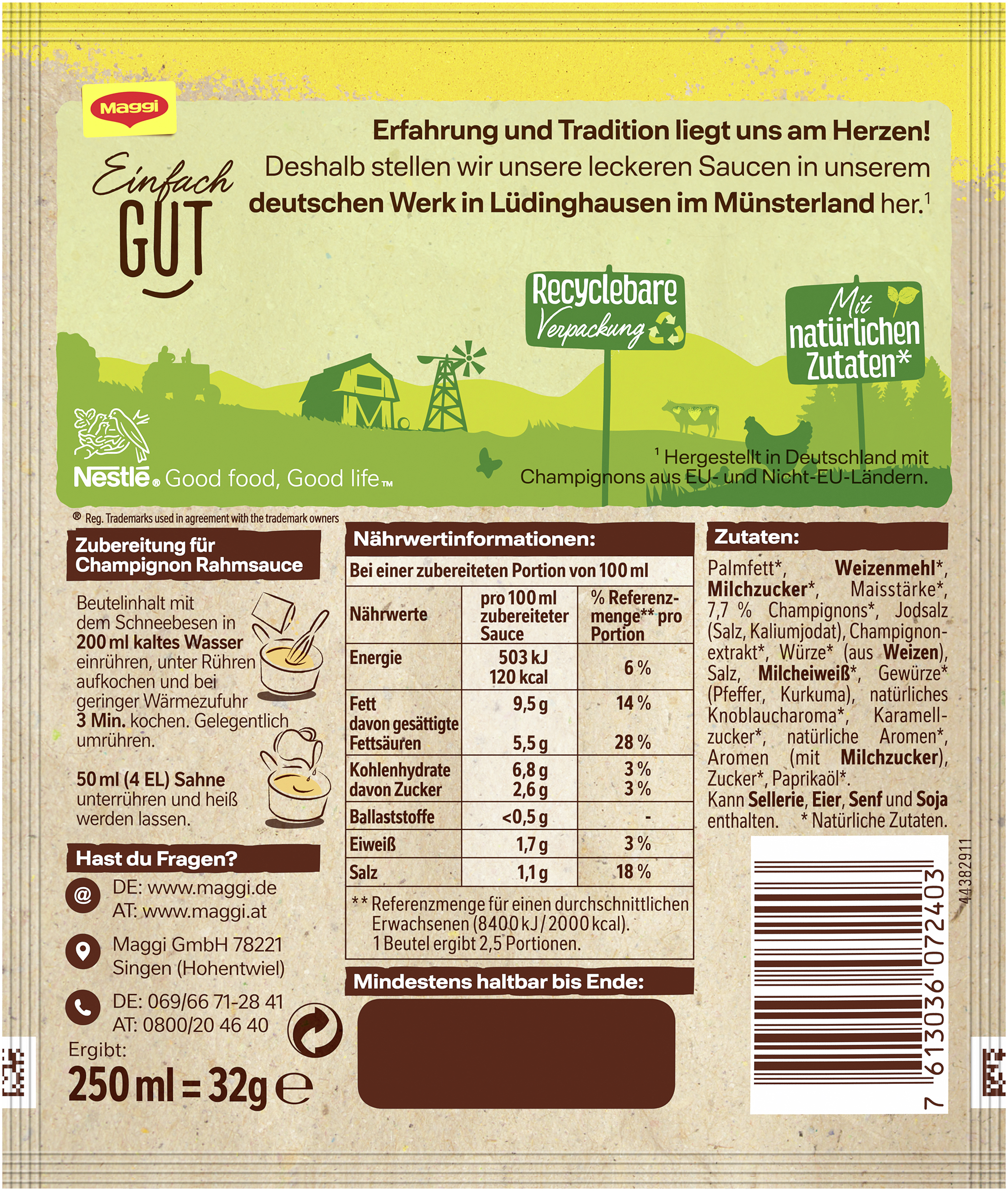 myTime Assortment Yes myTime Article Number 4502072075 myTime Product Title Maggi Für Geniesser Champignon Rahmsauce EAN 07613036072403 Material Number 12337734 Marke MAGGI Product Name MAGGI FÜR GENIESSER Champignon Rahmsauce, ergibt 250ml Net Content 250 Net Content UoM MLT Net Weight 32.5 Net Weight UoM GRM Artikel Höhe 150.000 Artikel Höhe UoM MMT Artikel Breite 127.000 Artikel Breite UoM MMT Artikel Länge 17.000 Artikel Länge UoM MMT Schlagwörter Fertigsauce, Champignon Rahmsauce, Knorr, pilz sahne sauce, pilz rahm sauce, pilz sauce, pilzsauce pasta, champignon rahmsoße rezept, köttbullar mit champignon-rahmsauce, champignon rahmsauce selber machen, champignon-rahmsauce, champignon rahmsauce rezept Bezeichnung Zubereitung für Champignon Rahmsauce Beschreibung Die Maggi Champignonrahmsauce ist eine geschmacklich fein abgestimmte, klassische Pilz-Sahnesauce mit leckeren, aromatischen Champignon-Stückchen. Sie passt dank Sahne-Note ideal zu Kurzgebratenem wie Steaks, Schweinemedaillons oder -Lende, Schnitzel, Frikadellen und natürlich auch dem Klassiker: Geschnetzeltem. Doch auch bei Pasta macht die cremige Sauce eine gute Figur. Ein weiterer beliebter Anwendungsfall sind die traditionell-schwedischen Köttbullar-Fleischbällchen. Zubereitung der Champignon-Rahmsauce von Maggi: Die Zubereitung geht einfach und mit sehr geringem Zeitaufwand: Beutelinhalt mit einem Schneebesen in 200ml kaltes Wasser einrühren, unter Rühren aufkochen und bei geringer Wärme 3 Minuten lang kochen. Dabei gelegentlich umrühren. Anschließend werden noch 50ml – oder 4EL – Sahne untergerührt und erhitzt – fertig. Wer mag, kann auch noch eine Portion Frischkäse zugeben, je nach eigenen Vorlieben. Cranberry-Rosmarinsauce: Sauce nach Anweisung zubereiten. 1EL getrocknete Cranberrys, 1/2TL gehackten Rosmarin und 1EL Weißwein unterrühren. Weitere kreative und leckere Ideen für noch mehr Inspiration und Abwechslung beim Kochen gibt´s im Rezeptbereich auf maggi.de – Natürlich mit Geling-Garantie. Zubereitung Beutelinhalt mit dem Schneebesen in 200 ml kaltes Wasser einrühren, unter Rühren aufkochen und bei geringer Wärmezufuhr 3 Min. kochen. Gelegentlich umrühren. 50 ml (4 EL) Sahne unterrühren und heiß werden lassen. Zutaten Zutaten: Palmfett*, WEIZENMEHL*, MILCHZUCKER*, Maisstärke*, 7,7% Champignons*, Jodsalz (Salz, Kaliumjodat), Champignonextrakt*, Würze* (aus WEIZEN), Salz, MILCHEIWEISS*, Gewürze* (Pfeffer, Kurkuma), natürliches Knoblaucharoma*, Karamellzucker*, natürliche Aromen*, Aromen (mit MILCHZUCKER), Zucker*, Paprikaöl*. Kann SELLERIE, EIER, SENF und SOJA enthalten. *Natürliche Zutaten.