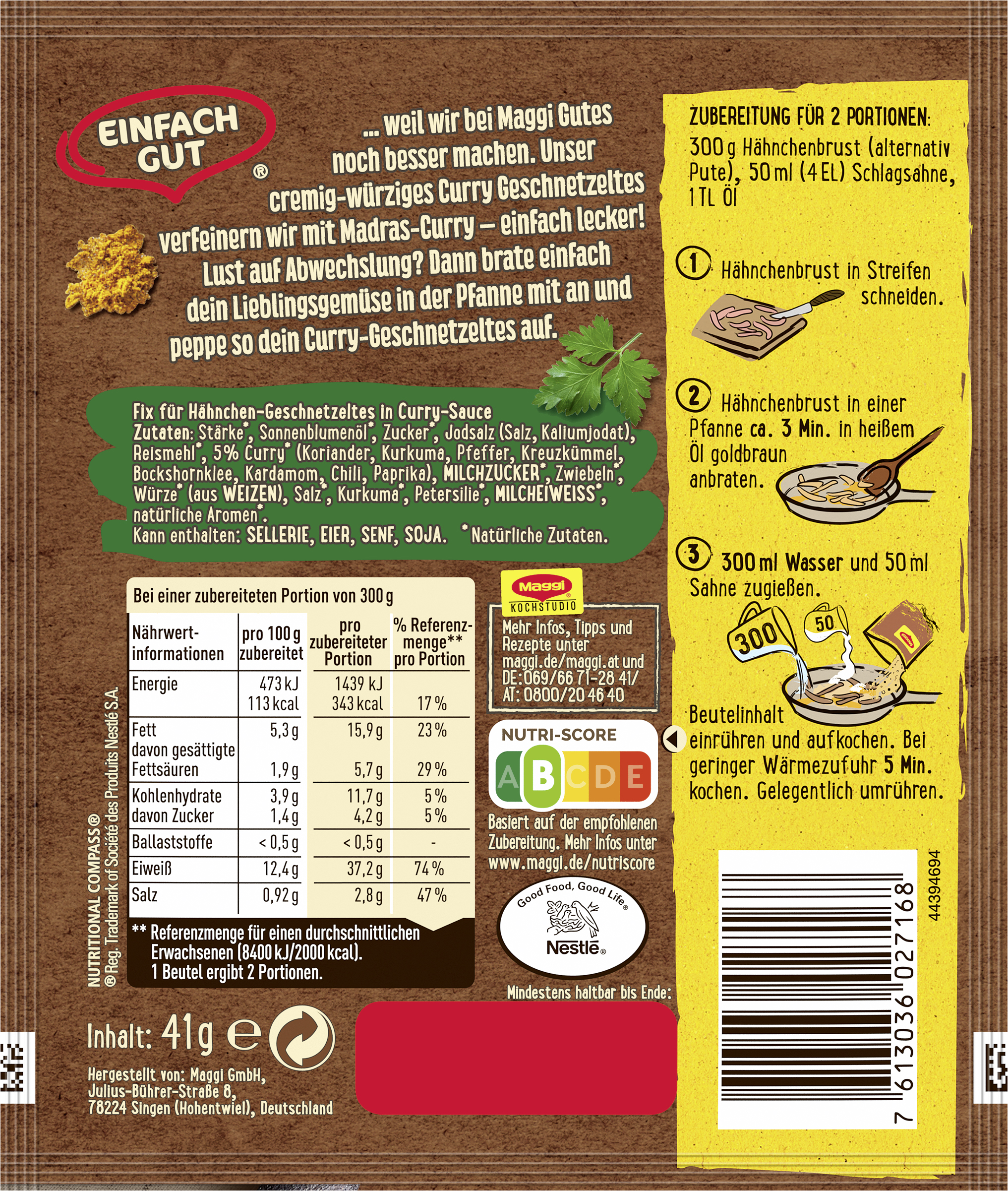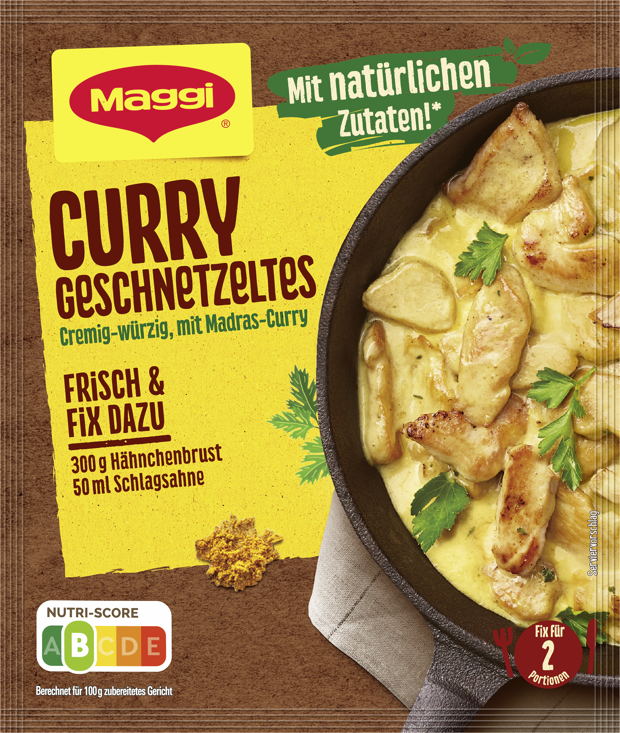 myTime Assortment Yes myTime Article Number 4502072294 myTime Product Title Maggi Fix Curry Geschnetzeltes EAN 07613036027168 Material Number 12334557 Marke MAGGI Product Name MAGGI FIX Curry Geschnetzeltes 41g Net Content 41 Net Content UoM GRM Net Weight 41 Net Weight UoM GRM Artikel Höhe 150.000 Artikel Höhe UoM MMT Artikel Breite 127.000 Artikel Breite UoM MMT Artikel Länge 10.000 Artikel Länge UoM MMT Schlagwörter koch-gewürze, instant, gericht-e, gewürzpaste-n, gewürz paste, fertiggericht-e, instant, fleisch, fertig soßen, würzmix, würzmittel, tüten, gewürzmischung, gewürz für geschnetzeltes, würzbasis, puten, geschnetzeltes, gewürz, curry-sauce, curry-soße, pulver Bezeichnung Fix für Hähnchen-Geschnetzeltes in Curry-Sauce Beschreibung MAGGI Fix für Curry Geschnetzeltes: würzig-cremiges Curry Gericht Wer gerne würzig isst, sollte MAGGI Fix für Curry Geschnetzeltes ausprobieren. Mit der MAGGI Fix Würzmischung mit natürlichen Zutaten* lässt sich das Gericht im Handumdrehen unter Zugabe von frischen Zutaten zubereiten. Unser cremig-würziges Curry-Geschnetzeltes ist mit Madras-Curry verfeinert und verleiht jedem Gericht das gewisse Extra. Geling- und Genussgarantie Die Rezeptur der MAGGI Würzmischung enthält bereits alle Würz-Zutaten, die für ein schmackhaftes Curry Geschnetzeltes benötigt werden. Die sorgfältig ausgewählten Kräuter und Gewürze sind bestens aufeinander abgestimmt und verleihen den frischen Zutaten die perfekte Würzung. Nachwürzen ist so nicht mehr nötig. Somit sind MAGGI Fix-Produkte der ideale Helfer im Alltag, um Gerichte einfach und schnell zuzubereiten. Was wird zusätzlich zum Fix für Curry Geschnetzeltes benötigt? • 300g Hähnchenbrust/Pute • 50ml Schlagsahne • 1TL Öl Zubereitung: Hähnchenbrust in Streifen schneiden. Hähnchenbrust in einer Pfanne ca. 3 Minuten in heißem Öl goldbraun anbraten. 300ml Wasser und 50ml Sahne zugießen. Beutelinhalt einrühren und aufkochen. Bei geringer Wärmezufuhr 5 Minuten kochen. Gelegentlich umrühren. Als Beilage zum Curry schmeckt Reis besonders gut. Zubereitung Zubereitung für 2 Portionen: 300 g Hähnchenbrust (alternativ Pute), 50 ml (4 EL) Schlagsahne, 1 TL Öl 1. Hähnchenbrust in Streifen schneiden. 2. Hähnchenbrust in einer Pfanne ca. 3 Min. in heißem Öl goldbraun anbraten. 3. 300 ml Wasser und 50 ml Sahne zugießen. Beutelinhalt einrühren und aufkochen. Bei geringer Wärmezufuhr 5 Min. kochen. Gelegentlich umrühren. Zutaten Zutaten: Stärke*, Sonnenblumenöl*, Zucker*, Jodsalz (Salz, Kaliumjodat), Reismehl*, 5% Curry* (Koriander, Kurkuma, Pfeffer, Kreuzkümmel, Bockshornklee, Kardamom, Chili, Paprika), MILCHZUCKER*, Zwiebeln*, Würze* (aus WEIZEN), Salz*, Kurkuma*, Petersilie*, MILCHEIWEISS*, natürliche Aromen*.