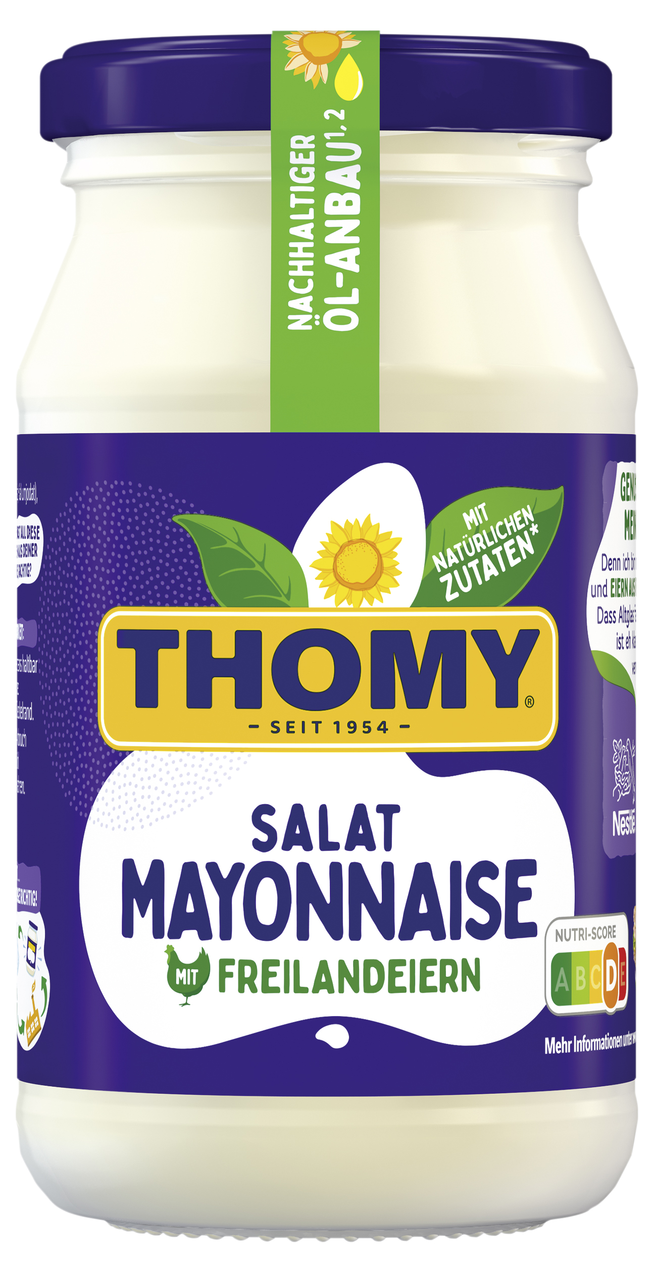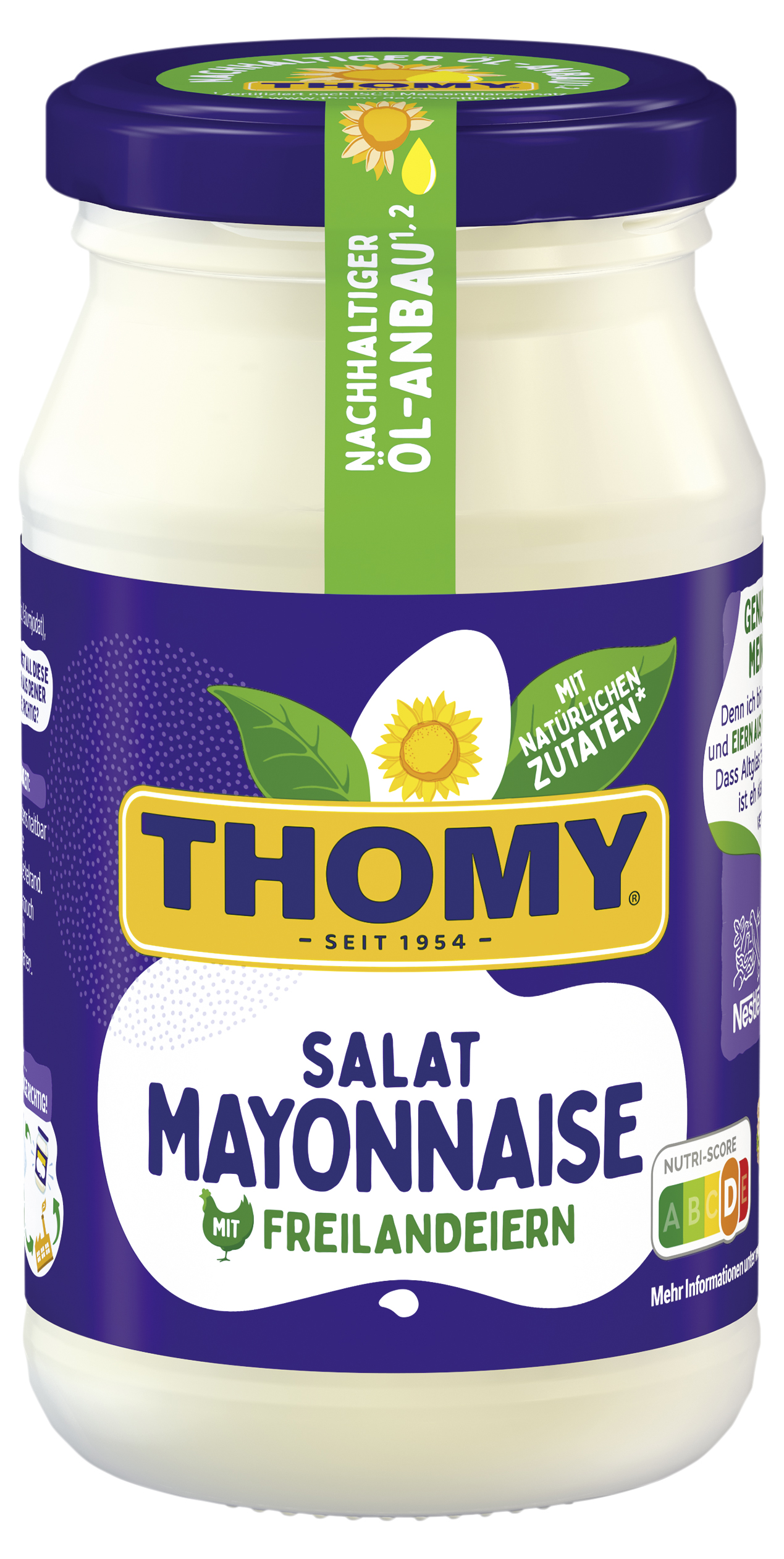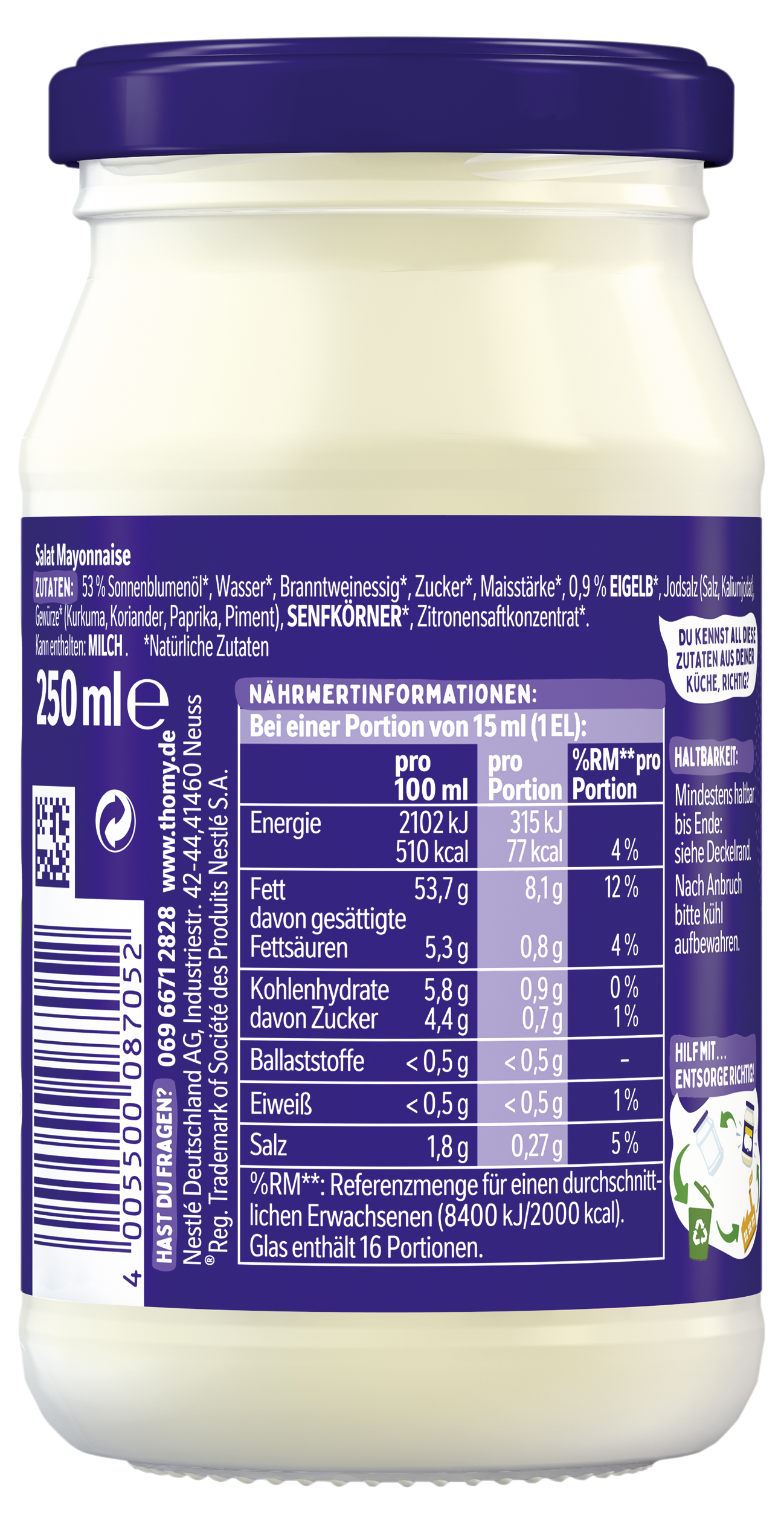 myTime Assortment Yes myTime Article Number 4502080462 myTime Product Title Thomy Salat Mayonnaise EAN 04005500087052 Material Number 11807250 Marke THOMY Product Name THOMY Salatmayonnaise Glas 250ml Net Content 250 Net Content UoM MLT Net Weight 246.25 Net Weight UoM GRM Artikel Höhe 120.000 Artikel Höhe UoM MMT Artikel Breite 65.000 Artikel Breite UoM MMT Artikel Länge 65.000 Artikel Länge UoM MMT Schlagwörter Salat, Mayo, Kartoffelsalat, Nudelsalat, Freilandeiern, Hamburger, Pommes, BBQ, grillen Bezeichnung Salat Mayonnaise Beschreibung GENUSS LIEGT IN MEINER NATUR Für den vollen Geschmack: Deckel ab! Denn ich bin mit natürlichen Zutaten* und Eiern aus Freilandhaltung gemacht. Dass Altglas fast zu 100 % recycelbar ist, ist eh klar. Und einen Teil davon verwenden wir selbst auch wieder. Schmeckt und fühlt sich gut an. • Mit Eiern aus Freilandhaltung und natürlichen Zutaten • Ohne Konservierungsstoffe • Mit reinem Sonnenblumenöl und besonders cremig-lecker • Nutri-Score D • Recycelbare Verpackung: Altglas fast zu 100 % recycelbar • Ideal für Kartoffel- & Nudelsalate, Sandwiches, Pommes oder noch vieles mehr. THOMY… hier kommt der Genuss In höchster THOMY-Qualität Der Nutri-Score ist ein freiwilliges Kennzeichnungssystem, das als Orientierungshilfe dient, Lebensmittel nach ihrer Nährwertqualität zu bewerten. Verbraucher können mithilfe der fünfstufigen und farbig hinterlegten Buchstabenskala das Nährwertprofil eines Produkts erkennen. Zutaten Zutaten: 53% Sonnenblumenöl*, Wasser*, Branntweinessig*, Zucker*, Maisstärke*, 0,9% EIGELB*, Jodsalz (Salz, Kaliumjodat), Gewürze* (Kurkuma, Koriander, Paprika, Piment), SENFKÖRNER*, Zitronensaftkonzentrat*. Kann enthalten: MILCH. *Natürliche Zutaten