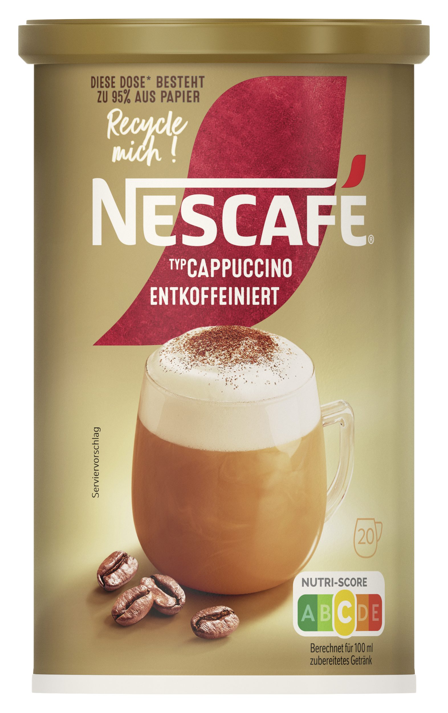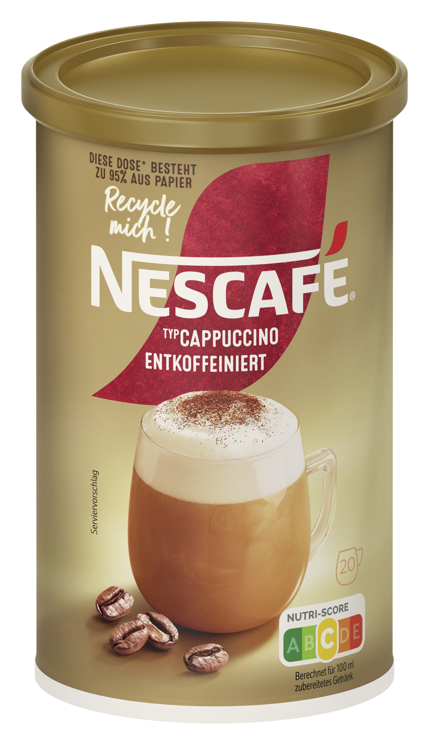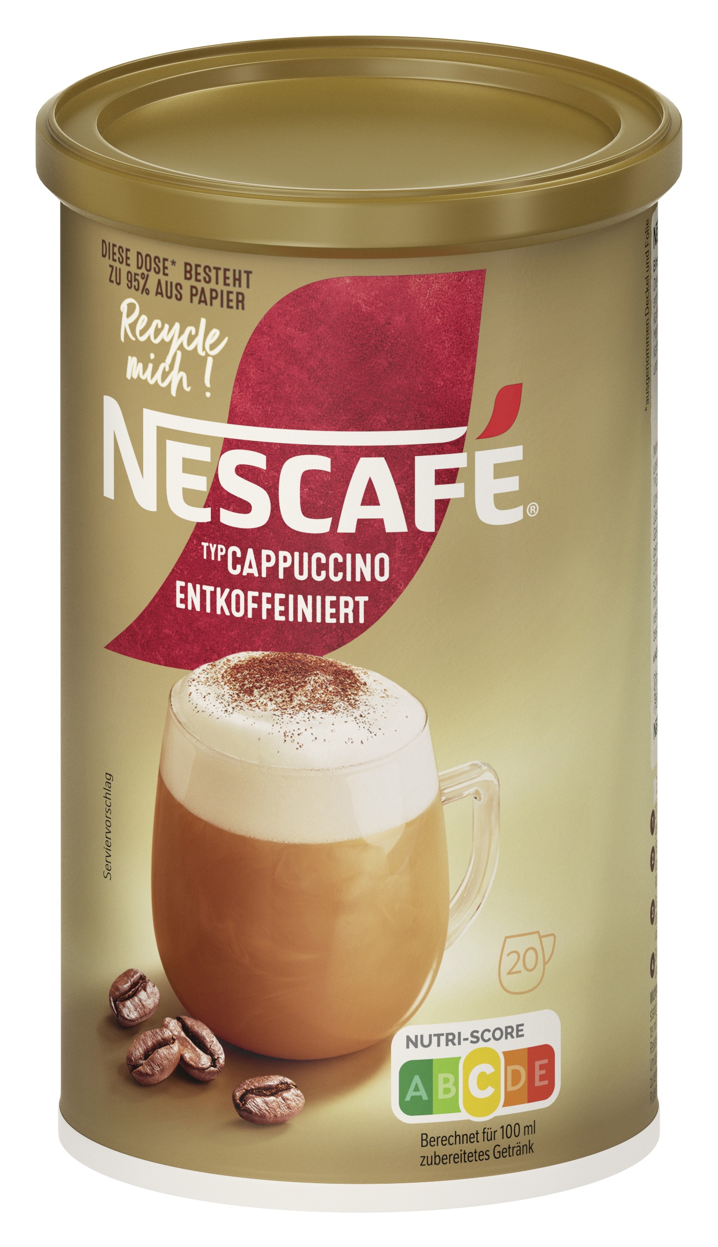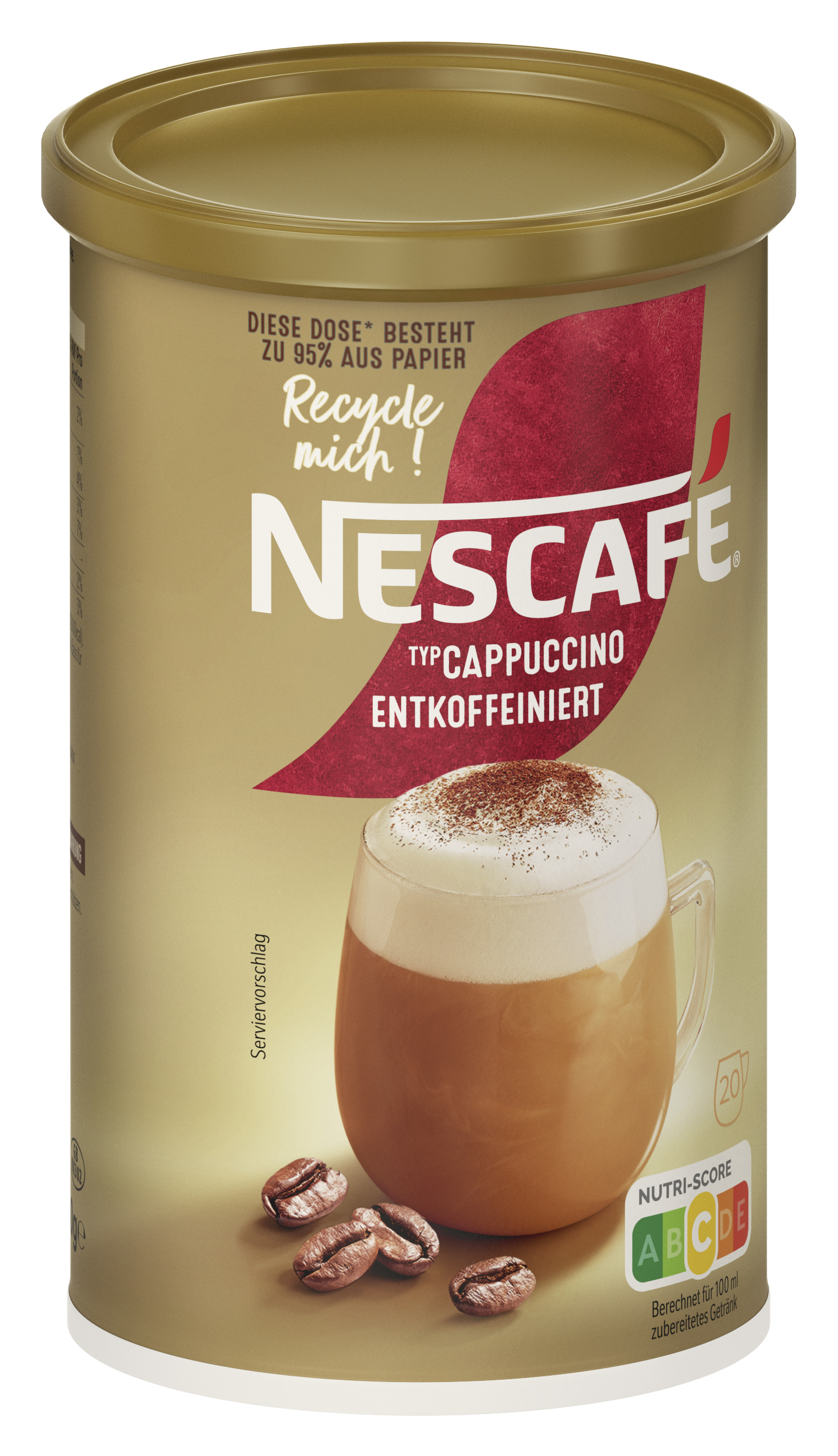 EAN 07613032569570 Material Number 12503343 Marke NESCAFE Product Name NESCAFE Typ Cappuccino Entkoffeiniert 250g Net Content 250.000 Net Content UoM GRM Net Weight 250 Net Weight UoM GRM Artikel Höhe 137.000 Artikel Höhe UoM MMT Artikel Breite 73.000 Artikel Breite UoM MMT Artikel Länge 73.000 Artikel Länge UoM MMT Bezeichnung Getränkepulver mit entkoffeiniertem löslichem Bohnenkaffee. Beschreibung Eine kleine Tasse kann Großes bewirken. Dieser NESCAFE Typ Cappuccino entkoffeiniert enthält zu 100% verantwortungsvoll beschafften Kaffee. Das bedeutet nachhaltige Anbau-Methoden und bessere Lebensbedingungen der Kaffeefarmer. Nimm dir einen Moment mit unserem leckeren NESCAFE Typ Cappuccino entkoffeiniert. Unser Kaffeeerlebnis überzeugt durch feinen Geschmack von sorgfältig geröstetem Kaffee und cremig-leichtem Löffelschaum. Hergestellt mit ausgewähltem und verantwortungsvoll beschafftem Kaffee. Zubereitung Zubereitung: 1. 2-3 Löffel in eine Tasse geben. 2. 150ml heißes (nicht kochendes) Wasser unter Rühren hinzugeben. 3. Ca. 20 Sek. abkühlen lassen, damit sich die Kaffeenote vollständig entfalten kann. 4. Ein zweites Mal umrühren und genießen. Zutaten Zutaten: Zucker, Glukosesirup, MAGERMILCHPULVER (20,4%), entkoffeinierter löslicher Bohnenkaffee (14,1%), Kokosnussöl, MILCHZUCKER, Säureregulator (Natriumcarbonate, Citronensäure), Salz, natürliches Aroma.