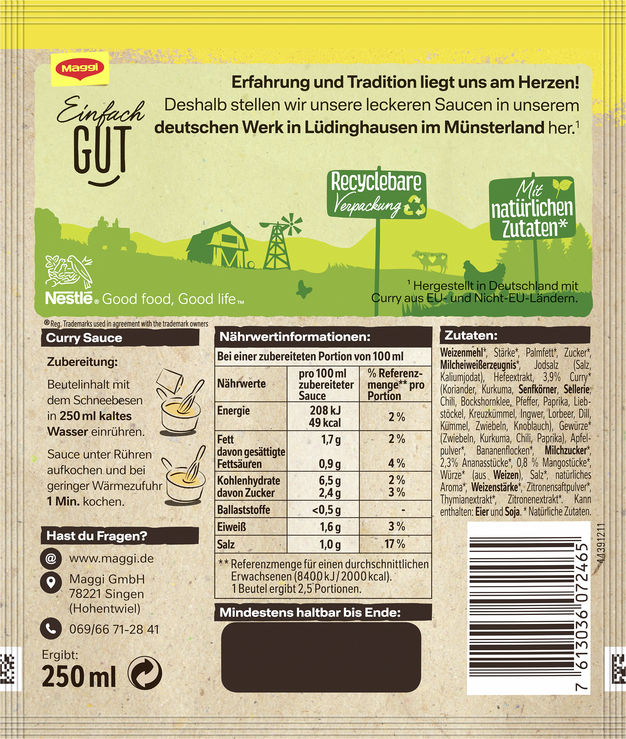 myTime Assortment Yes myTime Article Number 4502070596 myTime Product Title Maggi Für Geniesser Curry Sauce EAN 07613036072465 Material Number 12337745 Marke MAGGI Product Name MAGGI FÜR GENIESSER Curry Sauce, ergibt 250ml Net Content 250 Net Content UoM MLT Net Weight 30 Net Weight UoM GRM Artikel Höhe 150.000 Artikel Höhe UoM MMT Artikel Breite 127.000 Artikel Breite UoM MMT Artikel Länge 11.000 Artikel Länge UoM MMT Schlagwörter Fertigsauce, Curry Gewürz, Knorr, currysauce, currysoße, curry soße, currysauce rezept, curry sauce, currysoße rezept, rezept currysauce, currysauce für currywurst, currysoße für currywurst, schnelle currysauce, currysauce hähnchen, currysauce reis Bezeichnung Curry Sauce Beschreibung Die mit Madras Curry verfeinerte Currysauce von Maggi bietet alles, was eine perfekte Curry Sauce ausmacht. Bei der cremigen Sauce schmeckt man die feine Auswahl an aromatischen Gewürzen mit jedem Bissen. So eignet sie sich hervorragend für Gemüsegerichte, mit beispielsweise Karotten. Eine weitere beliebte Variante ist, die Sauce zu Samosas – indische Teigtaschen – zu reichen. Kurz zusammengefasst – Maggi Curry Sauce: • Ergibt 250ml Sauce bzw. ca. 2,5 Portionen • Schnelle Currysauce • Mit Madras Curry verfeinert • Ideale Sauce zu Geflügel, Fisch, Currywurst und vielen weiteren Gerichten • Vegetarisch • Minimaler Zeitaufwand • Maximale Erfolgsgarantie bei vollmundigem Geschmack • Ausgewählte Zutaten Unsere Curry Sauce Rezeptidee zum Nachkochen: Curry-Kokos-Sauce. 1 kleine Dose à 160ml Kokosmilch mit Wasser auf 250ml ergänzen. Sauce darin nach Anweisung zubereiten. Mit Chili aus der Mühle nach Belieben abschmecken. Weitere kreative und leckere Ideen für noch mehr Inspiration und Abwechslung beim Kochen gibt´s im Rezeptbereich auf maggi.de – Natürlich mit Geling-Garantie. Zubereitung Zubereitung: Beutelinhalt mit dem Schneebesen in 250 ml kaltes Wasser einrühren. Sauce unter Rühren aufkochen und bei geringer Wärmezufuhr 1 Min. kochen. Zutaten Zutaten: WEIZENMEHL*, Stärke*, Palmfett*, Zucker*, MILCHEIWEISSERZEUGNIS*, Jodsalz (Salz, Kaliumjodat), Hefeextrakt, 3,9% Curry* (Koriander, Kurkuma, SENFKÖRNER, SELLERIE, Chili, Bockshornklee, Pfeffer, Paprika, Liebstöckel, Kreuzkümmel, Ingwer, Lorbeer, Dill, Kümmel, Zwiebeln, Knoblauch), Gewürze* (Zwiebeln, Kurkuma, Chili, Paprika), Apfelpulver*, Bananenflocken*, MILCHZUCKER*, 2,3% Ananasstücke*, 0,8% Mangostücke*, Würze* (aus WEIZEN), Salz*, natürliches Aroma*, WEIZENSTÄRKE*, Zitronensaftpulver*, Thymianextrakt*, Zitronenextrakt*. Kann enthalten: EIER und SOJA. *Natürliche Zutaten.