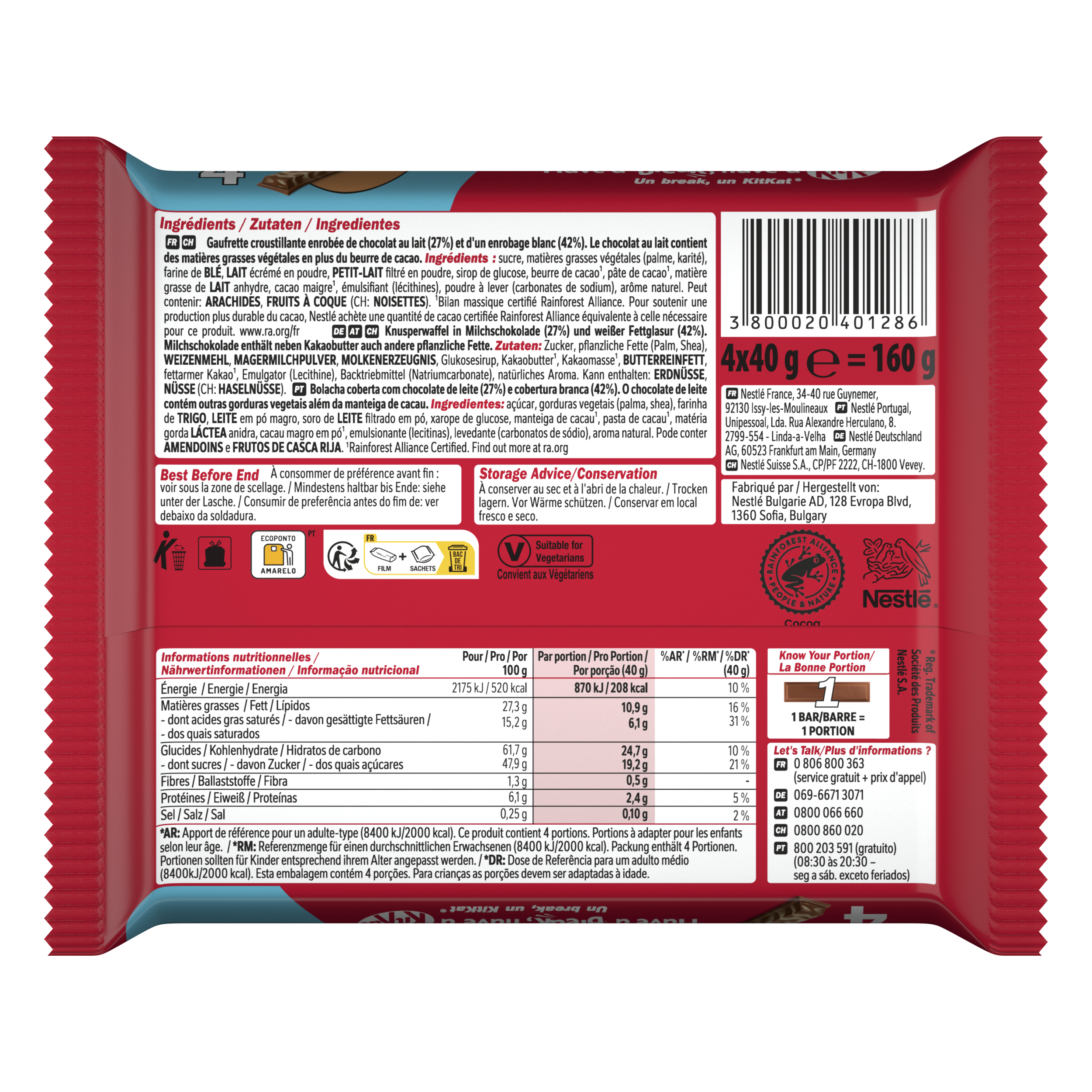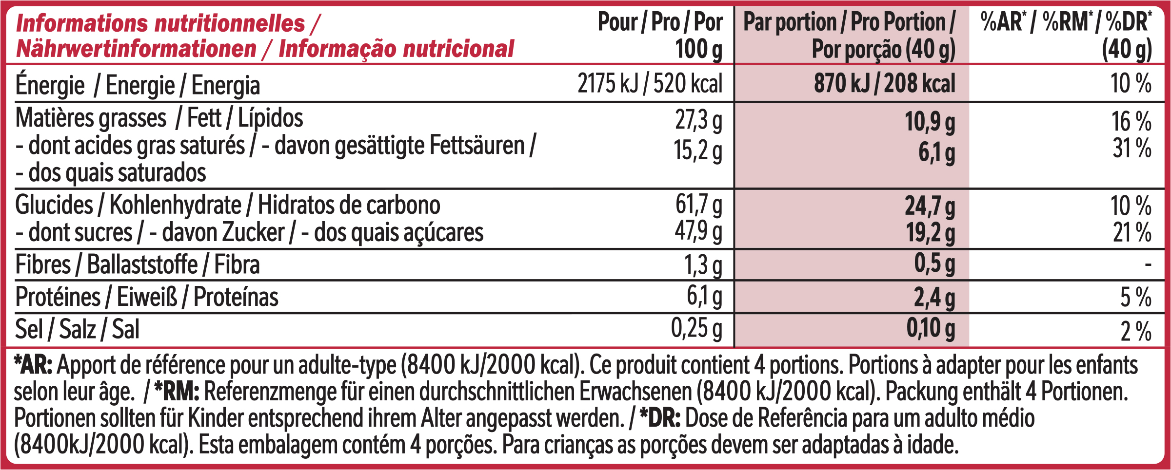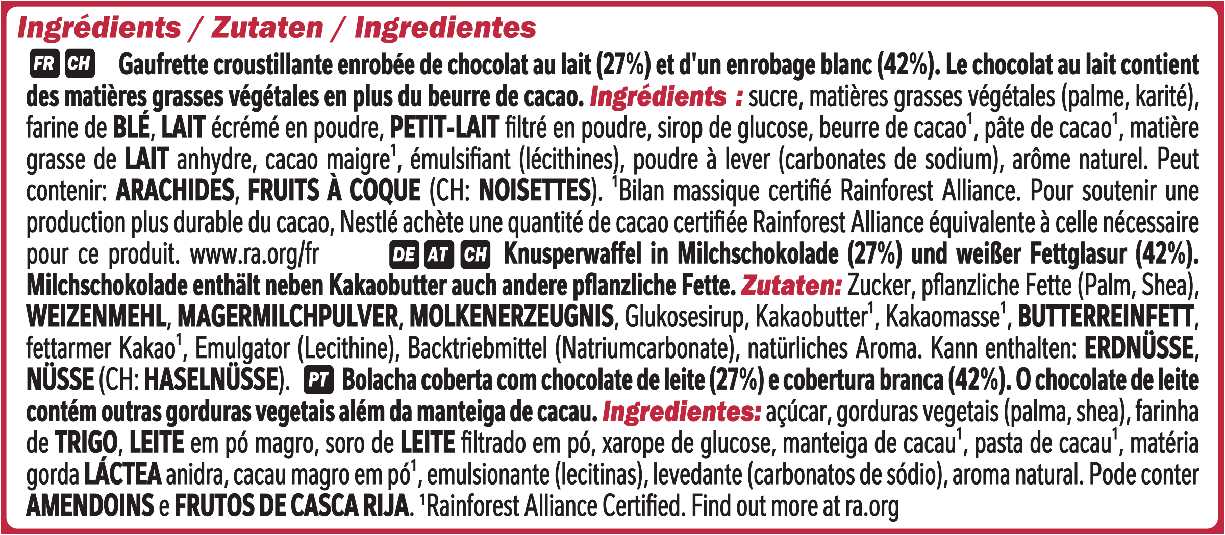 Sub Brand Name KIT KAT CHUNKY Brand Owner Name Société des Produits Nestlé S.A. Functional Name Knusperwaffel Country of Origin Bulgaria Allergen Statement Weizenmehl, Magermilchpulver, Molkenerzeugnis, Butterreinfett Haltbarkeit & Lagerung Trocken lagern. Vor Wärme schützen. Anwendungs- & Gebrauchshinweise Portionen sollten für Kinder entsprechend ihrem Alter angepasst werden. Dietary Regime Code VEGETARIAN Is Diet Type Marked on Package? TRUE Third Party Accreditation RAINFOREST_ALLIANCE_PEOPLE_NATURE Nutritional Table 1 Zubereitungsgrad Bezugsgröße Portionsgröße Portionsgröße Beschreibung Tagesdosis Referenzwert Nährstoff: Teil von… Messgenauigkeit Nährwert % Messgenauigkeit % Referenzmenge UNPREPARED1PTN40GRMReferenzmenge für einen durchschnittlichen Erwachsenen (8400 kJ/ 2000 kcal).ENER-EnergieAPPROXIMATELY208kCal10 UNPREPARED1PTN40GRMReferenzmenge für einen durchschnittlichen Erwachsenen (8400 kJ/ 2000 kcal).ENER-EnergieAPPROXIMATELY870kJ10 UNPREPARED1PTN40GRMReferenzmenge für einen durchschnittlichen Erwachsenen (8400 kJ/ 2000 kcal).FATFettAPPROXIMATELY10.9g16 UNPREPARED1PTN40GRMReferenzmenge für einen durchschnittlichen Erwachsenen (8400 kJ/ 2000 kcal).FASATFett, davon gesättigte FettsäurenAPPROXIMATELY6.1g31 UNPREPARED1PTN40GRMReferenzmenge für einen durchschnittlichen Erwachsenen (8400 kJ/ 2000 kcal).CHOAVLKohlenhydrateAPPROXIMATELY24.7g10 UNPREPARED1PTN40GRMReferenzmenge für einen durchschnittlichen Erwachsenen (8400 kJ/ 2000 kcal).SUGAR-Kohlenhydrate, davon ZuckerAPPROXIMATELY19.2g21 UNPREPARED1PTN40GRMReferenzmenge für einen durchschnittlichen Erwachsenen (8400 kJ/ 2000 kcal).FIBTGBallaststoffeAPPROXIMATELY0.5g UNPREPARED1PTN40GRMReferenzmenge für einen durchschnittlichen Erwachsenen (8400 kJ/ 2000 kcal).PRO-EiweißAPPROXIMATELY2.4g5 UNPREPARED1PTN40GRMReferenzmenge für einen durchschnittlichen Erwachsenen (8400 kJ/ 2000 kcal).SALTEQSalz ÄquivalentAPPROXIMATELY0.10g2 Nutritional Table 2 Zubereitungsgrad Bezugsgröße Portionsgröße Portionsgröße Beschreibung Tagesdosis Referenzwert Nährstoff: Teil von… Messgenauigkeit Nährwert % Messgenauigkeit % Referenzmenge UNPREPARED100GRMENER-EnergieAPPROXIMATELY520kCal UNPREPARED100GRMENER-EnergieAPPROXIMATELY2175kJ UNPREPARED100GRMFATFettAPPROXIMATELY27.3g UNPREPARED100GRMFASATFett, davon gesättigte FettsäurenAPPROXIMATELY15.2g UNPREPARED100GRMCHOAVLKohlenhydrateAPPROXIMATELY61.7g UNPREPARED100GRMSUGAR-Kohlenhydrate, davon ZuckerAPPROXIMATELY47.9g UNPREPARED100GRMFIBTGBallaststoffeAPPROXIMATELY1.3g UNPREPARED100GRMPRO-EiweißAPPROXIMATELY6.1g UNPREPARED100GRMSALTEQSalz ÄquivalentAPPROXIMATELY0.25g Contact Nestlé Deutschland AG Contact Address 60523 Frankfurt am Main, Germany