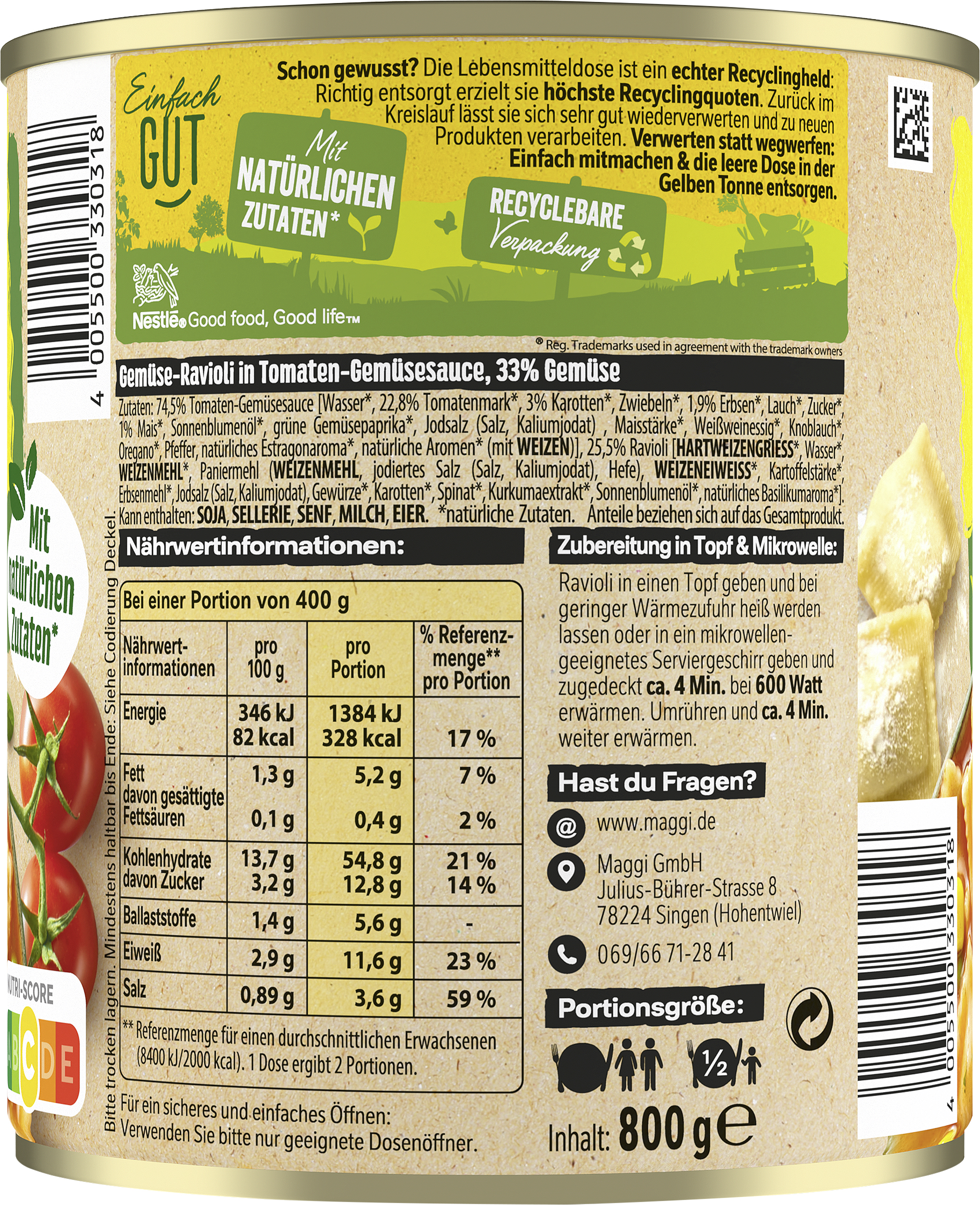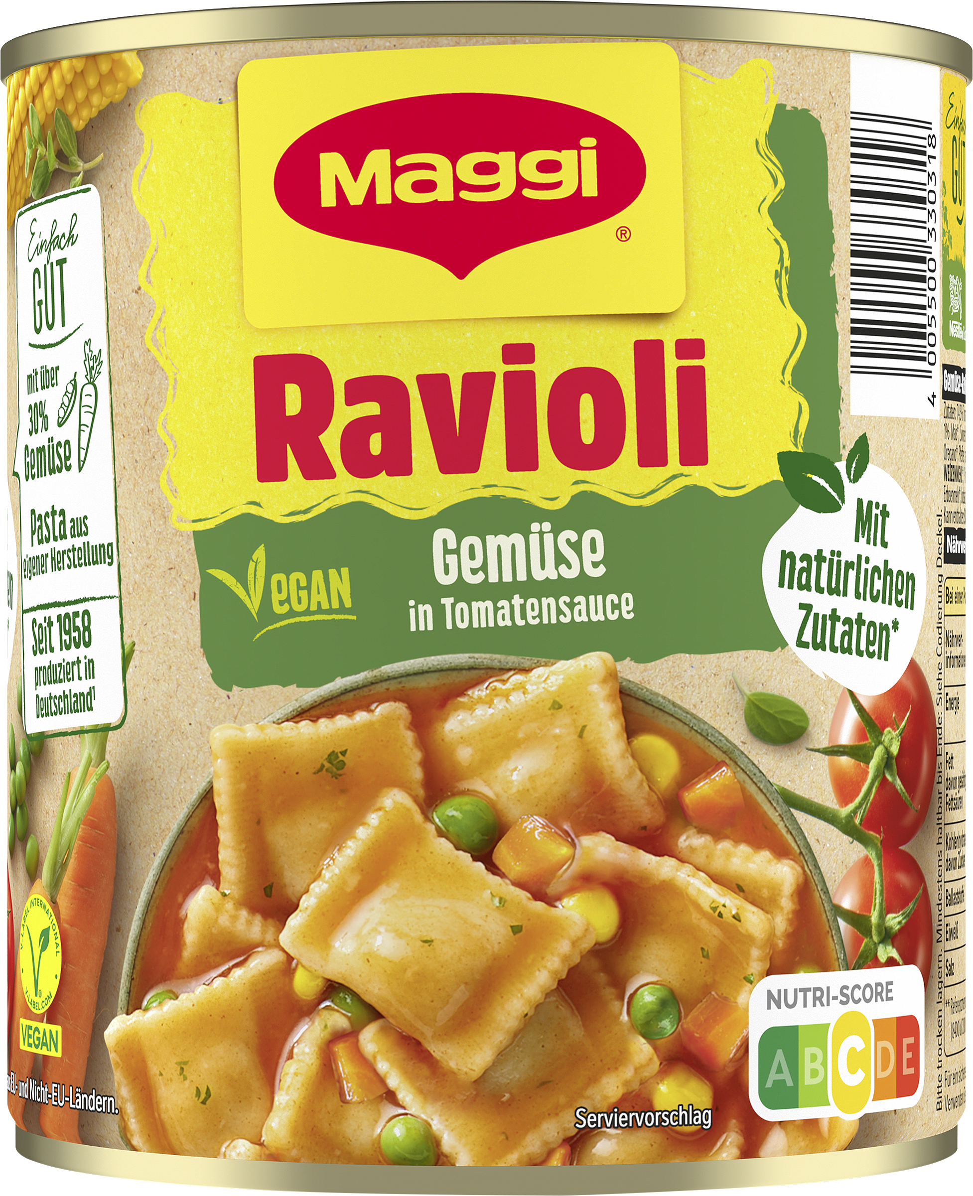 myTime Assortment Yes myTime Article Number 4502050080 myTime Product Title Maggi Gemüse Ravioli EAN 04005500330318 Material Number 12361215 Marke MAGGI Product Name MAGGI Gemüse Ravioli 800g Net Content 800 Net Content UoM GRM Net Weight 800 Net Weight UoM GRM Artikel Höhe 118.000 Artikel Höhe UoM MMT Artikel Breite 102.000 Artikel Breite UoM MMT Artikel Länge 102.000 Artikel Länge UoM MMT Schlagwörter dosenravioli, vegan, ravioli, gemüse, tomatensauce, karotten, erbsen, fleischfrei Bezeichnung Gemüse-Ravioli in Tomaten-Gemüsesauce, 33% Gemüse Beschreibung Unkompliziert, schnell und lecker: MAGGI Ravioli Gemüsee bringen pflanzlichen Genuss in den Alltag – ob als warmes Mittagessen zuhause, unterwegs beim Camping mit Freunden oder als schnelles Essen im Büro. Die veganen Ravioli mit feiner Gemüsefüllung und fruchtiger Tomatensauce sind ideal für alle, die eine Abwechselung zu Fleisch suchen. Zubereitung: Einfach den Doseninhalt in einen Topf oder ein mikrowellengeeignetes Serviergeschirr geben, bei geringer Hitze erwärmen und zwischendurch umrühren – fertig ist der warme, vegane Genuss! Ob als schnelle Mahlzeit zwischendurch, pflanzlicher Campingklassiker oder warmes Wohlfühlessen am Abend: Mit MAGGI wird’s schnell, einfach und richtig lecker. Zubereitung Zubereitung in Topf & Mikrowelle: Ravioli in einen Topf geben und bei geringer Wärmezufuhr heiß werden lassen oder in ein mikrowellengeeignetes Serviergeschirr geben und zugedeckt ca. 4 Min. bei 600 Watt erwärmen. Umrühren und ca. 4 Min. weiter erwärmen. Zutaten Zutaten: 74,5% Tomaten-Gemüsesauce [Wasser*, 22,8% Tomatenmark*, 3% Karotten*, Zwiebeln*, 1,9% Erbsen*, Lauch*, Zucker*, 1% Mais*, Sonnenblumenöl*, grüne Gemüsepaprika*, Jodsalz (Salz, Kaliumjodat), Maisstärke*, Weinessig*, Knoblauch*, Oregano*, Pfeffer, natürliches Estragonaroma*, natürliche Aromen* (mit WEIZEN)], 25,5% Ravioli [HARTWEIZENGRIESS*, Wasser*, WEIZENMEHL*, Paniermehl (WEIZENMEHL, jodiertes Salz (Salz, Kaliumjodat), Hefe), WEIZENEIWEISS*, Kartoffelstärke*, Erbsenmehl*, Jodsalz (Salz, Kaliumjodat), Gewürze*, Karotten*, Spinat*, Kurkumaextrakt*, Sonnenblumenöl*, natürliches Basilikumaroma*]. Kann enthalten: SOJA, SELLERIE, SENF, MILCH, EIER. *natürliche Zutaten.