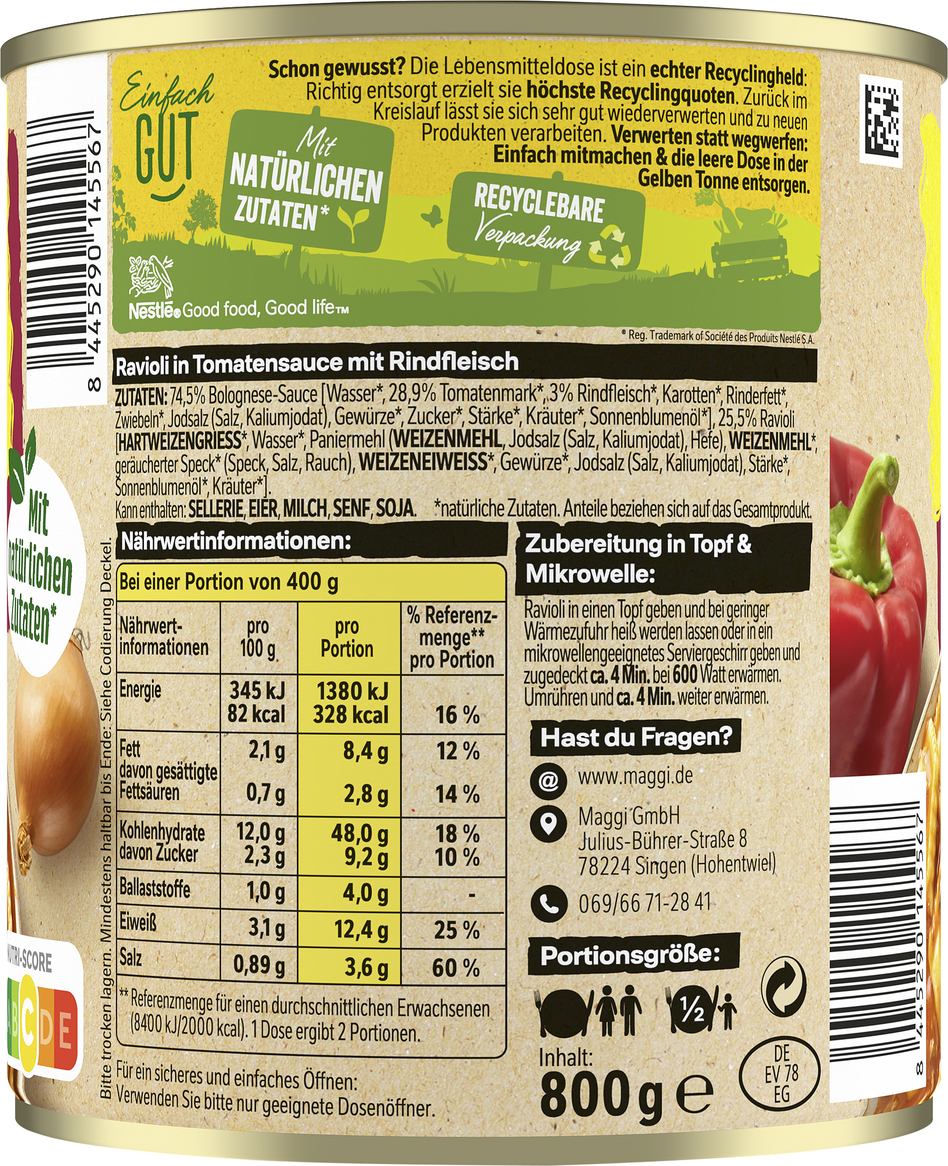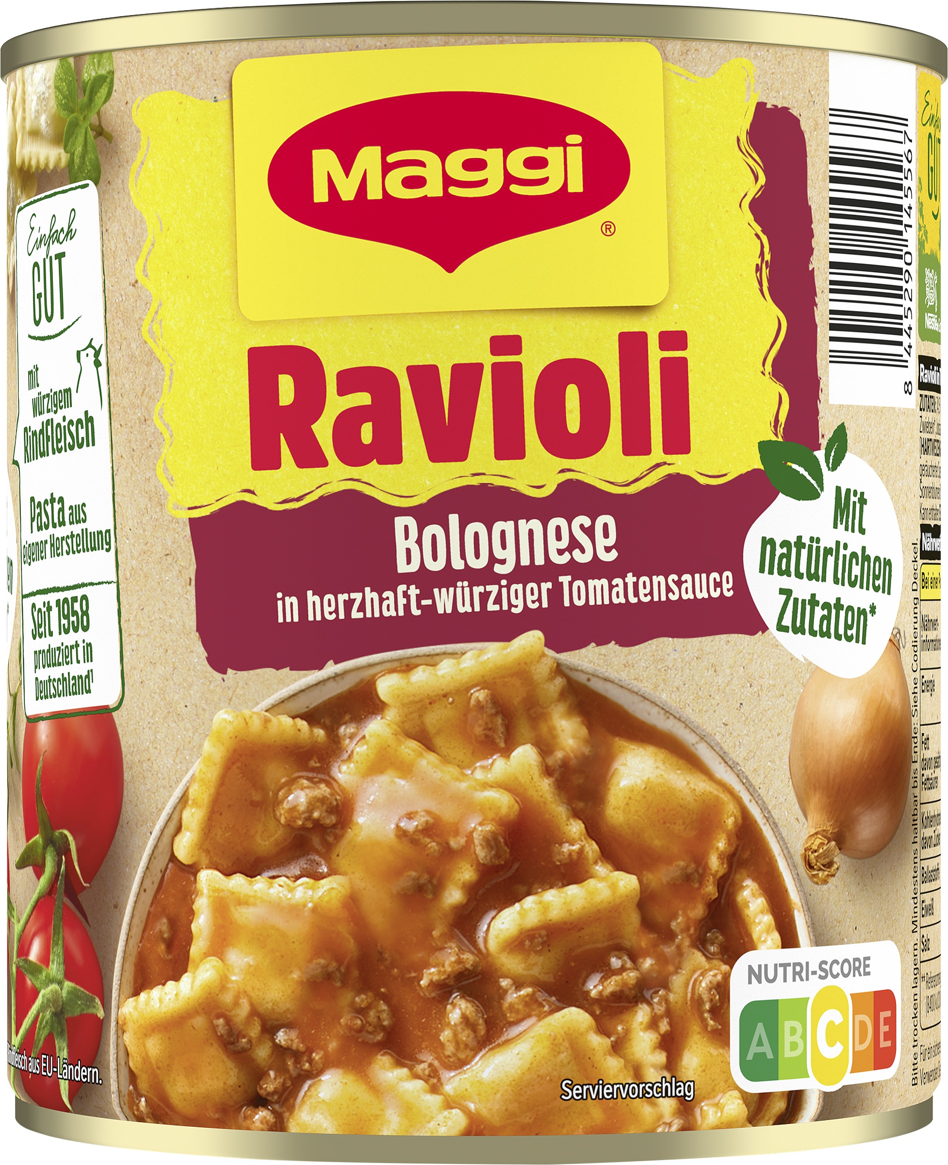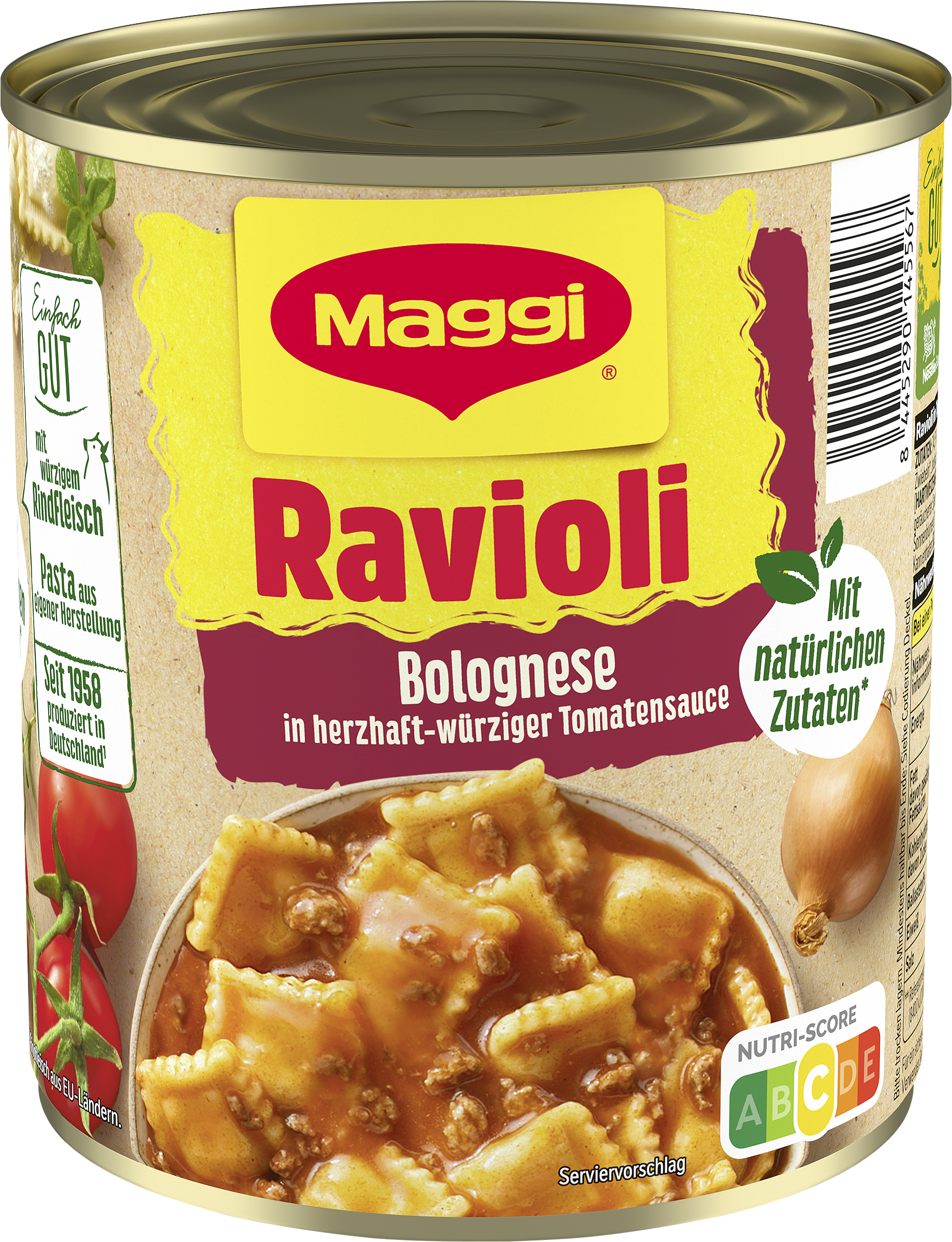 myTime Assortment Yes myTime Article Number 4502051671 myTime Product Title Maggi Ravioli Bolognese EAN 08445290145567 Material Number 12512223 Marke MAGGI Product Name MAGGI Ravioli Bolognese 800g Net Content 800.000 Net Content UoM GRM Net Weight 800 Net Weight UoM GRM Artikel Höhe 118.000 Artikel Höhe UoM MMT Artikel Breite 102.000 Artikel Breite UoM MMT Artikel Länge 102.000 Artikel Länge UoM MMT Schlagwörter dosenravioli, bolognese, ravioli, fleisch, tomatensauce, rindfleisch, schnelles, fertiggericht, convenience food, dose, mikrowelle, festival, camping, produkt, kleine mahlzeit, fertigessen, unterwegs, büro, pasta to go, reise Bezeichnung Ravioli in Tomatensauce mit Rindfleisch Beschreibung Unkompliziert, schnell und lecker: MAGGI Ravioli Bolognese bringen den herzhaften Geschmack der italienischen Küche in den Alltag – ob als warmes Mittagessen zuhause, unterwegs beim Camping mit Freunden oder als schnelles Essen im Büro. Die herzhaft gefüllten Ravioli in würziger Bolognese-Sauce mit Rindfleisch sind ideal für alle, die klassische Gerichte lieben. Zubereitung: Einfach den Doseninhalt in einen Topf oder ein mikrowellengeeignetes Serviergeschirr geben, bei geringer Hitze erwärmen und zwischendurch umrühren – fertig ist der warme Bolognese-Genuss! Ob als herzhafte Mahlzeit zwischendurch, Klassiker für unterwegs oder unkompliziertes Abendessen: Mit MAGGI wird’s schnell, einfach und richtig lecker. Zubereitung Zubereitung in Topf & Mikrowelle: Ravioli in einen Topf geben und bei geringer Wärmezufuhr heiß werden lassen oder in ein mikrowellengeeignetes Serviergeschirr geben und zugedeckt ca. 4 Min. bei 600 Watt erwärmen. Umrühren und ca. 4 Min. weiter erwärmen. Zutaten Zutaten: 74,5% Bolognese-Sauce [Wasser*, 28,9% Tomatenmark*, 3% Rindfleisch*, Karotten*, Rinderfett*, Zwiebeln*, Jodsalz (Salz, Kaliumjodat), Gewürze*, Zucker*, Stärke*, Kräuter*, Sonnenblumenöl*], 25,5% Ravioli [HARTWEIZENGRIESS*, Wasser*, Paniermehl (WEIZENMEHL, Jodsalz (Salz, Kaliumjodat), Hefe), WEIZENMEHL*, geräucherter Speck* (Speck, Salz, Rauch), WEIZENEIWEISS*, Gewürze*, Jodsalz (Salz, Kaliumjodat), Stärke*, Sonnenblumenöl*, Kräuter*]. Kann enthalten: SELLERIE, EIER, MILCH, SENF, SOJA. *natürliche Zutaten. Anteile beziehen sich auf das Gesamtprodukt.