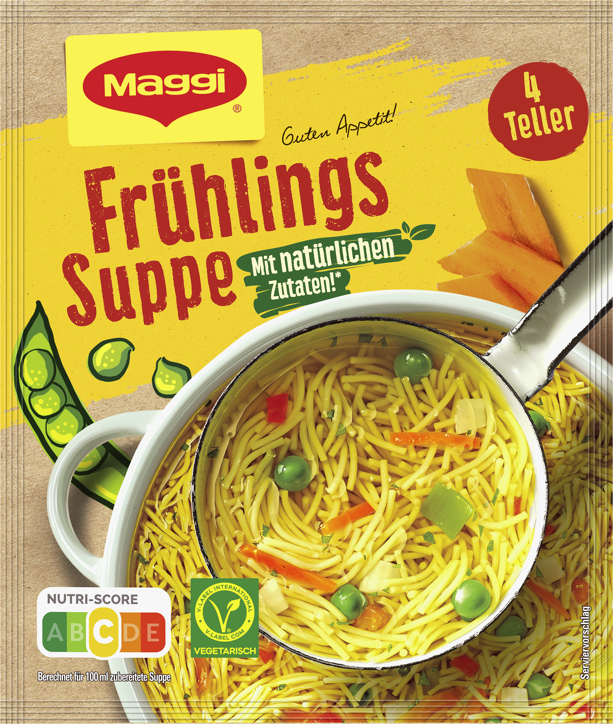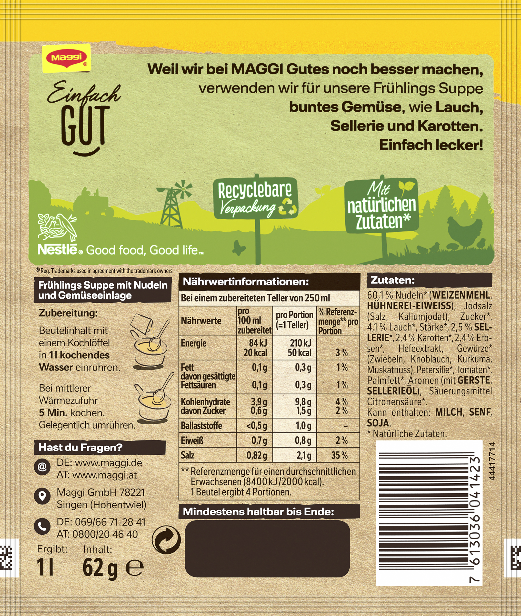 myTime Assortment Yes myTime Article Number 4502070020 EAN 07613036041423 Material Number 12335759 Marke MAGGI Product Name MAGGI GUTEN APPETIT Frühlings Suppe 62g, Ergibt 1000ml Net Content 1 Net Content UoM LTR Net Weight 62 Net Weight UoM GRM Artikel Höhe 150.000 Artikel Höhe UoM MMT Artikel Breite 127.000 Artikel Breite UoM MMT Artikel Länge 19.000 Artikel Länge UoM MMT Schlagwörter Tütensuppe, Fertigsuppe, Knorr Bezeichnung Frühlings Suppe mit Nudeln und Gemüseeinlage Beschreibung Lust auf eine leckere Frühlings Suppe? Mit Maggi Guten Appetit Frühlings Suppe ist die herzhafte klare Frühlings Suppe mit Möhren, Erbsen, Lauch, Sellerie und Fadennudeln im Handumdrehen zubereitet. Die Suppe mit Gemüse und Nudeln ist perfekt für den Frühling und zu Ostern, aber auch in den kalten Monaten eine leckere Mahlzeit. Die Zubereitung der Maggi Guten Appetit Frühlings Suppe ist schnell und unkompliziert. Rühre den Beutelinhalt mit einem Kochlöffel in 1 L kochendes Wasser ein. Lass das Ganze unter Rühren aufkochen und bei mittlerer Wärmezufuhr für etwa 5 Minuten kochen. Dabei gelegentlich umrühren. Fertig sind vier Teller der herzhaften Suppe mit Gemüse. Maggi Guten Appetit Frühlings Suppe ist wie geschaffen für den Frühling und die Osterzeit. Aber auch an kälteren Tagen sorgt die Suppe mit Gemüse für Abwechslung in der Küche. Die Frühlingssuppe kann sowohl als leckere Vorspeise als auch als eigenständige Mahlzeit mit einem Stück Brot serviert werden. Maggi Guten Appetit Frühlings Suppe: • Dafür wird benötigt: ein Topf, ein Kochlöffel und 1 L Wasser. • Ergibt vier Teller leckere Suppe mit Gemüse. • Klare Frühlingssuppe mit Nudeln, gemüsig mit Erbsen, Lauch & Karotten. • Einfach und schnell zuzubereiten. • Guten-Appetit-Tipp: Würstchenscheiben in die Suppe mit Gemüse geben. Zubereitung Zubereitung: Beutelinhalt mit einem Kochlöffel in 1 l kochendes Wasser einrühren. Bei mittlerer Wärmezufuhr 5 Min. kochen. Gelegentlich umrühren. Zutaten Zutaten: 60,1 % Nudeln* (WEIZENMEHL, HÜHNEREI-EIWEISS), Jodsalz (Salz, Kaliumjodat), Zucker*, 4,1 % Lauch*, Stärke*, 2,5 % SELLERIE*, 2,4 % Karotten*, 2,4 % Erbsen*, Hefeextrakt, Gewürze* (Zwiebeln, Knoblauch, Kurkuma, Muskatnuss), Petersilie*, Tomaten*, Palmfett*, Aromen (mit GERSTE, SELLERIEÖl), Säuerungsmittel Citronensäure*.