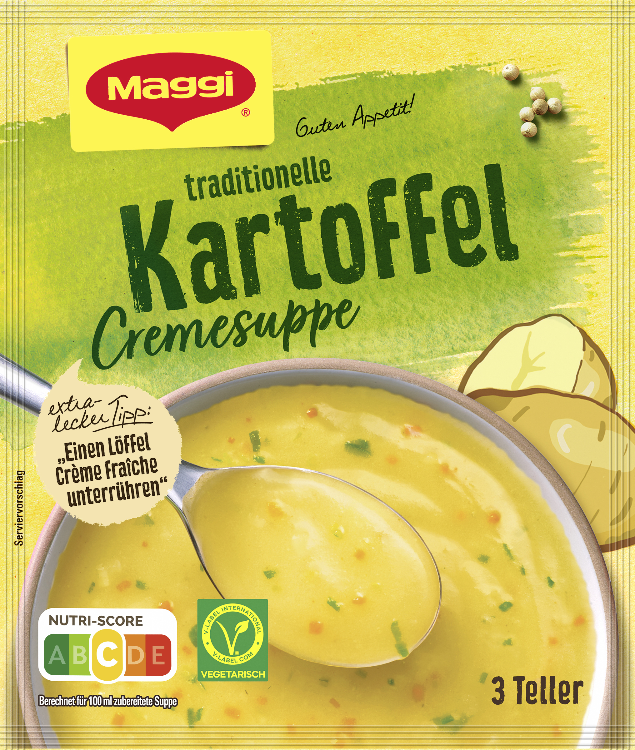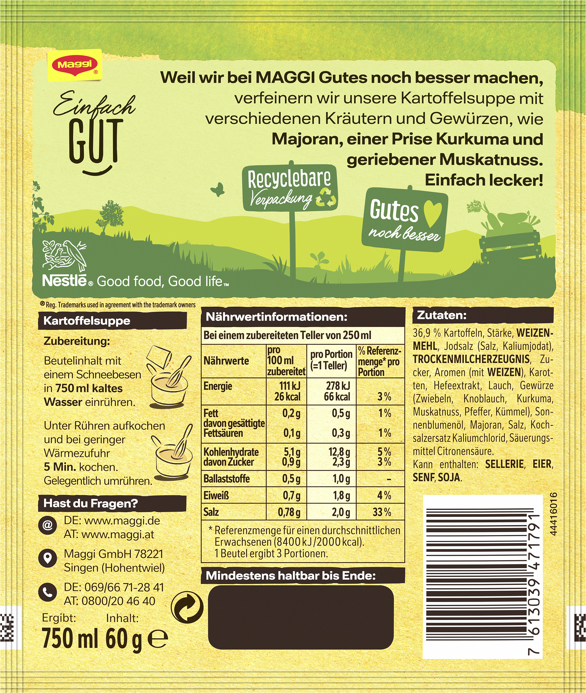myTime Assortment Yes myTime Article Number 4502073229 myTime Product Title Maggi Guten Appetit Kartoffel Cremesuppe EAN 07613039471791 Material Number 12444296 Marke MAGGI Product Name MAGGI GUTEN APPETIT Kartoffelcremesuppe, ergibt 750ml Net Content 750 Net Content UoM MLT Net Weight 60 Net Weight UoM GRM Artikel Höhe 150.000 Artikel Höhe UoM MMT Artikel Breite 127.000 Artikel Breite UoM MMT Artikel Länge 14.000 Artikel Länge UoM MMT Schlagwörter Kartoffelcremesuppe, Kartoffelcreme Suppe, Cremesuppe, Wärmende Suppe, Tütensuppe Bezeichnung Kartoffelsuppe Beschreibung Soll eine deftige Suppenmahlzeit auf den Tisch, die schnell gemacht ist und allen schmeckt, dann ist die Maggi Guten Appetit Kartoffelcreme Suppe die richtige Wahl: Die herzhafte Kartoffelcreme Suppe ist ein Klassiker der deutschen Hausmannsküche und ein Genuss für die ganze Familie. Zubereitung Zubereitung: Beutelinhalt mit einem Schneebesen in 750 ml kaltes Wasser einrühren. Unter Rühren aufkochen und bei geringer Wärmezufuhr 5 Min. kochen. Gelegentlich umrühren. Zutaten Zutaten: 36,9 % Kartoffeln, Stärke, WEIZENMEHL, Jodsalz (Salz, Kaliumjodat), TROCKENMILCHERZEUGNIS, Zucker, Aromen (mit WEIZEN), Karotten, Hefeextrakt, Lauch, Gewürze (Zwiebeln, Knoblauch, Kurkuma, Muskatnuss, Pfeffer, Kümmel), Sonnenblumenöl, Majoran, Salz, Kochsalzersatz Kaliumchlorid, Säuerungsmittel Citronensäure.