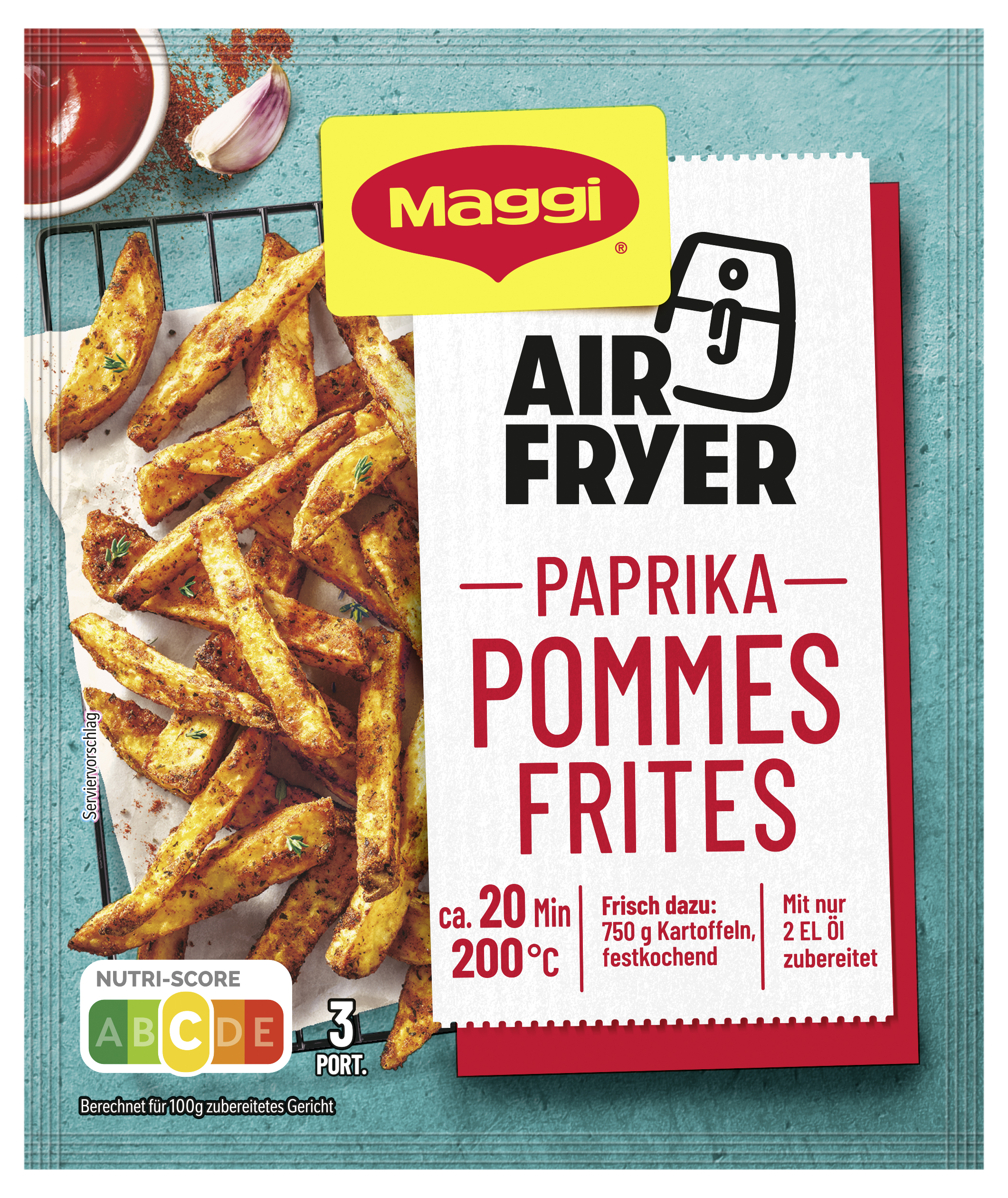 myTime Assortment Yes myTime Article Number 4502073434 myTime Product Title Maggi Fix Air Fryer Paprika Pommes Frites EAN 08445291877610 Material Number 12623123 Marke MAGGI Product Name MAGGI FIX Airfryer Pommes Frites Paprika 34g Net Content 34.000 Net Content UoM GRM Net Weight 34 Net Weight UoM GRM Artikel Höhe 150.000 Artikel Höhe UoM MMT Artikel Breite 127.000 Artikel Breite UoM MMT Artikel Länge 10.000 Artikel Länge UoM MMT Schlagwörter aerogrill, airfreyer, airfyer, friteuse, fritöse, fryers, gewürz, gewürze, grill, grillgewürze, heissluftfriteuse, heissluftfritteuse, heißluftfriteuse, heißluftfritteusen, heißluftfritöse, luftfritteuse, MAGGIe, spices, würze, air fryer, fritteusen, heißluft, fries Bezeichnung Würzmischung für Pommes Frites mit Paprika Beschreibung MAGGI FIX Air Fryer Paprika Pommes Frites Würzmischung – würzige Pommes Frites einfach aus der Heißluftfritteuse oder Airfryer genießen. Knusprige, goldbraune Pommes Frites mit würzigem Paprika-Spice – mit der MAGGI FIX Air Fryer Würzmischung gelingen dir im Handumdrehen leckere Pommes Frites. • MAGGI FIX Air Fryer Würzmischung: Würzige Paprika-Mischung für perfekt knusprige Pommes Frites aus der Heißluftfritteuse • Mit natürlichen Zutaten: Feine Würze für aromatische Pommes Frites und vielseitig einsetzbar • Zubereitung: Kartoffeln in Stifte schneiden, mit 2 EL Öl und Würzmischung vermengen, im Airfryer oder Heißluftfritteuse knusprig backen • Schnell und einfach: In nur ca. 20 Minuten goldbraune, leckere Pommes Frites genießen • Lieferumfang: 1 x MAGGI FIX Air Fryer Paprika Pommes Frites Würzmischung Ob als Snack, Beilage oder als schnelles Mittagessen – mit wenigen Zutaten zauberst du zuhause köstliche Pommes Frites ohne Kompromisse. Natürlich mit MAGGI Qualität und ohne unnötige Zusatzstoffe. Mit MAGGI wird es schnell, einfach und richtig lecker. Zubereitung Bereite deine Knusper Pommes in 3 einfachen Schritten zu Zubereitung für 3 Portionen: 750g festkochende Kartoffeln, 2 EL Öl Schneiden: Kartoffeln schälen und in dünne Stifte schneiden. Im Sieb abspülen und gut abtropfen lassen. Mixen: Kartoffeln in einer Schüssel mit Öl mischen, Beutelinhalt darüber streuen und alles gut durchmischen. Kochen: In den Korb des vorgeheizten Airfryers geben und bei 200°C ca. 20 Min*. knusprig garen. Dabei mehrmals durch Schütteln wenden. (Weitere Zubereitungshinweise siehe folgende Übersicht.) *Die Kochzeit kann je nach Größe und Modell des Airfryers variieren. Stelle sicher, dass die Zutaten gut durchgegart sind. Die oben angegebene Zeit und Temperatur basieren auf einer Heißluftfritteuse mit 1700W+. Air Fryer 1700 W+: 200°C ca 20 Min. Air Fryer 2000 W+: 190°C ca. 20 Min. Ofen: 200°C ca. 30 Min. Zutaten Zutaten: Stärke*, Jodsalz (Salz, Kaliumjodat), Gewürze* (15,0% Paprika, 3,0% Knoblauch, Pfeffer), WEIZENMEHL*, Reismehl*, Zucker*, natürliche Aromen, Kräuter* (Petersilie, Kerbel), natürliches Knoblaucharoma*, Sonnenblumenöl*, Zitronensaft*, natürliches Zitronenaroma*. Kann enthalten: SELLERIE, EIER, MILCH, SENF, SOJA. *natürliche Zutaten