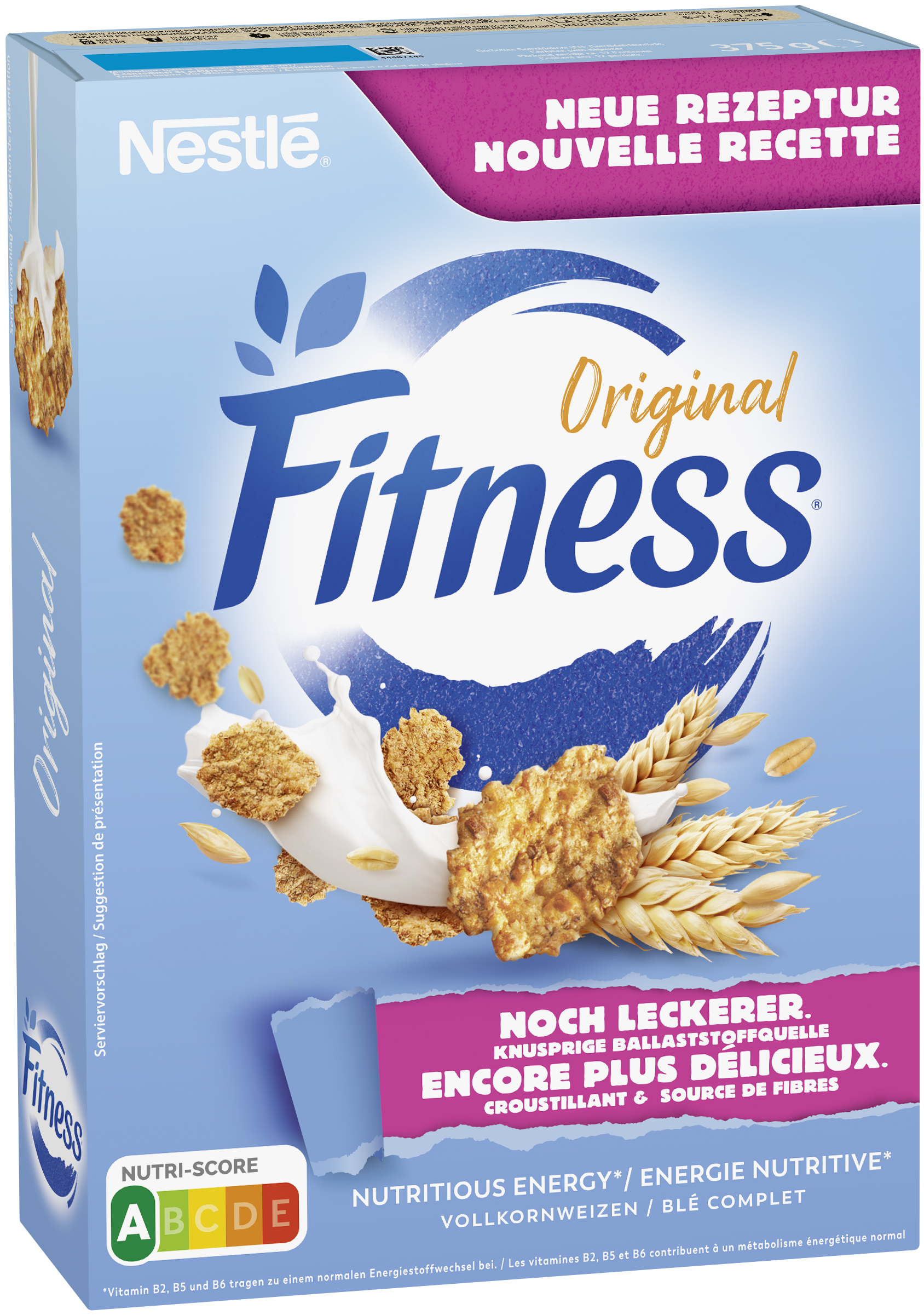 myTime Assortment Yes myTime Article Number 4502110057 myTime Product Title Nestlé Fitness Cerealien EAN 03387390339499 Material Number 12335740 Marke NESTLE Product Name NESTLE FITNESS Cerealien 375g Net Content 375.000 Net Content UoM GRM Net Weight 375 Net Weight UoM GRM Artikel Höhe 275.000 Artikel Höhe UoM MMT Artikel Breite 192.000 Artikel Breite UoM MMT Artikel Länge 52.000 Artikel Länge UoM MMT Schlagwörter Fitness, Cerealien, Vollkorn, Cornflakes Bezeichnung Geröstete Getreidekost Beschreibung Genieße dein Frühstück und starte lächelnd in den Tag mit Nestlé Fitness Flakes. Ganz leicht zubereitet mit frischem Obst, fettarmer Milch oder Joghurt liefern dir Nestlé Fitness Cerealien einen genussvollen Beitrag in einer ausgewogenen Ernährung. Wertvolle Vitamine sowie Eisen und Calcium sind ebenso enthalten wie 58% Vollkorn. Nestlé Fitness - Knusprige Flakes aus 58% Vollkorn gebacken. - Flakes enthalten Haferflocken. - Mit frischem Obst, fettarmer Milch oder Joghurt genießen. - Zum Frühstück schnell und einfach zubereitet. - Enthält wichtige Vitamine sowie Calcium und Eisen. Vollkorn für eine ausgewogene Ernährung Beginne deinen Tag mit einem leckeren Frühstück und genieße Produkte mit Vollkorn. Zur leichten Orientierung findest du auf unseren Nestlé Cerealien Packungen ein Vollkornhäkchen, welches dir Vollkorngetreide als Zutat Nr. 1 garantiert. Vollkorngetreide ist Lieferant wichtiger Nährstoffe und wird daher von Ernährungsexperten weltweit, z.B. der deutschen Gesellschaft für Ernährung, als wichtiger Bestandteil einer ausgewogenen Ernährung empfohlen. Starte gut in den Morgen mit einer Portion FITNESS täglich und achte auf eine abwechslungsreiche sowie ausgewogene Ernährung und eine gesunde Lebensweise. Zutaten Zutaten: 61,1% VOLLKORNWEIZEN, Reis, Zucker, Oligofruktose, Invertzuckersirup, Calciumcarbonat, GERSTENMALZEXTRAKT, Sonnenblumenöl, Salz, Melasse, natürliche Aromen, Eisen, Antioxidationsmittel (stark tocopherolhaltige Extrakte), Pantothensäure, Niacin, Riboflavin (Vit. B2), Folsäure, Vitamin B6. Kann NÜSSE und MILCH enthalten.