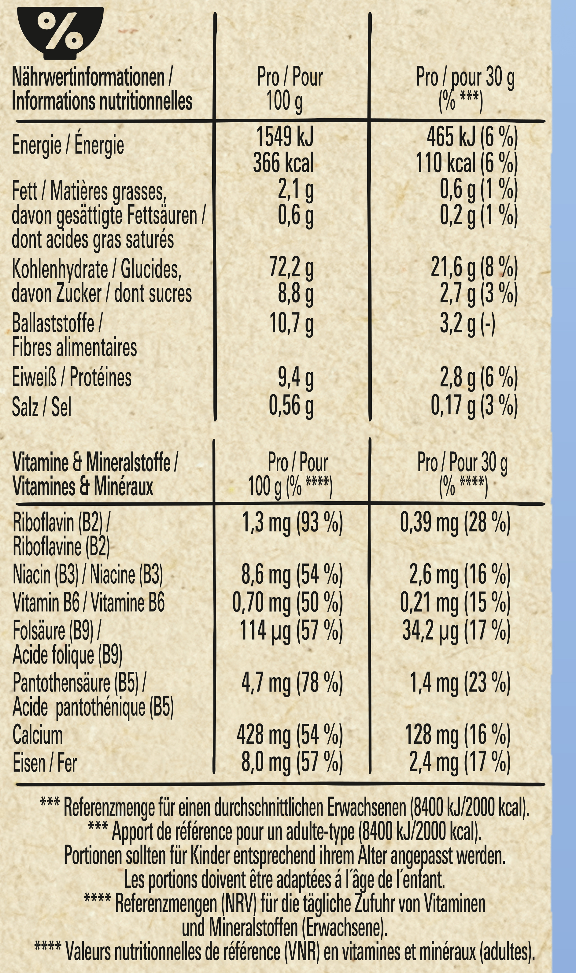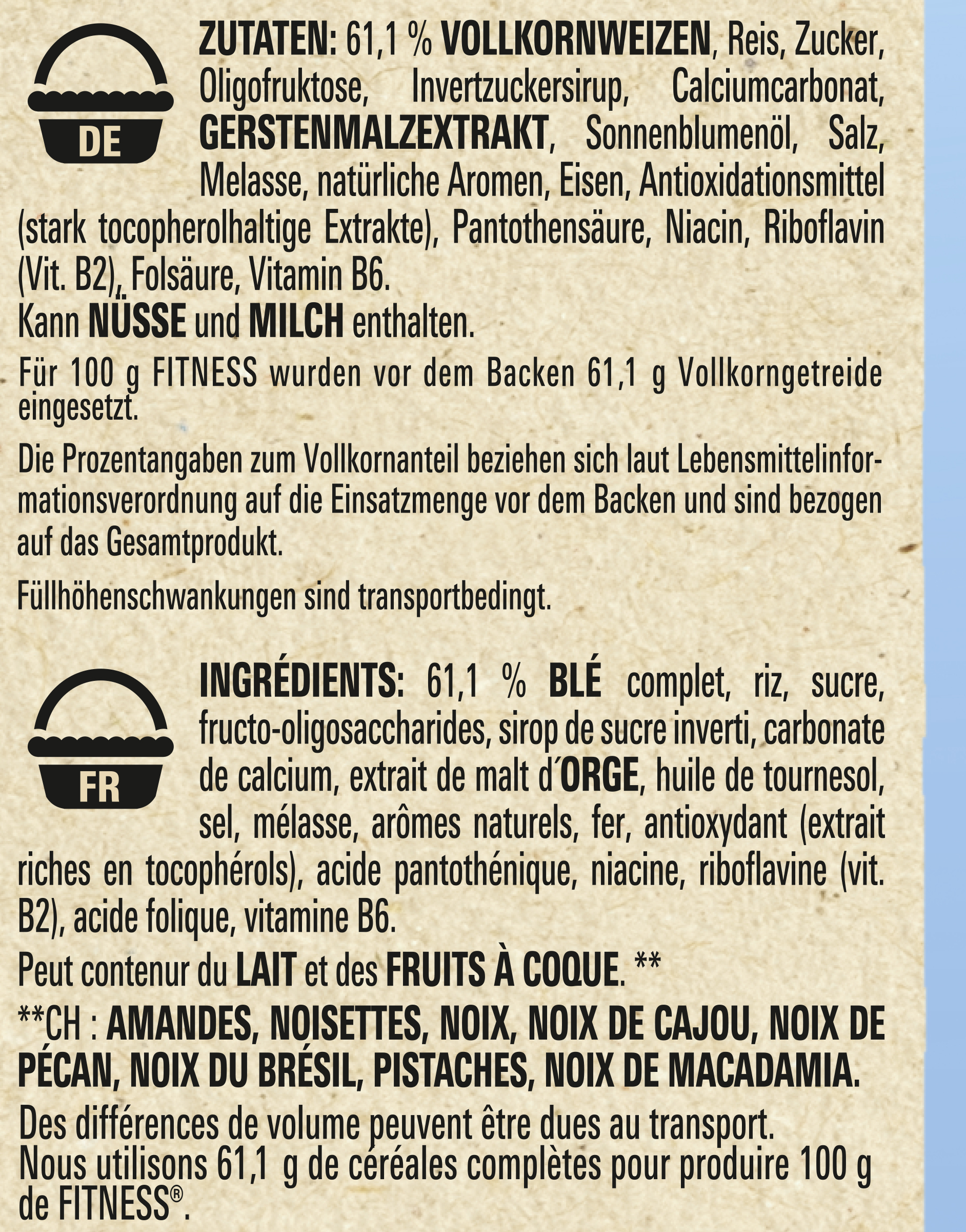 Sub Brand Name FITNESS Brand Owner Name Société des Produits Nestlé S.A. Functional Name Geröstete Getreidekost Country of Origin France Allergen Statement Vollkornweizen, Gerstenmalzextrakt Haltbarkeit & Lagerung Trocken lagern. Vor Wärme schützen. Anwendungs- & Gebrauchshinweise Portionen sollten für Kinder entsprechend ihrem Alter angepasst werden. Third Party Accreditation GREEN_DOT Nutritional Table 1 Zubereitungsgrad Bezugsgröße Portionsgröße Portionsgröße Beschreibung Tagesdosis Referenzwert Nährstoff: Teil von… Messgenauigkeit Nährwert % Messgenauigkeit % Referenzmenge UNPREPARED100GRMReferenzmengen (NRV) für die tägliche Zufuhr von Vitaminen und Mineralstoffen (Erwachsene).ENER-EnergieAPPROXIMATELY1549kJ UNPREPARED100GRMReferenzmengen (NRV) für die tägliche Zufuhr von Vitaminen und Mineralstoffen (Erwachsene).ENER-EnergieAPPROXIMATELY366kCal UNPREPARED100GRMReferenzmengen (NRV) für die tägliche Zufuhr von Vitaminen und Mineralstoffen (Erwachsene).FATFettAPPROXIMATELY2.1g UNPREPARED100GRMReferenzmengen (NRV) für die tägliche Zufuhr von Vitaminen und Mineralstoffen (Erwachsene).FASATFett, davon gesättigte FettsäurenAPPROXIMATELY0.6g UNPREPARED100GRMReferenzmengen (NRV) für die tägliche Zufuhr von Vitaminen und Mineralstoffen (Erwachsene).CHOAVLKohlenhydrateAPPROXIMATELY72.2g UNPREPARED100GRMReferenzmengen (NRV) für die tägliche Zufuhr von Vitaminen und Mineralstoffen (Erwachsene).SUGAR-Kohlenhydrate, davon ZuckerAPPROXIMATELY8.8g UNPREPARED100GRMReferenzmengen (NRV) für die tägliche Zufuhr von Vitaminen und Mineralstoffen (Erwachsene).FIBTGBallaststoffeAPPROXIMATELY10.7g UNPREPARED100GRMReferenzmengen (NRV) für die tägliche Zufuhr von Vitaminen und Mineralstoffen (Erwachsene).PRO-EiweißAPPROXIMATELY9.4g UNPREPARED100GRMReferenzmengen (NRV) für die tägliche Zufuhr von Vitaminen und Mineralstoffen (Erwachsene).SALTEQSalz ÄquivalentAPPROXIMATELY0.56g UNPREPARED100GRMReferenzmengen (NRV) für die tägliche Zufuhr von Vitaminen und Mineralstoffen (Erwachsene).RIBFVitamin B 2, RiboflavinAPPROXIMATELY1.3mg93 UNPREPARED100GRMReferenzmengen (NRV) für die tägliche Zufuhr von Vitaminen und Mineralstoffen (Erwachsene).NIANiacinAPPROXIMATELY8.6mg54 UNPREPARED100GRMReferenzmengen (NRV) für die tägliche Zufuhr von Vitaminen und Mineralstoffen (Erwachsene).VITB6-Vitamin B 6APPROXIMATELY0.70mg50 UNPREPARED100GRMReferenzmengen (NRV) für die tägliche Zufuhr von Vitaminen und Mineralstoffen (Erwachsene).FOLDFEFOLDEisenAPPROXIMATELY114μg57 UNPREPARED100GRMReferenzmengen (NRV) für die tägliche Zufuhr von Vitaminen und Mineralstoffen (Erwachsene).PANTACPantothensäureAPPROXIMATELY4.7mg78 UNPREPARED100GRMReferenzmengen (NRV) für die tägliche Zufuhr von Vitaminen und Mineralstoffen (Erwachsene).CACalciumAPPROXIMATELY428mg54 UNPREPARED100GRMReferenzmengen (NRV) für die tägliche Zufuhr von Vitaminen und Mineralstoffen (Erwachsene).FEEisenAPPROXIMATELY8.0mg57 Nutritional Table 2 Zubereitungsgrad Bezugsgröße Portionsgröße Portionsgröße Beschreibung Tagesdosis Referenzwert Nährstoff: Teil von… Messgenauigkeit Nährwert % Messgenauigkeit % Referenzmenge UNPREPARED1PTN30GRMReferenzmenge für einen durchschnittlichen Erwachsenen (8400 kJ/ 2000 kcal).#Referenzmengen (NRV) für die tägliche Zufuhr von Vitaminen und Mineralstoffen (Erwachsene).ENER-EnergieAPPROXIMATELY465kJ6 UNPREPARED1PTN30GRMReferenzmenge für einen durchschnittlichen Erwachsenen (8400 kJ/ 2000 kcal).#Referenzmengen (NRV) für die tägliche Zufuhr von Vitaminen und Mineralstoffen (Erwachsene).ENER-EnergieAPPROXIMATELY110kCal6 UNPREPARED1PTN30GRMReferenzmenge für einen durchschnittlichen Erwachsenen (8400 kJ/ 2000 kcal).#Referenzmengen (NRV) für die tägliche Zufuhr von Vitaminen und Mineralstoffen (Erwachsene).FATFettAPPROXIMATELY0.6g1 UNPREPARED1PTN30GRMReferenzmenge für einen durchschnittlichen Erwachsenen (8400 kJ/ 2000 kcal).#Referenzmengen (NRV) für die tägliche Zufuhr von Vitaminen und Mineralstoffen (Erwachsene).FASATFett, davon gesättigte FettsäurenAPPROXIMATELY0.2g1 UNPREPARED1PTN30GRMReferenzmenge für einen durchschnittlichen Erwachsenen (8400 kJ/ 2000 kcal).#Referenzmengen (NRV) für die tägliche Zufuhr von Vitaminen und Mineralstoffen (Erwachsene).CHOAVLKohlenhydrateAPPROXIMATELY21.6g8 UNPREPARED1PTN30GRMReferenzmenge für einen durchschnittlichen Erwachsenen (8400 kJ/ 2000 kcal).#Referenzmengen (NRV) für die tägliche Zufuhr von Vitaminen und Mineralstoffen (Erwachsene).SUGAR-Kohlenhydrate, davon ZuckerAPPROXIMATELY2.7g3 UNPREPARED1PTN30GRMReferenzmenge für einen durchschnittlichen Erwachsenen (8400 kJ/ 2000 kcal).#Referenzmengen (NRV) für die tägliche Zufuhr von Vitaminen und Mineralstoffen (Erwachsene).FIBTGBallaststoffeAPPROXIMATELY3.2g UNPREPARED1PTN30GRMReferenzmenge für einen durchschnittlichen Erwachsenen (8400 kJ/ 2000 kcal).#Referenzmengen (NRV) für die tägliche Zufuhr von Vitaminen und Mineralstoffen (Erwachsene).PRO-EiweißAPPROXIMATELY2.8g6 UNPREPARED1PTN30GRMReferenzmenge für einen durchschnittlichen Erwachsenen (8400 kJ/ 2000 kcal).#Referenzmengen (NRV) für die tägliche Zufuhr von Vitaminen und Mineralstoffen (Erwachsene).SALTEQSalz ÄquivalentAPPROXIMATELY0.17g3 UNPREPARED1PTN30GRMReferenzmenge für einen durchschnittlichen Erwachsenen (8400 kJ/ 2000 kcal).#Referenzmengen (NRV) für die tägliche Zufuhr von Vitaminen und Mineralstoffen (Erwachsene).RIBFVitamin B 2, RiboflavinAPPROXIMATELY0.39mg28 UNPREPARED1PTN30GRMReferenzmenge für einen durchschnittlichen Erwachsenen (8400 kJ/ 2000 kcal).#Referenzmengen (NRV) für die tägliche Zufuhr von Vitaminen und Mineralstoffen (Erwachsene).NIANiacinAPPROXIMATELY2.6mg16 UNPREPARED1PTN30GRMReferenzmenge für einen durchschnittlichen Erwachsenen (8400 kJ/ 2000 kcal).#Referenzmengen (NRV) für die tägliche Zufuhr von Vitaminen und Mineralstoffen (Erwachsene).VITB6-Vitamin B 6APPROXIMATELY0.21mg15 UNPREPARED1PTN30GRMReferenzmenge für einen durchschnittlichen Erwachsenen (8400 kJ/ 2000 kcal).#Referenz