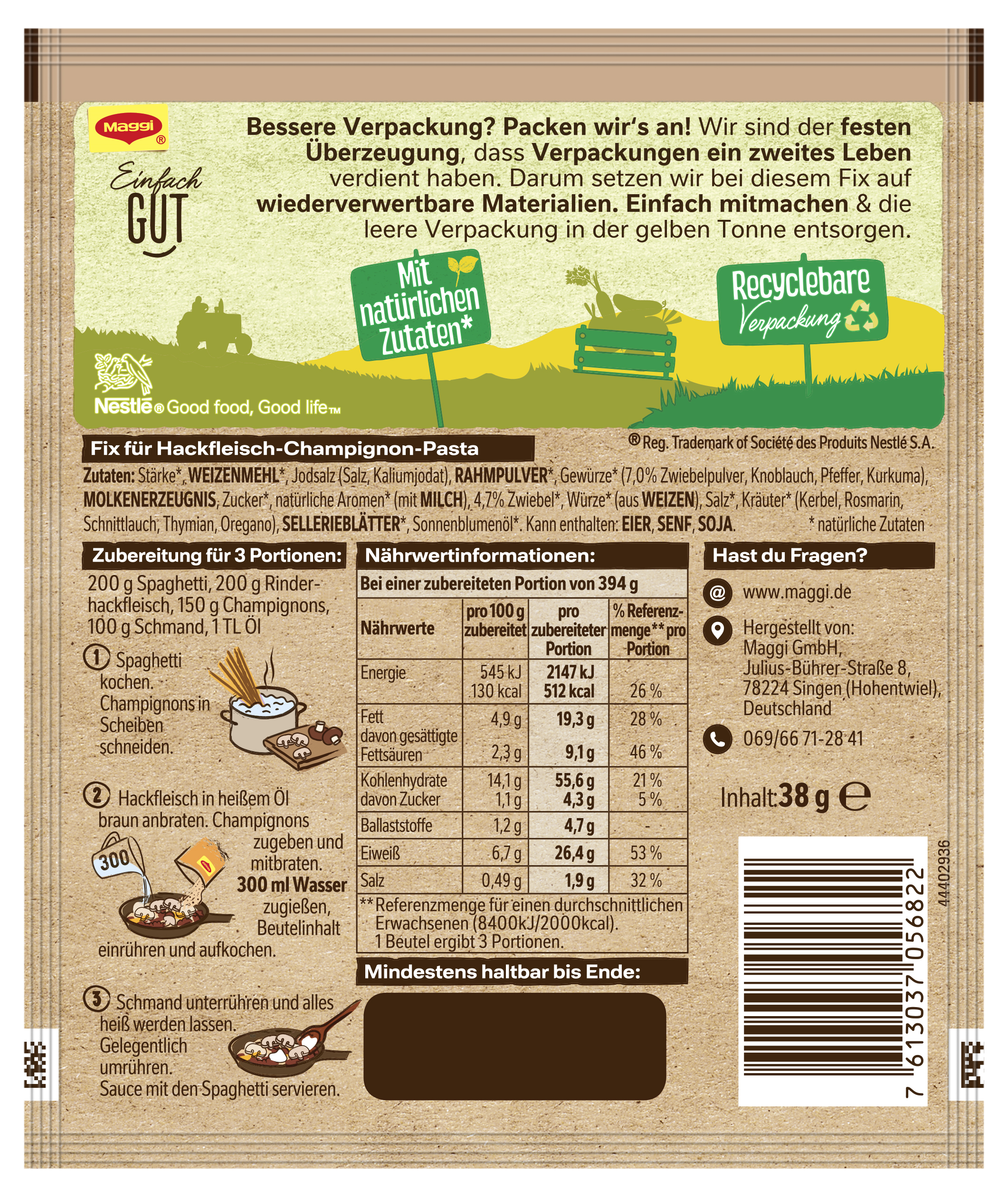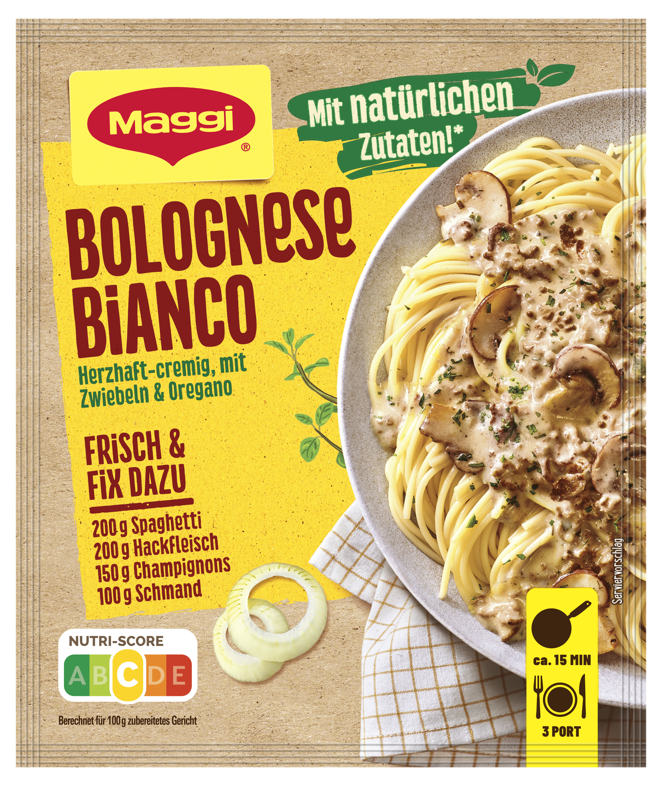 myTime Assortment Yes myTime Article Number 4502073162 myTime Product Title Maggi Fix Bolognese Bianco EAN 07613037056822 Material Number 12406281 Marke MAGGI Product Name MAGGI FIX Bolognese Bianco 38g Net Content 38 Net Content UoM GRM Net Weight 38 Net Weight UoM GRM Artikel Höhe 150.000 Artikel Höhe UoM MMT Artikel Breite 127.000 Artikel Breite UoM MMT Artikel Länge 9.000 Artikel Länge UoM MMT Schlagwörter bolognese, spaghetti bolognese, bolognese sauce, pasta sauce, nudelsauce, champignonsauce, hackfleischsauce, pilzsauce, italienische bolognese, schnelle bolognese, pasta bolognese, gemüse bolognese, pastagericht Bezeichnung Fix für Hackfleisch-Champignon-Pasta Beschreibung MAGGI Fix für Bolognese Bianco • Cremig-würzige Sauce mit Kräutern verfeinert und frischen Pilzen für einen authentischen Geschmack • Ein Beutel ist ausreichend für 3 herzhafte Hackfleisch-Champignon-Pasta Portionen MAGGI bringt frischen Pepp auf den Pasta-Teller Probiere das Lieblings-Pastagericht der Deutschen mal anders. Die Bolognese Bianco bietet eine frische Variante zur klassischen Bolognese und begeistert die ganze Familie. Mit nur wenigen frischen Zutaten kannst du in kurzer Zeit ein herzhaftes Gericht kreieren. Die cremig würzige Sauce mit Pilzen und feinen Kräutern sorgt für einen authentischen Geschmack. Leckere Nudelsauce im Handumdrehen: Spaghetti in leicht gesalzenem Wasser kochen. Nebenher die Champignons in Scheiben schneiden und das Hackfleisch in heißem Öl braun anbraten. Die Champignons dazugeben und kurz mitbraten. Anschließend 300ml Wasser zugießen, den Beutelinhalt einrühren und aufkochen. Als finaler Schritt den Schmand unterrühren und alles heiß werden lassen. Et voilà, schon ist die gut abgeschmeckte Pasta-Sauce servierfertig. Dieses Produkt hat den Nutri-Score C. Zubereitung Zubereitung für 3 Portionen: 200 g Spaghetti, 200 g Rinderhackfleisch, 150 g Champignons, 100 g Schmand, 1 TL Öl 1. Spaghetti kochen. Champignons in Scheiben schneiden. 2. Hackfleisch in heißem Öl braun anbraten. Champignons zugeben und mitbraten. 300 ml Wasser zugießen, Beutelinhalt einrühren und aufkochen. 3. Schmand unterrühren und alles heiß werden lassen. Gelegentlich umrühren. Sauce mit den Spaghetti servieren. Zutaten Zutaten: Stärke*, WEIZENMEHL*, Jodsalz (Salz, Kaliumjodat), RAHMPULVER*, Gewürze* (7,0% Zwiebelpulver, Knoblauch, Pfeffer, Kurkuma), MOLKENERZEUGNIS, Zucker*, natürliche Aromen* (mit MILCH), 4,7% Zwiebel*, Würze* (aus WEIZEN), Salz*, Kräuter* (Kerbel, Rosmarin, Schnittlauch, Thymian, Oregano), SELLERIEBLÄTTER*, Sonnenblumenöl*. Kann enthalten: EIER, SENF, SOJA. *natürliche Zutaten