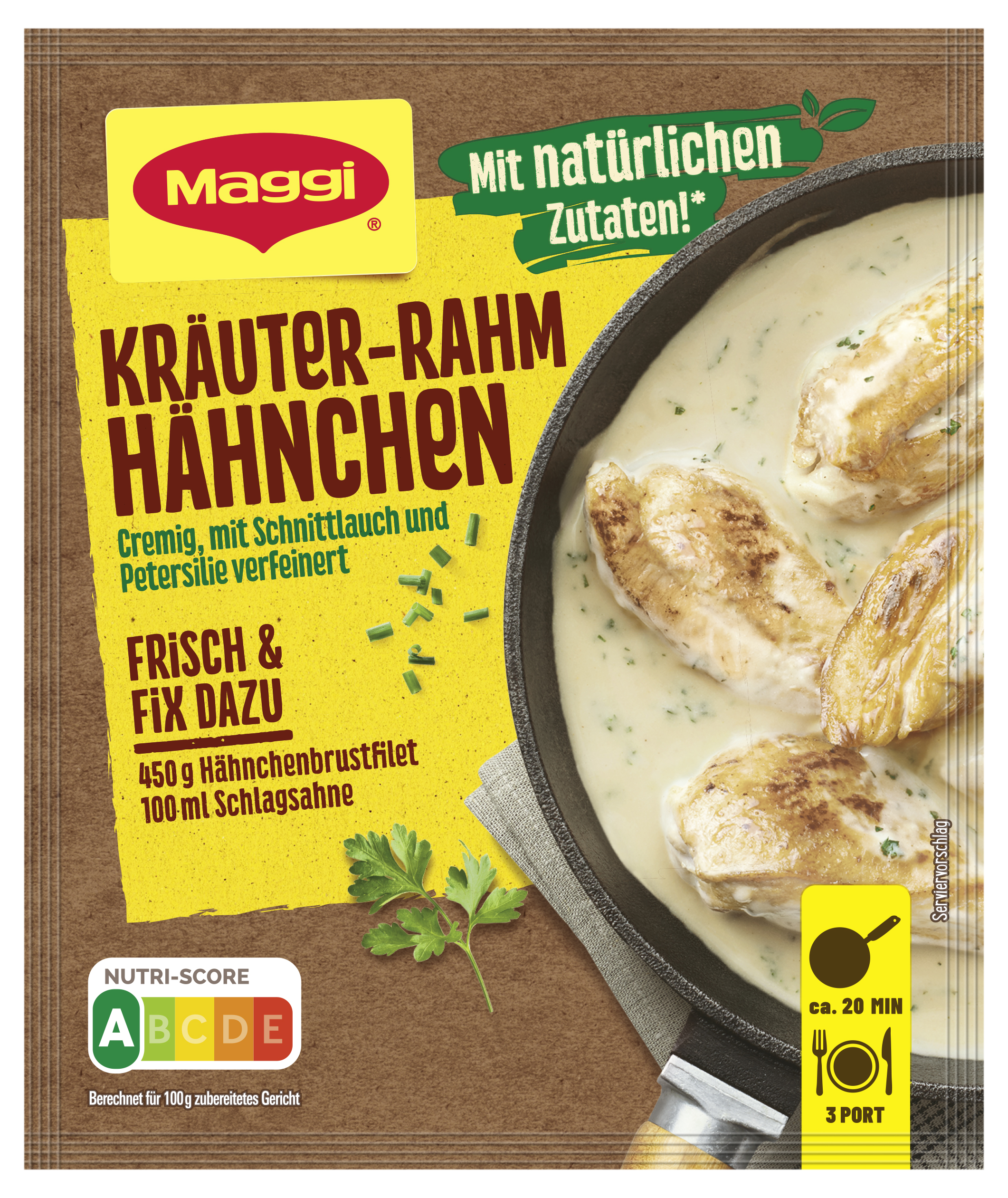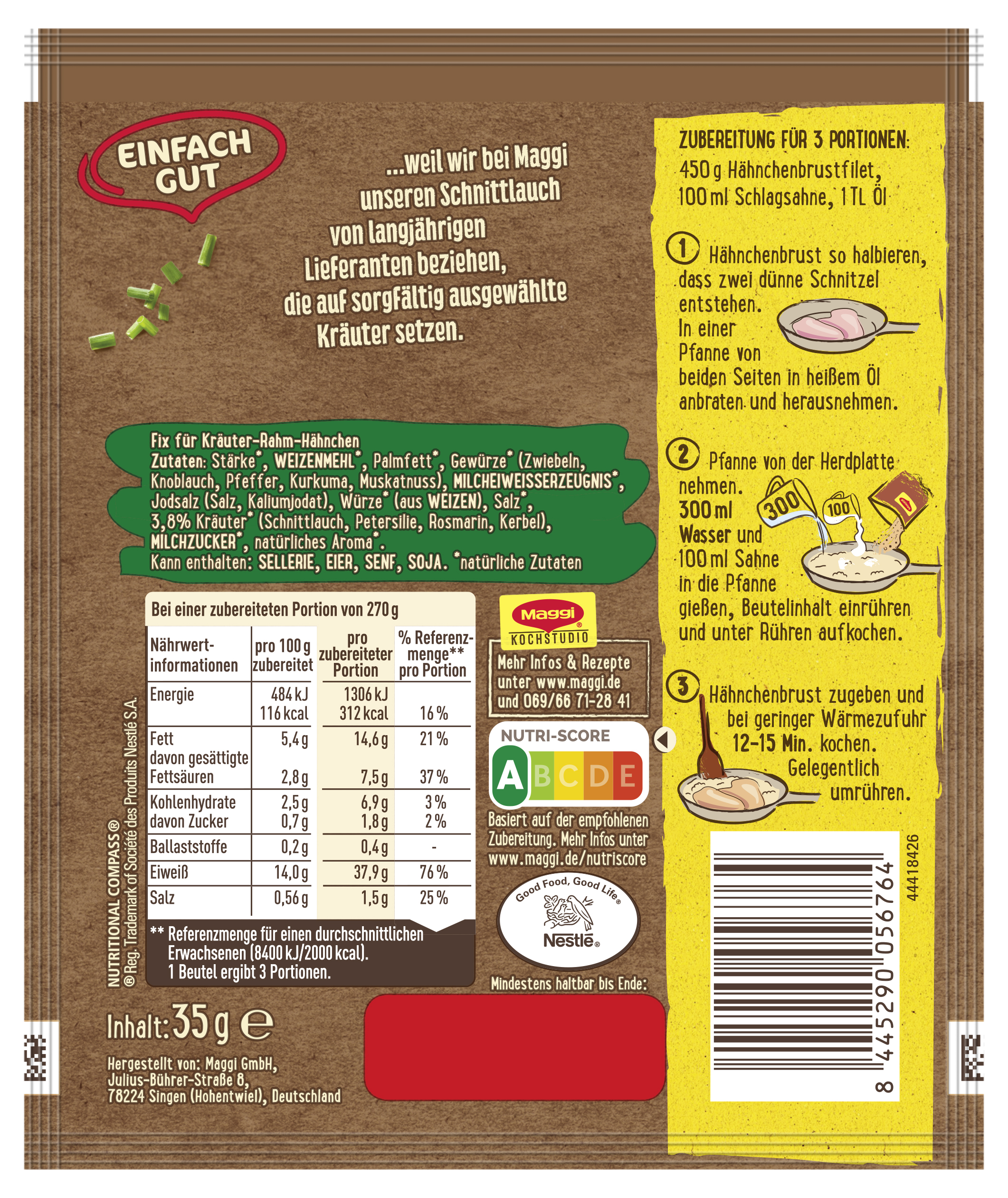 myTime Assortment Yes myTime Article Number 4502072076 myTime Product Title Maggi Fix Kräuter Rahm Hähnchen EAN 08445290056764 Material Number 12507838 Marke MAGGI Product Name MAGGI FIX Kräuter Rahm Hähnchen 35g Net Content 35.000 Net Content UoM GRM Net Weight 35 Net Weight UoM GRM Artikel Höhe 150.000 Artikel Höhe UoM MMT Artikel Breite 127.000 Artikel Breite UoM MMT Artikel Länge 9.000 Artikel Länge UoM MMT Schlagwörter Fertigsauce, schnelle soße, fertig sauce, fertig-soße, instant-soße, tüte, beutel, fix-und-frisch, natürlich, verfeinern, Thermomix, Fix, Pfanne, Rahm, Hühnchen, Hähnchenbrust, Pute Bezeichnung Fix für Kräuter-Rahm-Hähnchen Beschreibung Wenn es in der Küche herrlich duftet, freut sich die Familie auf Hähnchen in Rahmsauce. Mit MAGGI Fix für Kräuter-Rahm Hähnchen gelingt schnell eine cremige Kräutersauce mit Schnittlauch und Petersilie, abgeschmeckt mit Zwiebeln, Knoblauch, Pfeffer und Kurkuma. Cremiges Kräuter-Rahm Hähnchen in Rahmsauce Saftiges Hähnchen in cremiger Kräuter-Rahmsauce? Mit MAGGI Fix für Kräuter-Rahm Hähnchen gar kein Problem! Gelingt garantiert dank genauer Zubereitungsanleitung. Und so einfach geht's: Die Hähnchenbrust so zerteilen, dass drei dünne Schnitzel a 150g entstehen. In einer Pfanne von beiden Seiten in heißem Öl anbraten und herausnehmen. Die Pfanne von der Herdplatte nehmen. 300ml Wasser und 100ml Sahne eingießen, Beutelinhalt einrühren und unter Rühren aufkochen. Die Hähnchenschnitzel hinzugeben und bei geringer Wärmezufuhr 12 bis 15 Minuten kochen lassen. Gelegentlich umrühren. Dieses Produkt hat den Nutri-Score A. Der Nutri-Score wird von den französischen Gesundheitsbehörden berechnet und bewertet den Energiegehalt sowie weniger positive und positive Inhaltsstoffe. Diese Bewertung hilft dir, das Nährwertprofil deiner Lieblingsprodukte auf einen Blick zu erkennen. Die Skala reicht von dunkelgrünem A günstiger bis rotem E weniger günstig. Genieße leckere und einfache Gerichte, die schnell im Alltag zubereitet sind, dank MAGGI! Zubereitung Zubereitung für 3 Portionen: 450 g Hähnchenbrustfilet, 100 ml Schlagsahne, 1 TL Öl 1. Hähnchenbrust so halbieren, dass zwei dünne Schnitzel entstehen. In einer Pfanne von beiden Seiten in heißem Öl anbraten und herausnehmen. 2. Pfanne von der Herdplatte nehmen. 300 ml Wasser und 100 ml Sahne in die Pfanne gießen, Beutelinhalt einrühren und unter Rühren aufkochen. 3. Hähnchenbrust zugeben und bei geringer Wärmezufuhr 12-15 Min. kochen. Gelegentlich umrühren. Zutaten Zutaten: Stärke*, WEIZENMEHL*, Palmfett*, Gewürze* (Zwiebeln, Knoblauch, Pfeffer, Kurkuma, Muskatnuss), MILCHEIWEISSERZEUGNIS*, Jodsalz (Salz, Kaliumjodat), Würze* (aus WEIZEN), Salz*, 3,8% Kräuter* (Schnittlauch, Petersilie, Rosmarin, Kerbel), MILCHZUCKER*, natürliches Aroma*.